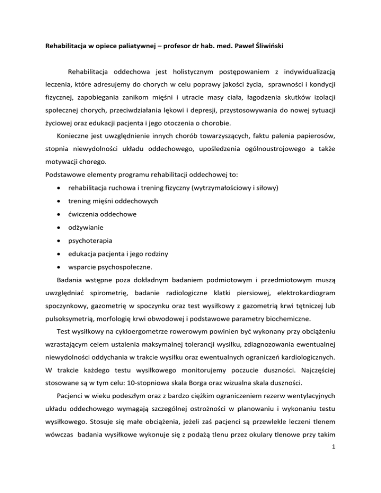 Rehabilitacja w opiece paliatywnej – profesor dr hab. med. Paweł Śliwiński Rehabilitacja oddechowa jest holistycznym postępowaniem z indywidualizacją leczenia, które adresujemy do chorych w celu poprawy jakości życia, sprawności i kondycji fizycznej, zapobiegania zanikom mięśni i utracie masy ciała, łagodzenia skutków izolacji społecznej chorych, przeciwdziałania lękowi i depresji, przystosowywania do nowej sytuacji życiowej oraz edukacji pacjenta i jego otoczenia o chorobie. Konieczne jest uwzględnienie innych chorób towarzyszących, faktu palenia papierosów, stopnia niewydolności układu oddechowego, upośledzenia ogólnoustrojowego a także motywacji chorego. Podstawowe elementy programu rehabilitacji oddechowej to: rehabilitacja ruchowa i trening fizyczny (wytrzymałościowy i siłowy) trening mięśni oddechowych ćwiczenia oddechowe odżywianie psychoterapia edukacja pacjenta i jego rodziny wsparcie psychospołeczne. Badania wstępne poza dokładnym badaniem podmiotowym i przedmiotowym muszą uwzględniać spirometrię, badanie radiologiczne klatki piersiowej, elektrokardiogram spoczynkowy, gazometrię w spoczynku oraz test wysiłkowy z gazometrią krwi tętniczej lub pulsoksymetrią, morfologię krwi obwodowej i podstawowe parametry biochemiczne. Test wysiłkowy na cykloergometrze rowerowym powinien być wykonany przy obciążeniu wzrastającym celem ustalenia maksymalnej tolerancji wysiłku, zdiagnozowania ewentualnej niewydolności oddychania w trakcie wysiłku oraz ewentualnych ograniczeń kardiologicznych. W trakcie każdego testu wysiłkowego monitorujemy poczucie duszności. Najczęściej stosowane są w tym celu: 10-stopniowa skala Borga oraz wizualna skala duszności. Pacjenci w wieku podeszłym oraz z bardzo ciężkim ograniczeniem rezerw wentylacyjnych układu oddechowego wymagają szczególnej ostrożności w planowaniu i wykonaniu testu wysiłkowego. Stosuje się małe obciążenia, jeżeli zaś pacjenci są przewlekle leczeni tlenem wówczas badania wysiłkowe wykonuje się z podażą tlenu przez okulary tlenowe przy takim 1 przepływie jak w spoczynku lub o 1 litr/minutę większym (jeśli możliwe jest dokładne podawanie mieszanki oddechowej z mieszalnika - zaleca się FiO2 ok. 30-36%). Trening w ramach rehabilitacji oddechowej składa się z treningu wytrzymałościowego różnych grup mięśniowych oraz - w mniejszym stopniu - z treningu siłowowego (oporowego). Główną zaletą treningu wytrzymałościowego (cykloergometr nożny i ręczny, bieżnia) jest poprawa wytrzymałości i korzystne zmiany w mięśniach na poziomie tkankowym (zwiększenie sieci włośniczek), komórkowym (poprawa innerwacji) oraz subkomórkowym (zwiększenie stężenia enzymów oksydacyjnych). Istotą treningu jest częste i długotrwałe powtarzanie ćwiczeń o małym natężeniu co kilka sesji stopniowo wydłużanych w czasie i o zwiększanym natężeniu. Na trening siłowy składają się ćwiczenia wykonywane na kolumnach, atlasach, fotelach do ćwiczeń oporowych. Trening siłowy skutkuje hipertrofią mięśnia i przyrostem jego masy, ale nie ma tak dużego przełożenia na funkcjonowanie pacjenta jak trening wytrzymałościowy. Szczególną uwagę należy jednak zwrócić na ćwiczenia mięśni obręczy barkowej gdyż tworzą one główną masę dodatkowych mięśni oddechowych. Ćwiczenia na cykloergometrze ręcznym poprawiając wytrzymałość mięśni obręczy barkowej zmniejszają dynamiczne rozdęcie płuc oraz odczuwaną duszność. Trening mięśni oddechowych (głównie wdechowych) u pacjentów z wyjściowo niskimi maksymalnymi ciśnieniami wdechowymi (PImax) wzmaga efekty klasycznego treningu oddechowego. Stosuje się 3 rodzaje ćwiczeń: a) trening oporowy mięśni wdechowych, b) obciążenie progowe, c) hiperwentylacja normokapniczna. Żadna z technik nie ma istotnej przewagi nad pozostałymi jednak wydaje się, iż u chorych na POChP hiperwentylacja normokapniczna jest najskuteczniejsza. Poza typowymi ćwiczeniami istotną rolę pełni nauka właściwego oddychania. Oddech przez zasznurowane usta, nauka aktywnego wydechu, oddychanie torem przeponowym, właściwa pozycja ciała, nauka oddychania skoordynowanego z wysiłkiem mają na celu poprawę wentylacji regionalnej w płucach a zatem lepszą wymianę gazową oraz czynność mięśni oddechowych, mniejszą duszność, większą tolerancję wysiłku oraz wyższą jakość 2 życia. Oddech przez zasznurowane usta zmniejsza częstość oddechów, poczucie duszności, PaCO2, poprawia objętość oddechową i utlenowanie krwi w spoczynku. Nie ma szczególnych zaleceń dla bardzo ciężko (terminalnie) chorych. Proponuje się korzystanie z tych samych programów dostosowanych do ich możliwości. Najlepsze efekty obserwuje się w nadzorowanych długotrwałych (ok. 40 sesji) programach rehabilitacyjnych o dużym natężeniu ćwiczeń. Zakładając ciągłość treningu przez 5 dni w tygodniu program taki może być zrealizowany przez 8 tygodni. Dla pacjentów w ciężkim stanie ogólnym jest to natężenie często nieakceptowane. Z tego względu częściej proponuje się sesje rehabilitacyjne rozłożone na 12 tygodni. W ośrodku stacjonarnym można stosować trening jeden raz dziennie o dużym natężeniu lub do trzech sesji o małym natężeniu. W przypadku programu ambulatoryjnego najlepsze efekty przynosi zastosowanie stałego dozoru wykonywanych ćwiczeń. Chociaż najlepsze efekty rehabilitacji oddechowej obserwuje się u pacjentów o łagodnym lub umiarkowanym zaawansowaniu choroby to chorzy z bardzo ciężkimi zaburzeniami wentylacyjnymi także odnoszą wymierne korzyści. Ta grupa pacjentów z uwagi na częstą zależność od osób drugich lub trzecich mogą mieć ograniczone możliwości udziału w regularnych (najczęściej 3 razy w tygodniu) zajęciach w trybie ambulatoryjnym. W takim przypadku należy rozważyć pobyt rehabilitacyjny w ośrodku sanatoryjnym lub szpitalu, gdzie chory uzys