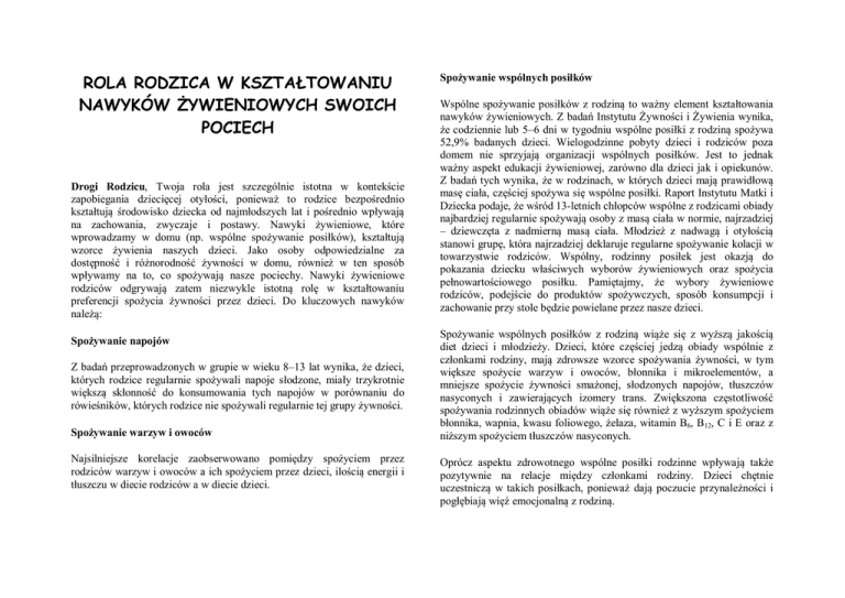 ROLA RODZICA W KSZTAŁTOWANIU NAWYKÓW ŻYWIENIOWYCH SWOICH POCIECH Drogi Rodzicu, Twoja rola jest szczególnie istotna w kontekście zapobiegania dziecięcej otyłości, ponieważ to rodzice bezpośrednio kształtują środowisko dziecka od najmłodszych lat i pośrednio wpływają na zachowania, zwyczaje i postawy. Nawyki żywieniowe, które wprowadzamy w domu (np. wspólne spożywanie posiłków), kształtują wzorce żywienia naszych dzieci. Jako osoby odpowiedzialne za dostępność i różnorodność żywności w domu, również w ten sposób wpływamy na to, co spożywają nasze pociechy. Nawyki żywieniowe rodziców odgrywają zatem niezwykle istotną rolę w kształtowaniu preferencji spożycia żywności przez dzieci. Do kluczowych nawyków należą: Spożywanie napojów Z badań przeprowadzonych w grupie w wieku 8–13 lat wynika, że dzieci, których rodzice regularnie spożywali napoje słodzone, miały trzykrotnie większą skłonność do konsumowania tych napojów w porównaniu do rówieśników, których rodzice nie spożywali regularnie tej grupy żywności. Spożywanie warzyw i owoców Najsilniejsze korelacje zaobserwowano pomiędzy spożyciem przez rodziców warzyw i owoców a ich spożyciem przez dzieci, ilością energii i tłuszczu w diecie rodziców a w diecie dzieci. Spożywanie wspólnych posiłków Wspólne spożywanie posiłków z rodziną to ważny element kształtowania nawyków żywieniowych. Z badań Instytutu Żywności i Żywienia wynika, że codziennie lub 5–6 dni w tygodniu wspólne posiłki z rodziną spożywa 52,9% badanych dzieci. Wielogodzinne pobyty dzieci i rodziców poza domem nie sprzyjają organizacji wspólnych posiłków. Jest to jednak ważny aspekt edukacji żywieniowej, zarówno dla dzieci jak i opiekunów. Z badań tych wynika, że w rodzinach, w których dzieci mają prawidłową masę ciała, częściej spożywa się wspólne posiłki. Raport Instytutu Matki i Dziecka podaje, że wśród 13-letnich chłopców wspólne z rodzicami obiady najbardziej regularnie spożywają osoby z masą ciała w normie, najrzadziej – dziewczęta z nadmierną masą ciała. Młodzież z nadwagą i otyłością stanowi grupę, która najrzadziej deklaruje regularne spożywanie kolacji w towarzystwie rodziców. Wspólny, rodzinny posiłek jest okazją do pokazania dziecku właściwych wyborów żywieniowych oraz spożycia pełnowartościowego posiłku. Pamiętajmy, że wybory żywieniowe rodziców, podejście do produktów spożywczych, sposób konsumpcji i zachowanie przy stole będzie powielane przez nasze dzieci. Spożywanie wspólnych posiłków z rodziną wiąże się z wyższą jakością diet dzieci i młodzieży. Dzieci, które częściej jedzą obiady wspólnie z członkami rodziny, mają zdrowsze wzorce spożywania żywności, w tym większe spożycie warzyw i owoców, błonnika i mikroelementów, a mniejsze spożycie żywności smażonej, słodzonych napojów, tłuszczów nasyconych i zawierających izomery trans. Zwiększona częstotliwość spożywania rodzinnych obiadów wiąże się również z wyższym spożyciem błonnika, wapnia, kwasu foliowego, żelaza, witamin B6, B12, C i E oraz z niższym spożyciem tłuszczów nasyconych. Oprócz aspektu zdrowotnego wspólne posiłki rodzinne wpływają także pozytywnie na relacje między członkami rodziny. Dzieci chętnie uczestniczą w takich posiłkach, ponieważ dają poczucie przynależności i pogłębiają więź emocjonalną z rodziną. AKTYWNOŚĆ FIZYCZNA W WIEKU PRZEDSZKOLNYM Wiek przedszkolny to właściwy czas, by kształtować dobre nawyki zdrowotne. Kilkuletnie dzieci najczęściej bardzo chętnie biegają, skaczą i uczestniczą w różnorodnych zabawach ruchowych. Naturalną, charakterystyczną dla wieku przedszkolnego, potrzebę aktywności fizycznej nazywa się niekiedy „głodem ruchu”. Zarówno rodzice, jak i wychowawcy mają niepowtarzalną okazję wykorzystać czteroletni okres pobytu dziecka w przedszkolu do zainteresowania go różnymi formami rekreacji ruchowej. Dla tego etapu życia najkorzystniejsza jest aktywność fizyczna powtarzana kilkukrotnie w ciągu dnia oraz trwająca jednorazowo kilkanaście minut. Małe dziecko na ogół nie potrzebuje do niej specjalnej zachęty. W takiej sytuacji rolą opiekuna jest zadbanie o stworzenie właściwych dla podejmowanej aktywności warunków, uwzględniających przede wszystkim bezpieczeństwo, wszechstronność i zabawowy charakter. Aktywność fizyczna w przedszkolu W czasie pobytu dziecka w przedszkolu istnieje wiele okazji do podejmowania aktywności fizycznej. Zorganizowane zajęcia prowadzą wychowawczynie przedszkolne w ramach tzw. podstawy programowej. Uzupełnienie stanowi spontaniczna aktywność dziecka podczas swobodnej zabawy w sali lub w ogrodzie przedszkolnym. Szczególne walory posiadają formy ruchu podejmowane na świeżym powietrzu. Szeroka jest również oferta dodatkowych zajęć dydaktycznych, jak: umuzykalnianie, gimnastyka kompensacyjno-korekcyjna, nauka tańca, języka obcego i inne, które w przeważającym stopniu mają charakter ruchowy. Aktywność fizyczna w domu Dziecko pięcioletnie wkracza w tzw. złoty okres dzieciństwa. Zewnętrznym przejawem tego etapu życia jest znaczny postęp w sprawności fizycznej. Dzieci w tym wieku nierzadko potrafią już jeździć na rowerze dwukołowym i hulajnodze oraz mogą stawiać pierwsze kroki narciarskie i łyżwiarskie. Warto również zapisać je na naukę pływania. Drogi Rodzicu, zadbaj o poza przedszkolną aktywność ruchową swojego dziecka i nabywanie przez niego nowych, przydatnych i wartościowych w dalszym życiu umiejętności. JAK ZACHĘCAĆ MAŁE DZIECI DO PRÓBOWANIA NOWYCH PRODUKTÓW? Edukację żywieniową najlepiej rozpocząć od najmłodszych lat. Już we wczesnym dzieciństwie kształtują się nawyki żywieniowe, jak np. upodobanie do smaku słodkiego czy słonego. 3. WSPIERAĆ, OGRANICZAJĄC PRESJĘ Warto pamiętać, by nie wywie