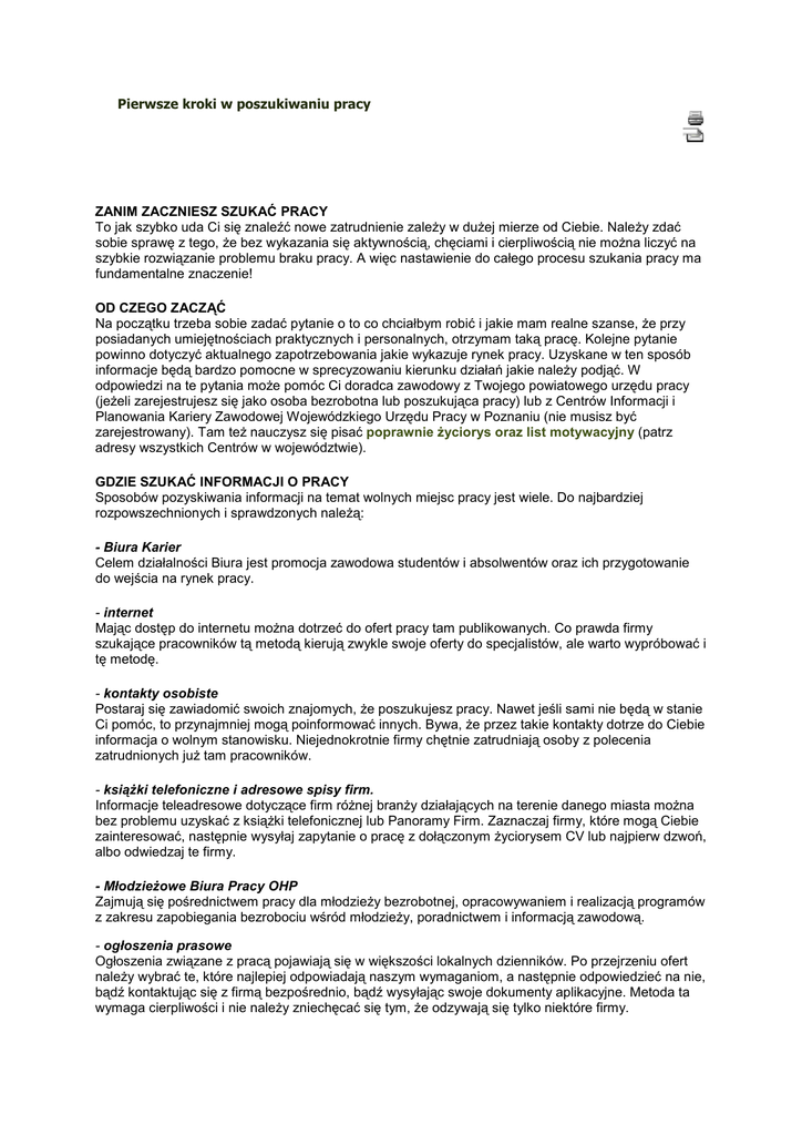 Pierwsze kroki w poszukiwaniu pracy ZANIM ZACZNIESZ SZUKAĆ PRACY To jak szybko uda Ci się znaleźć nowe zatrudnienie zaleŜy w duŜej mierze od Ciebie. NaleŜy zdać sobie sprawę z tego, Ŝe bez wykazania się aktywnością, chęciami i cierpliwością nie moŜna liczyć na szybkie rozwiązanie problemu braku pracy. A więc nastawienie do całego procesu szukania pracy ma fundamentalne znaczenie! OD CZEGO ZACZĄĆ Na początku trzeba sobie zadać pytanie o to co chciałbym robić i jakie mam realne szanse, Ŝe przy posiadanych umiejętnościach praktycznych i personalnych, otrzymam taką pracę. Kolejne pytanie powinno dotyczyć aktualnego zapotrzebowania jakie wykazuje rynek pracy. Uzyskane w ten sposób informacje będą bardzo pomocne w sprecyzowaniu kierunku działań jakie naleŜy podjąć. W odpowiedzi na te pytania moŜe pomóc Ci doradca zawodowy z Twojego powiatowego urzędu pracy (jeŜeli zarejestrujesz się jako osoba bezrobotna lub poszukująca pracy) lub z Centrów Informacji i Planowania Kariery Zawodowej Wojewódzkiego Urzędu Pracy w Poznaniu (nie musisz być zarejestrowany). Tam teŜ nauczysz się pisać poprawnie Ŝyciorys oraz list motywacyjny (patrz adresy wszystkich Centrów w województwie). GDZIE SZUKAĆ INFORMACJI O PRACY Sposobów pozyskiwania informacji na temat wolnych miejsc pracy jest wiele. Do najbardziej rozpowszechnionych i sprawdzonych naleŜą: - Biura Karier Celem działalności Biura jest promocja zawodowa studentów i absolwentów oraz ich przygotowanie do wejścia na rynek pracy. - internet Mając dostęp do internetu moŜna dotrzeć do ofert pracy tam publikowanych. Co prawda firmy szukające pracowników tą metodą kierują zwykle swoje oferty do specjalistów, ale warto wypróbować i tę metodę. - kontakty osobiste Postaraj się zawiadomić swoich znajomych, Ŝe poszukujesz pracy. Nawet jeśli sami nie będą w stanie Ci pomóc, to przynajmniej mogą poinformować innych. Bywa, Ŝe przez takie kontakty dotrze do Ciebie informacja o wolnym stanowisku. Niejednokrotnie firmy chętnie zatrudniają osoby z polecenia zatrudnionych juŜ tam pracowników. - ksiąŜki telefoniczne i adresowe spisy firm. Informacje teleadresowe dotyczące firm róŜnej branŜy działających na terenie danego miasta moŜna bez problemu uzyskać z ksiąŜki telefonicznej lub Panoramy Firm. Zaznaczaj firmy, które mogą Ciebie zainteresować, następnie wysyłaj zapytanie o pracę z dołączonym Ŝyciorysem CV lub najpierw dzwoń, albo odwiedzaj te firmy. - MłodzieŜowe Biura Pracy OHP Zajmują się pośrednictwem pracy dla młodzieŜy bezrobotnej, opracowywaniem i realizacją programów z zakresu zapobiegania bezrobociu wśród młodzieŜy, poradnictwem i informacją zawodową. - ogłoszenia prasowe Ogłoszenia związane z pracą pojawiają się w większości lokalnych dzienników. Po przejrzeniu ofert naleŜy wybrać te, które najlepiej odpowiadają naszym wymaganiom, a następnie odpowiedzieć na nie, bądź kontaktując się z firmą bezpośrednio, bądź wysyłając swoje dokumenty aplikacyjne. Metoda ta wymaga cierpliwości i nie naleŜy zniechęcać się tym, Ŝe odzywają się tylko niektóre firmy. - prywatne biura i agencje pośrednictwa pracy Obecnie działa wiele prywatnych agencji pośrednictwa pracy. MoŜna zgłosić się do nich i umieścić informację o własnej osobie w ich bazie danych. W przypadku, gdy zgłasza się do takiej agencji pracodawca z konkretnym zapotrzebowaniem, agencja przegląda oferty, wybierając te najlepiej odpowiadające wymaganiom. - urzędy pracy Skorzystaj z pomocy oferowanej przez urzędy pracy zarówno powiatowe jak i wojewódzki. W pierwszym przypadku, oprócz rejestracji jako osoba bezrobotna, moŜesz skorzystać z ofert pracy wywieszonych na tablicy ogłoszeń i pomocy doradczej. Informacje o wolnych miejscach pracy oraz poradnictwo zawodowe oferuje równieŜ wojewódzki urząd pracy. Nie zniechęcaj się niskimi stawkami podanymi w ofertach. Najczęściej po pewnym czasie dobrej pracy ulegają zmianie na lepsze. - własna oferta Powinny w niej znaleźć się konkretne informacje o tym kto i jakiej oferty szuka oraz jak moŜna się z nim skontaktować. - wolontariat Wolontariuszem moŜe być kaŜdy, w kaŜdej dziedzinie Ŝycia społecznego, wszędzie tam gdzie taka pomoc jest potrzebna; ofiarowując pomoc innym zdobywasz cenne doświadczenie, które jest mile widziane przez potencjalnych pracodawców. Są to jedynie propozycje. Tak naprawdę kaŜdy sposób, który przyniesie poŜądany efekt jest dobry. DZIAŁALNOŚĆ NA WŁASNY RACHUNEK ZałoŜenie własnej działalności gospodarczej moŜe być dobrym sposobem na rozwiązanie problemu braku pracy. NaleŜy jednak pamiętać, Ŝe taka działalność obarczona jest pewnym ryzykiem. Dlatego przed jej podjęciem naleŜy dokładnie przemyśleć charakter tej działalności i moŜliwości finansowe związane z jej uruchomieniem. Informacji jakie formalności muszą być dokonane aby załoŜyć własną firmę udzielają róŜnego typu instytucje wspierające małą i średnią przedsiębiorczość m.in. Poznański Ośrodek Wspierania Przedsiębiorczości (patrz wykaz instytucji wspierających przedsiębiorczość na terenie województwa ). REJESTRACJA W POWIATOWYM URZĘDZIE PRACY Wszelkich informacji dotyczących tego, kto moŜe zarejestrować się jako osoba bezrobotna, jak się zarejestrować, jakie warunki trzeba spełnić aby otrzymać zasiłek, jaka jest wysokość zasiłku i wiele innych, udzielają powiatowe urzędy pracy działające na terenie kaŜdego miasta powiatowego. W Poznaniu Powiatowy Urząd Pracy mieści się przy ul. Czarnieckiego 9, tel. 833-33-21. Szczegółowych informacji na temat zasad funkcjonowania urzędu, zakresu świadczonych usług oraz ustawy o zatrudnieniu i przeciwdziałaniu bezrobociu udziela Punkt Informacyjny, znajdujący się w holu A (tel. wew. 347). Pomocy moŜna szukać takŜe na stronie internetowej. www.pup.poznan.pl POMOC OFEROWANA