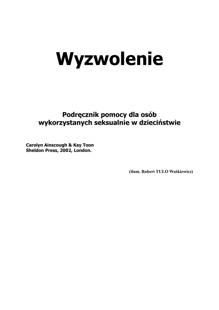 Wyzwolenie Podr cznik pomocy dla osób wykorzystanych seksualnie w dzieci stwie Carolyn Ainscough & Kay Toon Sheldon Press, 2002, London. (tøum. Robert TULO Wa kiewicz) CZ PIERWSZA: wykorzystanie seksualne wpøywa na caøe ycie Rozdziaø 1 Przetrwanie i powrót do zdrowia: Dzielenie si swoim bólem Dzi czuj si mocniejsza. Zamierzam zaopiekowa si t moc i przyj j , aby zasilaøa moje ycie. Dzi ki niej wydob d si z tego rozwalenia. Widz przed sob caøkiem inne ycie, czuj zapach lepszej przyszøo ci. Przestaøam si ba . Wychodz na wolno . Lizzie. Seksualne wykorzystywanie dzieci to bardzo stary problem. Pod osøon spoøecznej tajemnicy otaczaj cej kazirodztwo i inne seksualne nadu ycia, dzieci byøy gwaøcone i molestowane od pokole . I od pokole milczaøy a do mierci. Obecnie, Ofiary przeøamuj swoje milczenie i ujawniaj t tajemnic . Zaczynaj c mówi o swoich dawnych do wiadczeniach, wyzwalaj si z tej przeszøo ci. Odkrywaj , e nie s ju døu ej osamotnione. Odzyskuj siø oraz szacunek dla siebie utracone wskutek nadu y . Do niedawna wierzono, e wykorzystanie seksualne dziecka zdarza si niezwykle rzadko. Jednak e od lat 1980, od kiedy milcz ce od zawsze Ofiary przemówiøy, rodki masowego przekazu coraz wi cej uwagi po wi caj temu problemowi. Dzi ki tym wyst pieniom spoøecze stwo zaczyna dostrzega , e seksualne wykorzystywanie dzieci to bardzo powszechny problem. Wci jednak wi kszo Ofiar zabiera t tajemnic do grobu, nios c za ycia to brzemi w milczeniu i cierpi c w izolacji. Cz z nich nie jest nawet wiadoma, co je spotkaøo, gdy zdoøaøa wyprze dawne nadu ycia z pami ci. By mo e nigdy nie poznamy do ko ca prawdziwych rozmiarów tego nieszcz cia, gdy spowijaj ce je wstyd i tajemnica tak silnie zamykaj ludziom usta. Wyniki bada naukowych ró ni si znacznie, ale bezsporne jest, e przynajmniej co dziesi ta osoba doznaje w dzieci stwie wykorzystania seksualnego. Nawet najbardziej sceptyczne kr gi badaczy przyznaj , e ten problem dotyczy wielkich liczb przypadków, e ma zasi g wiatowy i e obecny jest w ka dej kulturze, rasie, kraju i klasie spoøecznej. Oznacza to, e na wiecie yj dzi przynajmniej setki milionów osób, które zostaøy wykorzystane seksualnie w dzieci stwie. Dla kogo jest ta ksi ka? Jest to przede wszystkim narz dzie samopomocowe dla Ofiar wykorzystania seksualnego, które wywiera tak niszcz cy wpøyw na dzieci i ich pó niejsze, dorosøe ycie. Ksi ka ta zawiera niezb dne do zdrowienia informacje na temat seksualnych nadu y , problemów jakie ta trauma mo e powodowa , oraz sposobów radzenia sobie z nimi. Poniewa na podstawie bie cych trudno ci i symptomów niemo liwe jest stwierdzenie na pewno istnienia historii molestowania w dzieci stwie, ksi ka ta nie da Ci odpowiedzi na pytanie: „Byøam, czy nie byøam, wykorzystana?” Jako autorki mamy nadziej , e si gn po ni tak e krewni i bliscy Ofiar, jak te ludzie zawodowo zwi zani z psychoterapi i pomaganiem, dla uzyskania lepszego wgl du w trudno ci, z jakimi mierz si w yciu wykorzystane osoby. Przede wszystkim jednak strony te adresujemy do tych, którzy jako dzieci osobi cie przetrwali nadu ycia seksualne. Søowa kluczowe Wykorzystanie seksualne U ywamy zwrotu wykorzystanie seksualne dla okre lenia ka dego rodzaju zachowa seksualnych mi dzy dorosøym a dzieckiem i jakiegokolwiek niechcianego kontaktu seksualnego ze strony innego dziecka. Obejmuje to stosunek genitalny, seks oralny, analny, masturbacj , jakikolwiek rodzaj bycia dotykanym seksualnie lub skøanianym do takiego dotykania innych, seksualn penetracj za pomoc obiektów czy zmuszanie do zachowa seksualnych ze zwierz tami. Jednak e nie zawsze polega to na fizycznym kontakcie. Wykorzystaniem mo e by wystawianie na ogl danie zachowa seksualnych innych ludzi, ich nagich ciaø, pornografii, czy konieczno søuchania obscenicznych lub erotyzuj cych komentarzy na swój temat. Nadu y mogøa dokonywa jedna osoba, wiele osób lub grupa osób. Mogøo to przytrafi si tylko raz w yciu, lub powtarza si wielokrotnie, trwaj c przez wiele lat, niekiedy nawet do dzi . Oprawcy W ksi ce przewa nie mówimy o nich w rodzaju m skim – „on” lub „oni” – gdy wi kszo napastników (do 80%) to m czy ni. Jednak e coraz wi cej Ofiar ujawnia ostatnio wykorzystywanie przez kobiety. Oprawca jest zatem ka da osoba, która nadu yøa seksualnie jakie dziecko. Mo e nim by ojciec lub matka, brat lub siostra, kto z rodziny lub spoza niej – przyjaciel domu, s siadka, osoba w pozycji autorytetu, znajomy, obcy lub inne dziecko. Ofiary Dla oznaczenia osoby wykorzystanej seksualnie w dzieci stwie, u ywamy søowa Ofiara. Piszemy je celowo du liter , by podkre li pozytywny sens: to Ofiara zdoøaøa przetrwa traum i znalazøa sposoby radzenia sobie z tym bólem, a teraz, z pomoc tej ksi ki – mamy nadziej – zaczyna i w stron szcz liwszego i peøniejszego ycia. Søowo Ofiara jest rodzaju e skiego i w przewa nie w ten sposób traktujemy Ofiary, gdy ta ksi ka powstaøa w okresie, gdy wi kszo naszej pracy terapeutycznej dotyczyøa kobiet. Jest jednak wielu m czyzn, którzy jako dzieci doznali wykorzystania seksualnego i w tym nowym wydaniu ksi ki znajdziecie te ich historie osobiste i wypowiedzi. Ofiary mog pochodzi z przeró nych rodowisk etnicznych, religijnych i spoøecznych. W grupie z Wakefield znajdziecie nauczucieli, ony prowadz ce gospodarstwo domowe, policjantki, pracowników rentgena, socjalnej søu by zdrowia, kierowców ci arówek, bezrobotnych, piel gniarki, instruktorów prawa jazdy, pomoce domowe, urz dników i ludzi z biznesu. Dziecko Søowo „dziecko” stosujemy na oznaczenie nastolatków, møodszych dzieci i caøkiem maøych dzieci – zale nie od przypadku. Nadu ycia seksualne mogøy si zacz bardzo wcze nie, pó niej, jak i „dopiero” w okresie dojrzewania. Jednak e adresujemy t ksi k do osób, które doznaøy wykorzystania zanim dorosøy – do m czyzn i kobiet molestowanych w dzieci stwie przez kogokolwiek: m czyzn lub kobiety czy inne dzieci. O samej ksi ce Ma ona na celu pomóc 