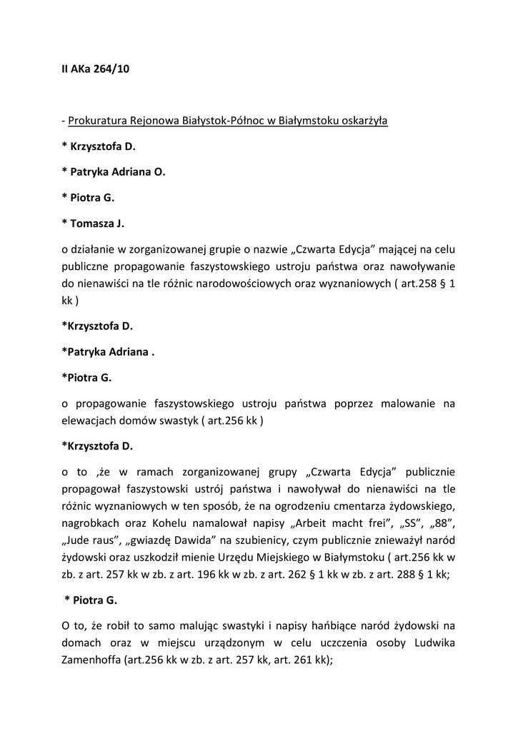 II AKa 264/10 - Prokuratura Rejonowa Białystok-Północ w Białymstoku oskarżyła * Krzysztofa D. * Patryka Adriana O. * Piotra G. * Tomasza J. o działanie w zorganizowanej grupie o nazwie „Czwarta Edycja” mającej na celu publiczne propagowanie faszystowskiego ustroju paostwa oraz nawoływanie do nienawiści na tle różnic narodowościowych oraz wyznaniowych ( art.258 § 1 kk ) *Krzysztofa D. *Patryka Adriana . *Piotra G. o propagowanie faszystowskiego ustroju paostwa poprzez malowanie na elewacjach domów swastyk ( art.256 kk ) *Krzysztofa D. o to ,że w ramach zorganizowanej grupy „Czwarta Edycja” publicznie propagował faszystowski ustrój paostwa i nawoływał do nienawiści na tle różnic wyznaniowych w ten sposób, że na ogrodzeniu cmentarza żydowskiego, nagrobkach oraz Kohelu namalował napisy „Arbeit macht frei”, „SS”, „88”, „Jude raus”, „gwiazdę Dawida” na szubienicy, czym publicznie znieważył naród żydowski oraz uszkodził mienie Urzędu Miejskiego w Białymstoku ( art.256 kk w zb. z art. 257 kk w zb. z art. 196 kk w zb. z art. 262 § 1 kk w zb. z art. 288 § 1 kk; * Piotra G. O to, że robił to samo malując swastyki i napisy haobiące naród żydowski na domach oraz w miejscu urządzonym w celu uczczenia osoby Ludwika Zamenhoffa (art.256 kk w zb. z art. 257 kk, art. 261 kk); - Sąd Okręgowy w Białymstoku wyrokiem z dnia 30.01.2009r. uniewinnił wszystkich oskarżonych od działania w zorganizowanej grupie pod nazwą „Czwarta Edycja” (art. 258 § 1 kk ) natomiast skazał za pozostałe zarzucane im czyny wymierzając kary : * Krzysztofowi D. ( za dwa przypisane czyny ) karę 1 roku i 8 miesięcy pozbawienia wolności * Patrykowi O. karę 1 roku pozbawienia wolności * Piotrowi G. karę 1 roku i 6 miesięcy pozbawienia wolności * Tomasza J. uniewinnił od czynu z art. 258 § 1 kk ( działanie w zorganizowanej grupie przestepczej) nadto wobec Krzysztofa D. i Piotra G. orzekł obowiązek naprawienia szkody wyrządzonej przestępstwem przez zapłacenie na rzecz Gminy Białystok odpowiednich sum pieniężnych. - Sąd Apelacyjny w Białymstoku wyrokiem z dnia 20.10.2009r. wykonanie orzeczonych wobec oskarżonych kar pozbawienia wolności warunkowo zawiesił utrzymując w mocy wyrok w pozostałej części. - kasację od wyroku wniósł pełnomocnik oskarżyciela posiłkowego zarzucając błędne przyjęcie przez sądy obu instancji , że „Czwarta Edycja” nie miała charakteru grupy przestępczej w rozumieniu art. 258 § 1 kk. - Sąd Najwyższy wyrokiem z dnia 12.10.2010r. uchylił zaskarżony wyrok wobec oskarżonych w części utrzymującej w mocy wyrok uniewinniający z zarzutu działania w zorganizowanej grupie przestępczej i sprawę przekazał do ponownego rozpoznania Sadowi Apelacyjnemu. Termin rozprawy 10.03.2011r., godz. 10.00, sala IV.