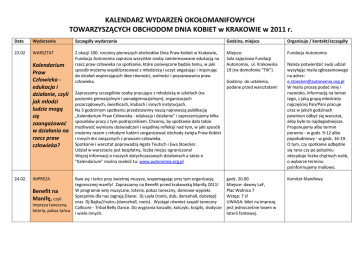 KALENDARZ WYDARZEO OKOŁOMANIFOWYCH TOWARZYSZĄCYCH OBCHODOM DNIA KOBIET w KRAKOWIE w 2011 r. Data Wydarzenie Szczegóły wydarzenia Godzina, miejsce Organizuje / kontakt/szczegóły 22.02 WARSZTAT Z okazji 100. rocznicy pierwszych obchodów Dnia Praw Kobiet w Krakowie, Fundacja Autonomia zaprasza wszystkie osoby zainteresowane edukacją na rzecz praw człowieka na spotkanie, które poświęcone będzie temu, w jaki sposób możemy współ/pracowad z młodzieżą i uczyd angażując i inspirując do działao wspierających idee równości, wolności i poszanowania praw człowieka. Miejsce: Sala zajęciowa Fundacji Autonomia, ul. Krakowska 19 (na domofonie "TIK"). Fundacja Autonomia Kalendarium Praw Człowieka edukacja i działanie, czyli jak młodzi ludzie mogą się zaangażowad w działania na rzecz praw człowieka? 24.02. IMPREZA Benefit na Manifę, czyli impreza taneczna, loteria, pokaz taoca Godziny: do ustalenia, podane przed warsztatami Zapraszamy szczególnie osoby pracujące z młodzieżą w szkołach (na poziomie gimnazjalnym i ponadgimnazjalnym), organizacjach pozarządowych, świetlicach, klubach i innych instytucjach. Na 3 godzinnym spotkaniu przedstawimy naszą najnowszą publikację „Kalendarium Praw Człowieka - edukacja i działanie" i zaprezentujemy kilka sposobów pracy z tym podręcznikiem. Chcemy, by spotkanie dało także możliwośd wymiany doświadczeo i wspólnej refleksji nad tym, w jaki sposób możemy razem z młodymi ludźmi zorganizowad obchody święta Praw Kobiet i innych dni związanych z prawami człowieka. Spotkanie i warsztat poprowadzą Agata Teutsch i Ewa Stoecker. Udział w warsztacie jest bezpłatny, liczba miejsc ograniczona! Więcej informacji o naszych dotychczasowych działaniach a także o "Kalendarium" można znaleźd tu: www.autonomia.org.pl Baw się i taocz przy świetnej muzyce, wspomagając przy tym organizację tegorocznej manify! Zapraszamy na Benefit przed krakowską Manifą 2011! W programie sety muzyczne, loteria, pokaz taneczny, domowe wypieki. Specjalnie dla nas zagrają DJane: Dj Layla (roots, dub, dancehall, dubstep) oraz Dj Bajka//nukru (dancehall, roots). Wystąpi również zaspół taneczny Callicore - Tribal Belly Dance. Do wygrania koszulki, kolczyki, książki, słodycze i wiele innych. godz. 20.00 Miejsce: dawny LaF, Plac Wolnica 7 Wstęp: 7 zł UWAGA: bilet na imprezę jest jednocześnie losem w loterii fantowej. Należy potwierdzid swój udział wysyłając maila zgłoszeniowego na adres: [email protected] W mailu proszę podad imię i nazwisko, informację na temat tego, z jaką grupą młodzieży najczęściej Pan/Pani pracuje oraz w jakich godzinach powinien odbyd się warsztat, żeby było to najdogodniejsze. Proponujemy albo termin poranny - w godz. 9-12 albo popołudniowy - w godz. 16-19. O tym, czy spotkanie odbędzie się rano czy po południu zdecyduje liczba chętnych osób, o wyborze terminu poinformujemy mailowo. Komitet Manifowy KALENDARZ WYDARZEO OKOŁOMANIFOWYCH TOWARZYSZĄCYCH OBCHODOM DNIA KOBIET w KRAKOWIE w 2011 r. 6.03 6.03 MANIFA KONCERT Translola 19 marca 1911 r. odbyły się pierwsze krakowskie obchody Międzynarodowego Dnia Kobiet. Rozpoczął je wiec w budynku dawnej Ujeżdżalni. Następnie kilka tysięcy kobiet wyruszyło pod pomnik Mickiewicza, a później do magistratu przy Placu Wszystkich Świętych, gdzie na ręce prezydenta Leo złożone zostały postulaty politycznego równouprawnienia kobiet oraz żądania ochrony zdrowia, życia i godnej płacy dla kobiet pracujących. I my, spadkobierczynie krakowskich emancypantek, podążymy niemal 100 lat później wyznaczoną przez nie trasą. 6 marca 2011 roku, upamiętniając 100. rocznicę pierwszych obchodów Dnia Kobiet w Krakowie, rozpoczniemy Krakowską Manifę tak jak w 1911 roku, pod dawną Ujeżdżalnią (budynek Ujeżdżalni został zburzony w ubiegłym roku) przy ul. Rajskiej, naprzeciwko Wojewódzkiej Biblioteki Publicznej, następnie przejdziemy herstoryczną trasą na Rynek i zakooczymy naszą demonstrację pod urzędem miasta. W Dzieo Kobiet, 8 marca, prezydent Krakowa otrzyma nasze postulaty. godz. 13.00 Komitet Manifowy Miejsce: spotkanie przed dawną Ujeżdżalnią (obecnie Małopolski Ogród Sztuk w budowie), naprzeciwko Wojewódzkiej Biblioteki Publicznej więcej informacji tutaj: www.manifakrakow.blox.pl http://po100laty.wordpress.co m/ Po manifie zapraszamy na koncert krakowskiego zespołu Translola! Translola o sobie: „Translola to kobiecy skład, który rozpoczął działalnośd pod koniec 2008 w Krakowie. Pochodząca z Bejrutu Amina - poszukująca nowych brzmieo gitarowych, studentka malarstwa. Gabi - obdarzona charyzmatyczną osobowością i głosem, studentka sztuk plastycznych. Ewa - pełen pasji muzyk rockowy i aktorka. Żaneta - muzyk zawodowy. Muzyka jest dla nas poszukiwaniem własnej drogi i stylu, jesteśmy związane z ideą zaznaczania pierwiastka kobiecości w sztuce. Obecnie zafascynowane jesteśmy postacią zmarłej tragicznie w 1991 r. Yanki Dyagilewej, ikony niezależnej kultury rosyjskiej, której piosenki wykonujemy we własnych aranżacjach. Przez niespełna dwa lata działalności udało nam się nagrad dwie demówki, jedną z naszymi utworami, drugą z piosenkami Yanki Dyagilewej. Staramy się aby nasze koncerty były jak performance odsłaniający kolejne oblicza Transloli.” http://www.myspace.com/translola Godz. do potwierdzenia, zostanie podana na blogu manifowym: www.manifakrakow.blox.pl Szczegóły: www.manifakrakow.blox.pl http://po100laty.wordpress.co m/ Miejsce: Kawiarnia Naukowa Koszt: 5 zł KALENDARZ WYDARZEO OKOŁOMANIFOWYCH TOWARZYSZĄCYCH OBCHODOM DNIA KOBIET w KRAKOWIE w 2011 r. 710.03 WARSZTAT Warsztat WenDo Samoobrona i asertywnośd dla kobiet od 15. do 64. roku życia. Prowadzenie: Agata Teutsch (Fundacja Autonomia). Obowiązują wcześniejsze zapisy – zgłoszenia do 02. 03.2011r. godz. 15:00 - 18:00 Miejsce: ul. Semperitowców 13, Punkt Aktywności Lokalnej. Warsztat organizow
