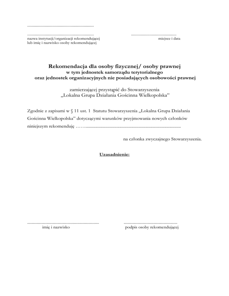 ........................................................................ ........................................................................ nazwa instytucji/organizacji rekomendującej lub imię i nazwisko osoby rekomendującej ................................................. miejsce i data Rekomendacja dla osoby fizycznej/ osoby prawnej w tym jednostek samorządu terytorialnego oraz jednostek organizacyjnych nie posiadających osobowości prawnej zamierzającej przystąpić do Stowarzyszenia „Lokalna Grupa Działania Gościnna Wielkopolska” Zgodnie z zapisami w § 11 ust. 1 Statutu Stowarzyszenia „Lokalna Grupa Działania Gościnna Wielkopolska” dotyczącymi warunków przyjmowania nowych członków niniejszym rekomenduję ……....................................................................................... na członka zwyczajnego Stowarzyszenia. Uzasadnienie: ....................................................................... imię i nazwisko ..................................................... podpis osoby rekomendującej