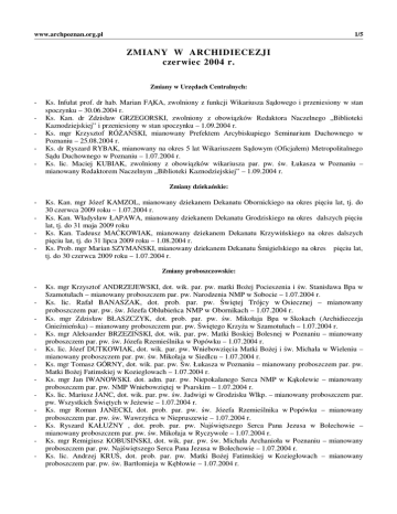 www.archpoznan.org.pl 1/5 ZMIANY W ARCHIDIECEZJI czerwiec 2004 r. Zmiany w Urz dach Centralnych: - Ks. Infułat prof. dr hab. Marian F KA, zwolniony z funkcji Wikariusza S dowego i przeniesiony w stan spoczynku – 30.06.2004 r. Ks. Kan. dr Zdzisław GRZEGORSKI, zwolniony z obowi zków Redaktora Naczelnego „Biblioteki Kaznodziejskiej” i przeniesiony w stan spoczynku – 1.09.2004 r. Ks. mgr Krzysztof RÓ A SKI, mianowany Prefektem Arcybiskupiego Seminarium Duchownego w Poznaniu – 25.08.2004 r. Ks. dr Ryszard RYBAK, mianowany na okres 5 lat Wikariuszem S dowym (Oficjałem) Metropolitalnego S du Duchownego w Poznaniu – 1.07.2004 r. Ks. lic. Maciej KUBIAK, zwolniony z obowi zków wikariusza par. pw. w. Łukasza w Poznaniu – mianowany Redaktorem Naczelnym „Biblioteki Kaznodziejskiej” – 1.09.2004 r. Zmiany dzieka skie: - Ks. Kan. mgr Józef KAMZOL, mianowany dziekanem Dekanatu Obornickiego na okres pi ciu lat, tj. do 30 czerwca 2009 roku – 1.07.2004 r. Ks. Kan. Władysław ŁAPAWA, mianowany dziekanem Dekanatu Grodziskiego na okres dalszych pi ciu lat, tj. do 31 maja 2009 roku Ks. Kan. Tadeusz MA KOWIAK, mianowany dziekanem Dekanatu Krzywi skiego na okres dalszych pi ciu lat, tj. do 31 lipca 2009 roku – 1.08.2004 r. Ks. Prob. mgr Marian SZYMA SKI, mianowany dziekanem Dekanatu migielskiego na okres pi ciu lat, tj. do 30 czerwca 2009 roku – 1.07.2004 r. Zmiany proboszczowskie: - Ks. mgr Krzysztof ANDRZEJEWSKI, dot. wik. par. pw. matki Bo ej Pocieszenia i w. Stanisława Bpa w Szamotułach – mianowany proboszczem par. pw. Narodzenia NMP w Sobocie – 1.07.2004 r. Ks. lic. Rafał BANASZAK, dot. prob. par. pw. wi tej Trójcy w Osiecznej – mianowany proboszczem par. pw. w. Józefa Oblubie ca NMP w Obornikach – 1.07.2004 r. Ks. mgr Zdzisław BŁASZCZYK, dot. prob. par. pw. w. Mikołaja Bpa w Skokach (Archidiecezja Gnie nie ska) – mianowany proboszczem par. pw. wi tego Krzy a w Szamotułach – 1.07.2004 r. Ks. mgr Aleksander BRZEZI SKI, dot. wik. par. pw. Matki Boskiej Bolesnej w Poznaniu – mianowany proboszczem par. pw. w. Józefa Rzemie lnika w Popówku – 1.07.2004 r. Ks. lic. Józef DUTKOWIAK, dot. wik. par. pw. Wniebowzi cia Matki Bo ej i w. Michała w Wieleniu – mianowany proboszczem par. pw. w. Mikołaja w Siedlcu – 1.07.2004 r. Ks. mgr Tomasz GÓRNY, dot. wik. par. pw. w. Łukasza w Poznaniu – mianowany proboszczem par. pw. Matki Bo ej Fatimskiej w Kozieglowach – 1.07.2004 r. Ks. mgr Jan IWANOWSKI. dot. adm. par. pw. Niepokalanego Serca NMP w K kolewie – mianowany proboszczem par. pw. NMP Wniebowzi tej w Psarskim – 1.07.2004 r. Ks. lic. Mariusz JANC, dot. wik. par. pw. w. Jadwigi w Grodzisku Wlkp. – mianowany proboszczem par. pw. Wszystkich wi tych w Je ewie – 1.07.2004 r. Ks. mgr Roman JANECKI, dot. prob. par. pw. w. Józefa Rzemie lnika w Popówku – mianowany proboszczem par. pw. w. Wawrzy ca w Niepruszewie – 1.07.2004 r. Ks. Ryszard KAŁU NY , dot. prob. par. pw. Naj wi tszego Serca Pana Jezusa w Bolechowie – mianowany proboszczem par. pw. w. Mikołaja w Ryczywole – 1.07.2004 r. Ks. mgr Remigiusz KOBUSI SKI, dot. wik. par. pw. w. Michała Archanioła w Poznaniu – mianowany proboszczem par. pw. Naj wi tszego Serca Pana Jezusa w Bolechowie – 1.07.2004 r. Ks. lic. Andrzej KRU , dot. prob. par. pw. Matki Bo ej Fatimskiej w Koziegłowach – mianowany proboszczem par. pw. w. Bartłomieja w K błowie – 1.07.2004 r. www.archpoznan.org.pl - 2/5 Ks. Kan. lic. Tomasz KURKOWIAK, dot. prob. par. pw. w. Wawrzy ca w Niepruszewie – mianowany proboszczem par. pw. w. Jana Chrzciciela w Ludomach – 1.07.2004 r. Ks. Kan. Zdzisław ŁUNIEWICZ, dot. prob. par. pw. Matki Bo ej Wspomo ycielki Wiernych w Swarz dzu – mianowany proboszczem par. pw. wi tej Trójcy w Osiecznej – 1.07.2004 r. Ks. lic. Krzysztof MIZERSKI, dot. wik. Podwy szenia Krzy a wi tego w Poznaniu – mianowany proboszczem par. pw. NMP Wniebowzi tej w Kopanicy – 1.08.2004 r. Ks. lic. Janusz MOLEWSKI, dot. wik. par. pw. w. Ap. Piotra i Pawła w Poznaniu – mianowany proboszczem par. pw. Matki Bo ej Wspomo ycielki Wiernych w Swarz dzu – 1.07.2004 r. Ks. mgr Hieronim NOWAK – mianowany proboszczem par. pw. Wszystkich wi tych w Kleszczewie – 1.07.2004 r. Ks. mgr Mieczysław URBANIAK, dot. prob. par. pw. w. Mikołaja w Siedlcu – mianowany proboszczem par. pw. w. Urszuli w Ruchocicach – 1.07.2004 r. Ks. Andrzej PAWŁOWSKI, dot. prob. par. pw. Wszystkich wi tych w Je ewie – mianowany proboszczem par. pw. Niepokalanego Serca NMP w K kolewie – 1.07.2004 r. Ks. mgr Andrzej SZCZEPA SKI, dot. prob. par. pw. w. Mikołaja Bpa w Krzywiniu – mianowany proboszczem par. pw. w. Stanisława Bpa w Go cieszynie – 1.07.2004 r. Ks. mgr Marian SZYMA SKI, dot. prob. par. pw. w. Urszuli w Ruchocicach – mianowany proboszczem par. pw. w. Stanisława Kostki w miglu – 1.07.2004 r. Ks. mgr Stanisław WALENSZCZAK, dot. prob. par. pw. Narodzenia NMP w Sobocie – mianowany proboszczem par. pw. w. Mikołaja Bpa w Krzywiniu – 1.07.2004 r. Zmiany wikariuszowskie: - - Ks. mgr Krzysztof AMBORSKI, dot. wik. par. pw. w. Jana Bosko w Luboniu – mianowany wikariuszem par. pw. w. Michała Archanioła w Poznaniu – 25.08.2004 r. Ks. lic. Artur ANDRZEJEWSKI, dot. wik. par. pw. w. Jadwigi l skiej w Poznaniu – mianowany wikariuszem par. pw. w. Stanisława Kostki w Poznaniu – 25.08.2004 r. Ks. mgr Robert BACH, dot. wik. par. pw. NMP Wniebowzi tej w Ostrorogu – mianowany wikariuszem par. pw. Matki Bo ej Pocieszenia w Poznaniu – 25.08.2004 r. Ks. mgr Bła ej BARCZAK, dot. wik. par. pw. Wniebowst pienia Pa skiego w Poznaniu – mianowany wikariuszem par. pw. w. Antoniego w Lesznie – 25.08.2004 r. Ks. mgr Jan CIESIÓŁKA, dot. wik. par. pw. MB Wspomo enia Wiernych w Swarz dzu – mianowany wikariuszem par. pw. Podwy szenia Krzy a wi tego w Poznaniu – 25.08.2004 r. Ks. lic. Zbigniew DOBRO , dot. wik. par. pw. Nawiedzenia NMP w Poznaniu – mianowany wikariuszem par. pw. Ducha wi tego w remie