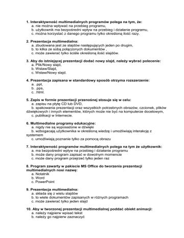 1. Interaktywność multimedialnych programów polega na tym, Ŝe: a. nie moŜna wpływać na przebieg programu, b. uŜytkownik ma bezpośredni wpływ na przebieg i działanie programu, c. moŜna korzystać z danego programu tylko określoną ilość razy. 2. Prezentacja multimedialna: a. zbudowana jest ze slajdów następujących jeden po drugim, b. to kilka ze sobą połączonych dokumentów , c. moŜe zawierać tylko ściśle określoną ilość slajdów. 3. Aby do istniejącej prezentacji dodać nowy slajd, naleŜy wybrać polecenie: a. Plik/Nowy slajd, b. Wstaw/Slajd, c. Wstaw/Nowy slajd. 4. Prezentacja zapisana w standardowy sposób otrzyma rozszerzenie: a. .ppt, b. .pps, c. .html. 5. Zapis w formie prezentacji przenośnej stosuje się w celu: a. zapisu na płytę CD lub DVD, b. spakowania prezentacji oraz wszystkich potrzebnych obrazów, czcionek, plików dźwiękowych i innych elementów, których moŜe nie być na komputerze docelowym, c. publikacji w Internecie. 6. Multimedialne programy edukacyjne: a. nigdy nie są wyposaŜone w dźwięki b. wzbogacają uŜytkownika w określoną wiedzę i umoŜliwiają interakcję z systemem c. umoŜliwiają poznanie tylko za pomocą obrazu 7. Interaktywność programów multimedialnych polega na tym Ŝe uŜytkownik: a. ma bezpośredni wpływ na przebieg i działanie programu b. moŜe dany program zapisać w dowolnym momencie c. moŜe dany program przejrzeć tylko jeden raz 8. Program zawarty w pakiecie MS Office do tworzenia prezentacji multimedialnych nosi nazwę: a. Notatnik b. Word c. PowerPoint 9. Prezentacja multimedialna: a. składa się z wielu slajdów b. to wiele dokumentów zapisanych w róŜnych programach c. moŜe zawierać tylko jeden slajd 10. Aby w tworzonej prezentacji multimedialnej poddać obiekt animacji: a. naleŜy najpierw wpisać tekst b. naleŜy go najpierw zaznaczyć c. naleŜy najpierw zastosować tło 11. Utworzone slajdy moŜna przeglądać: a. tylko po utworzeniu całej prezentacji b. w dowolnym momencie c. kiedy prezentacja zostanie zapisana 12. Do kaŜdego slajdu: a. zawsze naleŜy osobno określać kolor tła b. moŜna wybrać jeden z dostępnych w programie układów tekstu c. musi być określone takie samo tło 13. Zastosowanie w prezentacji wielu dźwięków i animacji sprawia Ŝe: a. odbiorca zwraca większą uwagę na zastosowane efekty niŜ na prezentowaną treść b. wyrazistszy jest przekaz treści c. zawsze odbiorca szybciej zapamiętuje przekazywane treści 14. Prezentację multimedialną najczęściej rozpoczyna się: a. filmem b. slajdem tytułowym c. animowanym obiektem 15. Do tytułu głównego i podtytułów naleŜy zastosować: a. ten sam rozmiar czcionki co do tekstów b. większy rozmiar czcionki niŜ do tekstów c. róŜnokolorową czcionkę 16. Wybierając do zapisu typ prezentacji: Pokaz PowerPoint po jej uruchomieniu: a. będzie odtwarzany pokaz slajdów b. będzie moŜna dalej tę prezentację edytować c. trzeba będzie przenieść tę prezentację do innego programu 17. Wyświetlanie kolejnych slajdów odbywa się: a. zawsze po kliknięciu myszą b. w zaleŜności od ustawienia - po kliknięciu myszą lub automatycznie po upływie określonej liczby sekund c. zawsze automatycznie 18. Szablony dostępne w programie słuŜą do wyboru: a. tekstów które uŜytkownik chce umieścić w prezentacji b. animowanych obrazków do prezentacji c. gotowego projektu dla wybranego lub dla wszystkich slajdów 19. Prezentację moŜna: a. otworzyć równieŜ w innym programie np MS Word b. zapisać między innymi jako stronę WWW c. odtworzyć w dowolnym programie do przeglądania plików graficznych 20. W jakim formacie naleŜy zapisać prezentację, aby uniemoŜliwić jej dalszą edycję? a. .pps b. nie ma takiej moŜliwości c. .ppt 21. Co to jest slajd? a. fragment tekstu b. Element podstawowy prezentacji w PowerPoint c. skompresowany dzwięk 22. Slajd to a. program do uruchomienia prezentacji b. Element składowy prezentacji c. Krótka animacja 23. Prezentacja wykonana w programie PowerPoint zapisana standardowo w formie do edycji otrzyma rozszerzenie (autor: LidkaA4) a. .pps b. .ppt c. .html 24. Zapis prezentacji przenośnej stosuje się w celu: (autor: LidkaA4) a. zamieszczenia w Internecie jako strony www, b. przetworzenia slajdów prezentacji na pliki graficzne, c. wyświetlenia na komputerze, na którym nie zainstalowano programu PowerPoint. 25. Zapis prezentacji w formacie GIF, JPEG, PNG, TIFF powoduje: (autor: LidkaA4) a. moŜliwość zamieszczenia prezentacji w Internecie, b. przetworzenie slajdów prezentacji na pliki graficzne, c. moŜliwość odtwarzania prezentacji na komputerze, na którym nie zainstalowano programu, w którym prezentacja została wykonana. 26. Prezentację moŜna: (autor: akagie1) a. otworzyć równieŜ w innym programie np. MS Word b. zapisać między innymi jako stronę WWW c. odtworzyć w dowolnym programie do przeglądania plików graficznych 27. W jakim formacie nalezy zapisać prezentację, aby uniemoŜliwić jej dalszą edycję? (autor: akagie1) a. .pps b. nie ma takiej moŜliwości c. .ppt