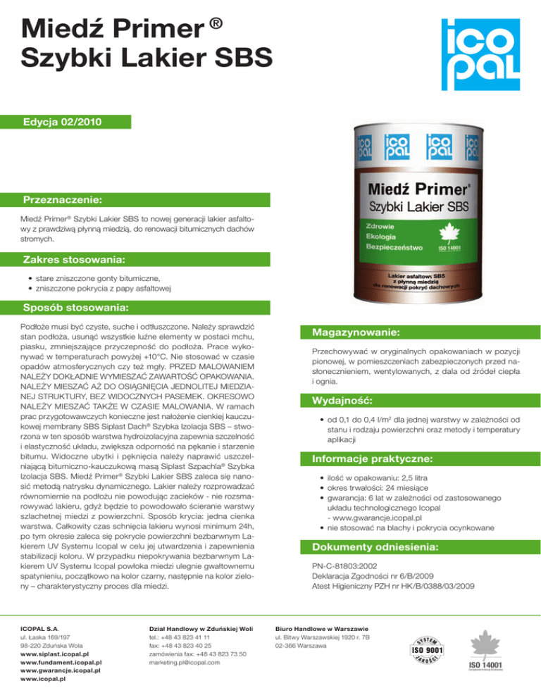 Miedź Primer ® Szybki Lakier SBS Edycja 02/2010 Przeznaczenie: Miedź Primer® Szybki Lakier SBS to nowej generacji lakier asfaltowy z prawdziwą płynną miedzią, do renowacji bitumicznych dachów stromych. Zakres stosowania: • stare zniszczone gonty bitumiczne, • zniszczone pokrycia z papy asfaltowej Sposób stosowania: Podłoże musi być czyste, suche i odtłuszczone. Należy sprawdzić stan podłoża, usunąć wszystkie luźne elementy w postaci mchu, piasku, zmniejszające przyczepność do podłoża. Prace wykonywać w temperaturach powyżej +10°C. Nie stosować w czasie opadów atmosferycznych czy też mgły. PRZED MALOWANIEM NALEŻY DOKŁADNIE WYMIESZAĆ ZAWARTOŚĆ OPAKOWANIA. NALEŻY MIESZAĆ AŻ DO OSIĄGNIĘCIA JEDNOLITEJ MIEDZIANEJ STRUKTURY, BEZ WIDOCZNYCH PASEMEK. OKRESOWO NALEŻY MIESZAĆ TAKŻE W CZASIE MALOWANIA. W ramach prac przygotowawczych konieczne jest nałożenie cienkiej kauczukowej membrany SBS Siplast Dach® Szybka Izolacja SBS – stworzona w ten sposób warstwa hydroizolacyjna zapewnia szczelność i elastyczność układu, zwiększa odporność na pękanie i starzenie bitumu. Widoczne ubytki i pęknięcia należy naprawić uszczelniającą bitumiczno-kauczukową masą Siplast Szpachla® Szybka Izolacja SBS. Miedź Primer ® Szybki Lakier SBS zaleca się nanosić metodą natrysku dynamicznego. Lakier należy rozprowadzać równomiernie na podłożu nie powodując zacieków - nie rozsmarowywać lakieru, gdyż będzie to powodowało ścieranie warstwy szlachetnej miedzi z powierzchni. Sposób krycia: jedna cienka warstwa. Całkowity czas schnięcia lakieru wynosi minimum 24h, po tym okresie zaleca się pokrycie powierzchni bezbarwnym Lakierem UV Systemu Icopal w celu jej utwardzenia i zapewnienia stabilizacji koloru. W przypadku niepokrywania bezbarwnym Lakierem UV Systemu Icopal powłoka miedzi ulegnie gwałtownemu spatynieniu, początkowo na kolor czarny, następnie na kolor zielony – charakterystyczny proces dla miedzi. ICOPAL S.A. ul. Łaska 169/197 98-220 Zduńska Wola www.siplast.icopal.pl www.fundament.icopal.pl www.gwarancje.icopal.pl www.icopal.pl Dział Handlowy w Zduńskiej Woli tel.: +48 43 823 41 11 fax: +48 43 823 40 25 zamówienia fax: +48 43 823 73 50 [email protected] Magazynowanie: Przechowywać w oryginalnych opakowaniach w pozycji pionowej, w pomieszczeniach zabezpieczonych przed nasłonecznieniem, wentylowanych, z dala od źródeł ciepła i ognia. Wydajność: • od 0,1 do 0,4 l/m2 dla jednej warstwy w zależności od stanu i rodzaju powierzchni oraz metody i temperatury aplikacji Informacje praktyczne: • ilość w opakowaniu: 2,5 litra • okres trwałości: 24 miesiące • gwarancja: 6 lat w zależności od zastosowanego układu technologicznego Icopal - www.gwarancje.icopal.pl • nie stosować na blachy i pokrycia ocynkowane Dokumenty odniesienia: PN-C-81803:2002 Deklaracja Zgodności nr 6/B/2009 Atest Higieniczny PZH nr HK/B/0388/03/2009 Biuro Handlowe w Warszawie ul. Bitwy Warszawskiej 1920 r. 7B 02-366 Warszawa ISO 14001 Zarządzanie Ochroną Środowiska