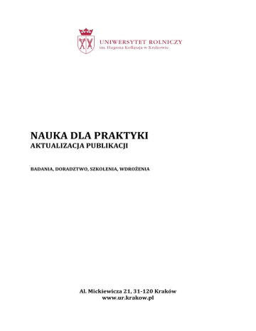 NAUKA DLA PRAKTYKI AKTUALIZACJA PUBLIKACJI BADANIA, DORADZTWO, SZKOLENIA, WDROŻENIA Al. Mickiewicza 21, 31-120 Kraków www.ur.krakow.pl 1 WYDZIAŁ ROLNICZO- EKONOMICZNY INSTYTUT EKONOMICZNO – SPOŁECZNY ................................................................ 3 1 1.1 1.2 1.3 ZAKŁAD EKONOMII I POLITYKI GOSPODARCZEJ ............................................. 6 ZAKŁAD EKONOMIKI I ORGANIZACJI ROLNICTWA ........................................... 8 ZAKŁAD ROZWOJU OBSZARÓW WIEJSKICH I DORADZTWA..........................11 INSTYTUT PRODUKCJI ROŚLINNEJ ..........................................................................14 2 2.1 2.2 ZAKŁAD ŁĄKARSTWA .........................................................................................14 ZAKŁAD SZCZEGÓŁOWEJ UPRAWY ROŚLIN ...................................................14 3 KATEDRA AGROTECHNIKI I EKOLOGII ROLNICZEJ ................................................16 4 KATEDRA CHEMII I FIZYKI .........................................................................................19 5 KATEDRA CHEMII ROLNEJ I ŚRODOWISKOWEJ .....................................................21 6 KATEDRA FIZJOLOGII ROŚLIN ..................................................................................23 7 KATEDRA GLEBOZNAWSTWA I OCHRONY GLEB ...................................................26 8 KATEDRA HODOWLI ROŚLIN I NASIENNICTWA.......................................................28 9 KATEDRA OCHRONY ŚRODOWISKA ROLNICZEGO ................................................30 10 KATEDRA STATYSTYKI MATEMATYCZNEJ ..............................................................32 11 KATEDRA ZARZĄDZANIA I MARKETINGU W AGROBIZNESIE .................................33 2 INSTYTUT/ ZAKŁAD/ KATEDRA 1 INSTYTUT EKONOMICZNO – SPOŁECZNY Dane kontaktowe Adres: al. Mickiewicza 21, 31-120 Kraków Telefon: 12 662-43-54 E-mail: [email protected] Profil badawczy Zakład Ekonomii i Polityki gospodarczej: Ekonomia w rolnictwie. Ekonomia przestrzenna i instytucjonalna. Działalność usługowa w agrobiznesie. Ekonomiczne aspekty rozwoju rolnictwa ekologicznego. Efektywność gospodarowania energią. Polityka ekonomiczna w Polsce i świecie. Zrównoważony i wielofunkcyjny rozwój wsi i rolnictwa w Polsce. Rozwój regionalny i lokalny. Mała i średnia przedsiębiorczość. Ekonomiczne aspekty ochrony środowiska. Rynek kapitałowy i finansowy. Teoria gospodarki rynkowej. Zakład Ekonomiki i Organizacji Rolnictwa: Ekonomika i organizacja gospodarstw uwzględnieniem obszarów górzystych. ze szczególnym Wdrażanie Wspólnej Polityki Rolnej i polityki strukturalnej na wsi i w rolnictwie. 3 Zarządzanie w rolnictwie i gospodarce żywnościowej. Finanse samorządów terytorialnych. Kapitał ludzki na wsi i w rolnictwie. Gospodarowanie ziemią rolniczą w regionach rozdrobnionych agrarnie. Zakład Rozwoju Obszarów Wiejskich i Doradztwa: Przemiany strukturalne w rolnictwie polskim i światowym ze szczególnym uwzględnieniem krajów Unii Europejskiej. Restrukturyzacja doradztwa rolniczego na świecie ze szczególnym uwzględnieniem doradztwa rolniczego w Polsce. Efektywność wdrażania instrumentów Wspólnej Polityki Rolnej i polityki strukturalnej UE. Ekonomiczno-społeczne przemian strukturalnych Projekty badawczo – rozwojowe uwarunkowania i efekty procesów Granty: Dywestycje w gospodarstwach rolniczych – istota, zakres, skutki. Społeczno-gospodarcze uwarunkowania zrównoważonego rozwoju obszarów wiejskich objętych Siecią Natura 2000 na terenie Zielonych Płuc Polski. Finanse gospodarstwa rolnego oraz ubezpieczenia rolników i gospodarstw rolnych w województwie mazowieckim i świętokrzyskim. Regionalne zróżnicowanie usług produkcyjnych w rolnictwie i ich wpływ na modernizację i przemiany strukturalne gospodarstw rodzinnych (analiza przestrzenno-czasowa). Rola sektora małych i średnich przedsiębiorstw w rozwoju społeczno-gospodarczym obszarów cennych przyrodniczo w Polsce południowo-wschodniej. Instytucje w procesie przemian strukturalnych i społecznoekonomicznych na polskiej wsi i w rolnictwie w świetle wsparcia unijnego. Zarządzanie procesem wdrażania wymogów wzajemnej zgodności w gospodarstwach rolniczych. 4 Projekty: Prospects for farmers’ support: advisory services in european akis (PRO AKIS), 7 Program Ramowy. Przyszłość doradztwa rolniczego w nowych warunkach realizacji Wspólnej Polityki Rolnej. Przedsiębiorczość kobiet na obszarach wiejskich Ukrainy. Wsparcie aktywizacji niepełnosprawnych mieszkańców na wsi ukraińskiej w celu podniesienia ich jakości życia poprzez promocję agroturystyki jako narzędzia aktywizacji zawodowej. Wiedza i Doświadczenie, a podstawa komercjalizacji badań. Dotychczasowe doświadczenia i potrzeby doradcze w świetle badań. Economics, Social Policy and Citizenship in the European Union Evidence of V4 Countries and Perspectives for Ukraine. Economics, Social Policy and Citizenship in the European Union Evidence of V4 Countries and Perspectives for Ukraine (International Visegrad Fund) Inne: Program wsparcia rozwoju rolnictwa w województwie małopolskim ze szczególnym uwzględnieniem gospodarki tradycyjnej, w tym sadownictwa, warzywnictwa, pszczelarstwa i owoców miękkich. Metodyka badań oraz wstępny plan programu rozwoju rolnictwa i obszarów wiejskich województwa śląskiego. Inicjatywa na rzecz rozwoju rolnictwa w województwie małopolskim na lata 2010-2012. Kursy, szkolenia, studia podyplomowe, inne organicznego Wprowadzenie do teorii gospodarki rynkowej. Uwarunkowania konkurencyjności przedsiębiorstwach. w małych i średnich Ekonomiczne i społeczne aspekty strategii zrównoważonego rozwoju w Polsce i w krajach UE. Giełdy towarowe i kapitałowe. Zakres i struktura finansowania gospodarstw rolnych. 5 Ubezpieczenia rolników i społecznym i majątkowym. gospodarstw rolnych w zakresie Dwusemestralne studia podyplomowe: Studium wiedzy o Unii Europejskie