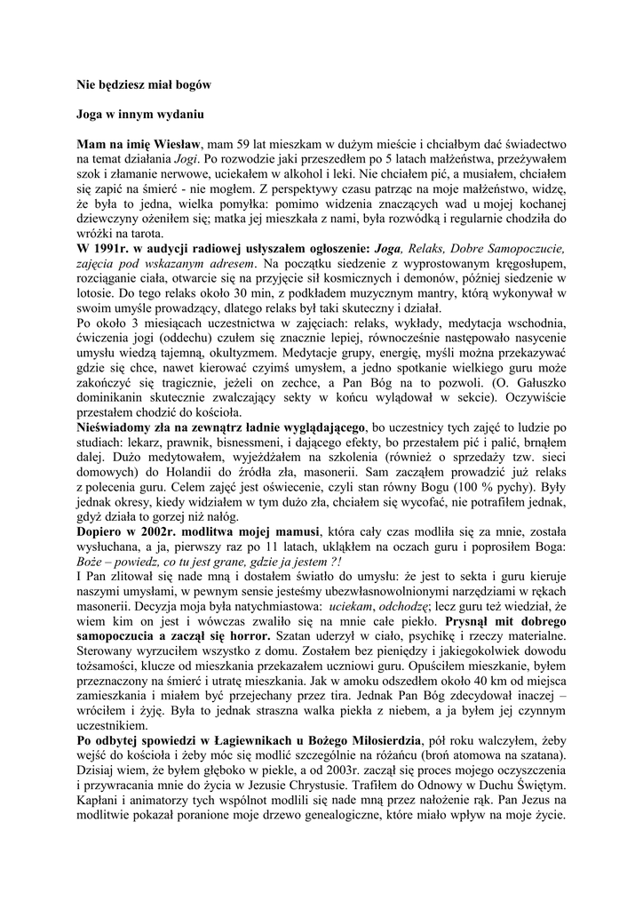 Nie będziesz miał bogów Joga w innym wydaniu Mam na imię Wiesław, mam 59 lat mieszkam w duŜym mieście i chciałbym dać świadectwo na temat działania Jogi. Po rozwodzie jaki przeszedłem po 5 latach małŜeństwa, przeŜywałem szok i złamanie nerwowe, uciekałem w alkohol i leki. Nie chciałem pić, a musiałem, chciałem się zapić na śmierć - nie mogłem. Z perspektywy czasu patrząc na moje małŜeństwo, widzę, Ŝe była to jedna, wielka pomyłka: pomimo widzenia znaczących wad u mojej kochanej dziewczyny oŜeniłem się; matka jej mieszkała z nami, była rozwódką i regularnie chodziła do wróŜki na tarota. W 1991r. w audycji radiowej usłyszałem ogłoszenie: Joga, Relaks, Dobre Samopoczucie, zajęcia pod wskazanym adresem. Na początku siedzenie z wyprostowanym kręgosłupem, rozciąganie ciała, otwarcie się na przyjęcie sił kosmicznych i demonów, później siedzenie w lotosie. Do tego relaks około 30 min, z podkładem muzycznym mantry, którą wykonywał w swoim umyśle prowadzący, dlatego relaks był taki skuteczny i działał. Po około 3 miesiącach uczestnictwa w zajęciach: relaks, wykłady, medytacja wschodnia, ćwiczenia jogi (oddechu) czułem się znacznie lepiej, równocześnie następowało nasycenie umysłu wiedzą tajemną, okultyzmem. Medytacje grupy, energię, myśli moŜna przekazywać gdzie się chce, nawet kierować czyimś umysłem, a jedno spotkanie wielkiego guru moŜe zakończyć się tragicznie, jeŜeli on zechce, a Pan Bóg na to pozwoli. (O. Gałuszko dominikanin skutecznie zwalczający sekty w końcu wylądował w sekcie). Oczywiście przestałem chodzić do kościoła. Nieświadomy zła na zewnątrz ładnie wyglądającego, bo uczestnicy tych zajęć to ludzie po studiach: lekarz, prawnik, bisnessmeni, i dającego efekty, bo przestałem pić i palić, brnąłem dalej. DuŜo medytowałem, wyjeŜdŜałem na szkolenia (równieŜ o sprzedaŜy tzw. sieci domowych) do Holandii do źródła zła, masonerii. Sam zacząłem prowadzić juŜ relaks z polecenia guru. Celem zajęć jest oświecenie, czyli stan równy Bogu (100 % pychy). Były jednak okresy, kiedy widziałem w tym duŜo zła, chciałem się wycofać, nie potrafiłem jednak, gdyŜ działa to gorzej niŜ nałóg. Dopiero w 2002r. modlitwa mojej mamusi, która cały czas modliła się za mnie, została wysłuchana, a ja, pierwszy raz po 11 latach, ukląkłem na oczach guru i poprosiłem Boga: BoŜe – powiedz, co tu jest grane, gdzie ja jestem ?! I Pan zlitował się nade mną i dostałem światło do umysłu: Ŝe jest to sekta i guru kieruje naszymi umysłami, w pewnym sensie jesteśmy ubezwłasnowolnionymi narzędziami w rękach masonerii. Decyzja moja była natychmiastowa: uciekam, odchodzę; lecz guru teŜ wiedział, Ŝe wiem kim on jest i wówczas zwaliło się na mnie całe piekło. Prysnął mit dobrego samopoczucia a zaczął się horror. Szatan uderzył w ciało, psychikę i rzeczy materialne. Sterowany wyrzuciłem wszystko z domu. Zostałem bez pieniędzy i jakiegokolwiek dowodu toŜsamości, klucze od mieszkania przekazałem uczniowi guru. Opuściłem mieszkanie, byłem przeznaczony na śmierć i utratę mieszkania. Jak w amoku odszedłem około 40 km od miejsca zamieszkania i miałem być przejechany przez tira. Jednak Pan Bóg zdecydował inaczej – wróciłem i Ŝyję. Była to jednak straszna walka piekła z niebem, a ja byłem jej czynnym uczestnikiem. Po odbytej spowiedzi w Łagiewnikach u BoŜego Miłosierdzia, pół roku walczyłem, Ŝeby wejść do kościoła i Ŝeby móc się modlić szczególnie na róŜańcu (broń atomowa na szatana). Dzisiaj wiem, Ŝe byłem głęboko w piekle, a od 2003r. zaczął się proces mojego oczyszczenia i przywracania mnie do Ŝycia w Jezusie Chrystusie. Trafiłem do Odnowy w Duchu Świętym. Kapłani i animatorzy tych wspólnot modlili się nade mną przez nałoŜenie rąk. Pan Jezus na modlitwie pokazał poranione moje drzewo genealogiczne, które miało wpływ na moje Ŝycie. Oczyszczone teŜ zostało mieszkanie, w którym działy się róŜne dziwne rzeczy, a ja nie mogłem w nim spać. Doświadczyłem Mądrości, Miłości Miłosiernej i Mocy Boga Ojca i Jezusa Chrystusa, bo szatan zabierał mi siły, energię i chęć do Ŝycia - planowałem pójście do zakładu zamkniętego. Jezus Chrystus podczas Eucharystii, adoracji Najświętszego Sakramentu dawał mi więcej tego wszystkiego, co szatan zabierał, im większe zło, tym większa Łaska. Doświadczyłem teŜ, czytając codziennie Pismo Święte, Ŝe Słowo Boga jest Ŝywe i aktualne na dzień wczorajszy, dzisiejszy i jutrzejszy, a kapłani są Jego następcami. Dlatego teraz modlę się za kapłanów i proszę was wszystkich módlcie się za kapłanów, bo jak znikną kapłani, zniknie dobro, świat. Wyrzućcie z domu wszystkie rzeczy bałwochwalstwa: posąŜki Buddy, talizmany, horoskopy, karty głównie tarota, ksiąŜki uzdrawiaczy i innych religii i sekt. Nie chodźcie na zakupy w niedzielę, nie kupujcie Wyborczej, kolorowych śmieci, nie oglądajcie publicznej telewizji, gdyŜ masoni mają tam swoich ludzi (oni sami, nie wszyscy, wiedzą o tym komu słuŜą) i tak ustawiają program, aby zniszczyć Kościół i człowieka. Dziecko w szkole gwałcone na oczach kolegów i bez interwencji nauczycieli to jest rezultat pracy masonów, którzy się posługują środkami masowego przekazu. Potrzeba tylko czasu i oczywiście naszego przyzwolenia, Ŝeby zło dominowało. Ja odkryłem, Ŝe co najmniej 60% złego samopoczucia i grzechu wynika z oglądania TV publicznej. Więc 2002r. nie wiedząc, Ŝe Pan Bóg w swojej mądrości moŜe przemienić największe zło w dobro i powołać do Ŝycia Telewizję Trwam, Radio Maryja i inne stacje katolickie, wyrzuciłem źródło zła, to jest telewizor, do śmieci. I zacząłem karmić swój umysł treściami religii Chrystusowej i dobrą lekturą i nastąpiła ,,metanoia” (przemiana). Na pierwszym miejscu jest Pan Bóg a nie 