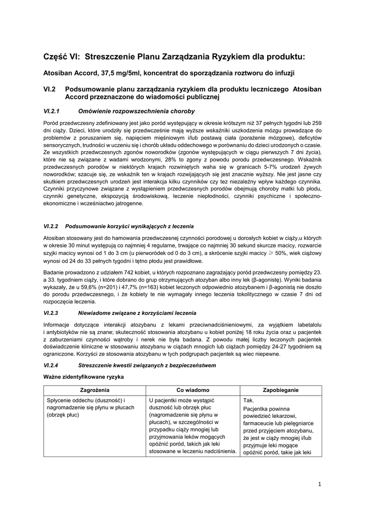 Część VI: Streszczenie Planu Zarządzania Ryzykiem dla produktu: Atosiban Accord, 37,5 mg/5ml, koncentrat do sporządzania roztworu do infuzji VI.2 VI.2.1 Podsumowanie planu zarządzania ryzykiem dla produktu leczniczego Atosiban Accord przeznaczone do wiadomości publicznej Omówienie rozpowszechnienia choroby Poród przedwczesny zdefiniowany jest jako poród występujący w okresie krótszym niż 37 pełnych tygodni lub 259 dni ciąży. Dzieci, które urodziły się przedwcześnie mają wyższe wskaźniki uszkodzenia mózgu prowadzące do problemów z poruszaniem się, napięciem mięśniowym i/lub postawą ciała (porażenie mózgowe), deficytów sensorycznych, trudności w uczeniu się i chorób układu oddechowego w porównaniu do dzieci urodzonych o czasie. Ze wszystkich przedwczesnych zgonów noworodków (zgonów występujących w ciągu pierwszych 7 dni życia), które nie są związane z wadami wrodzonymi, 28% to zgony z powodu porodu przedwczesnego. Wskaźnik przedwczesnych porodów w niektórych krajach rozwiniętych waha się w granicach 5-7% urodzeń żywych noworodków; szacuje się, ze wskaźnik ten w krajach rozwijających się jest znacznie wyższy. Nie jest jasne czy skutkiem przedwczesnych urodzeń jest interakcja kilku czynników czy tez niezależny wpływ każdego czynnika. Czynniki przyczynowe związane z wystąpieniem przedwczesnych porodów obejmują choroby matki lub płodu, czynniki genetyczne, ekspozycją środowiskową, leczenie niepłodności, czynniki psychiczne i społecznoekonomiczne i wcześniactwo jatrogenne. VI.2.2 Podsumowanie korzyści wynikających z leczenia Atosiban stosowany jest do hamowania przedwczesnej czynności porodowej u dorosłych kobiet w ciąży,u których w okresie 30 minut występują co najmniej 4 regularne, trwające co najmniej 30 sekund skurcze macicy, rozwarcie szyjki macicy wynosi od 1 do 3 cm (u pierworódek od 0 do 3 cm), a skrócenie szyjki macicy ≥ 50%, wiek ciążowy wynosi od 24 do 33 pełnych tygodni i tętno płodu jest prawidłowe. Badanie prowadzono z udziałem 742 kobiet, u których rozpoznano zagrażający poród przedwczesny pomiędzy 23. a 33. tygodniem ciąży, i które dobrano do grup otrzymujących atozyban albo inny lek (β-agonistę). Wyniki badania wykazały, że u 59,6% (n=201) i 47,7% (n=163) kobiet leczonych odpowiednio atozybanem i β-agonistą nie doszło do porodu przedwczesnego, i że kobiety te nie wymagały innego leczenia tokolitycznego w czasie 7 dni od rozpoczęcia leczenia. VI.2.3 Niewiadome związane z korzyściami leczenia Informacje dotyczące interakcji atozybanu z lekami przeciwnadciśnieniowymi, za wyjątkiem labetalolu i antybiotyków nie są znane; skuteczność stosowania atozybanu u kobiet poniżej 18 roku życia oraz u pacjentek z zaburzeniami czynności wątroby i nerek nie była badana. Z powodu małej liczby leczonych pacjentek doświadczenie kliniczne w stosowaniu atozybanu w ciążach mnogich lub ciążach pomiędzy 24-27 tygodniem są ograniczone. Korzyści ze stosowania atozybanu w tych podgrupach pacjentek są wiec niepewne. VI.2.4 Streszczenie kwestii związanych z bezpieczeństwem Ważne zidentyfikowane ryzyka Zagrożenia Spłycenie oddechu (duszność) i nagromadzenie się płynu w płucach (obrzęk płuc) Co wiadomo U pacjentki może wystąpić duszność lub obrzęk płuc (nagromadzenie się płynu w płucach), w szczególności w przypadku ciąży mnogiej lub przyjmowania leków mogących opóźnić poród, takich jak leki stosowane w leczeniu nadciśnienia. Zapobieganie Tak. Pacjentka powinna powiedzieć lekarzowi, farmaceucie lub pielęgniarce przed przyjęciem atozybanu, że jest w ciąży mnogiej i/lub przyjmuje leki mogące opóźnić poród, takie jak leki 1 Zagrożenia Co wiadomo Zapobieganie stosowane w leczeniu nadciśnienia. Ważne potencjalne ryzyka Ryzyka Co wiadomo Stosowanie leku poza zarejestrowanymi wskazaniami Nie dotyczy Zakażenie dróg moczowych Nie dotyczy Ważne brakujące informacje Ryzyka Co wiadomo Interakcje z innymi lekami stosowanymi w celu opóźnienia porodu (leki tokolityczne), antybiotykami i lekami stosowanymi w celu leczenia wysokiego ciśnienia krwi (leki przeciwnadciśnieniowe) U pacjentki może wystąpić duszność lub obrzęk płuc (nagromadzenie się płynu w płucach), zwłaszcza, jeśli pacjentka przyjmuje leki mogące opóźnić poród, takie jak leki stosowane w celu leczenia wysokiego ciśnienia krwi. Ciąże mnogie Przeprowadzono badania interakcji z betametazonem i labetalolem u zdrowych ochotniczek. Informacje na temat stosowania atozybanu u kobiet w ciąży mnogiej są ograniczone. Fakt ten łącznie z lekami stosowanymi w celu opóźniania porodu może zwiększać ryzyko gromadzenia się płynu w płucach (obrzęk płuc). VI.2.5 Podsumowanie dodatkowych aktywności minimalizujących ryzyko w odniesieniu do określonych zagrożeń Wszystkie produkty lecznicze posiadają charakterystykę produktu leczniczego (ChPL), która szczegółowo informuje lekarzy, farmaceutów oraz inne osoby wykonujące zawód medyczny jak stosować lek oraz o zagrożeniach i zaleceniach mających na celu ich minimalizację. Skrócona wersja ChPL w języku niefachowym jest dostępna w postaci ulotki dołączonej do opakowania. Środki przedstawione w tym dokumencie noszą nazwę rutynowych środków zmniejszających ryzyko. Ten lek nie wymaga dodatkowych środków minimalizacji ryzyka. VI.2.6 obrotu Zakładany plan nadzoru nad bezpieczeństwem produktu leczniczego po wprowadzeniu do Nie dotyczy. VI.2.7 Podsumowanie zmian wprowadzonych do planu zarządzania ryzykiem w porządku chronologicznym Wersja dokumentu 3.0 Data Zagadnienie Komentarze Brak zmian w kwestiach dotyczących bezpieczeństwa Na podstawie projektu Raportu Oceniającego Charakterystykę Produktu Leczniczego punkt 5.2 zgodnie z danymi produktu referencyjnego z dnia 120 procedury 28.05.2015 2 Wersja dokumentu 2.0 Data Zagadnienie Komentarze 31.12.2014 Ważne potencjalne ryzyka Atos
