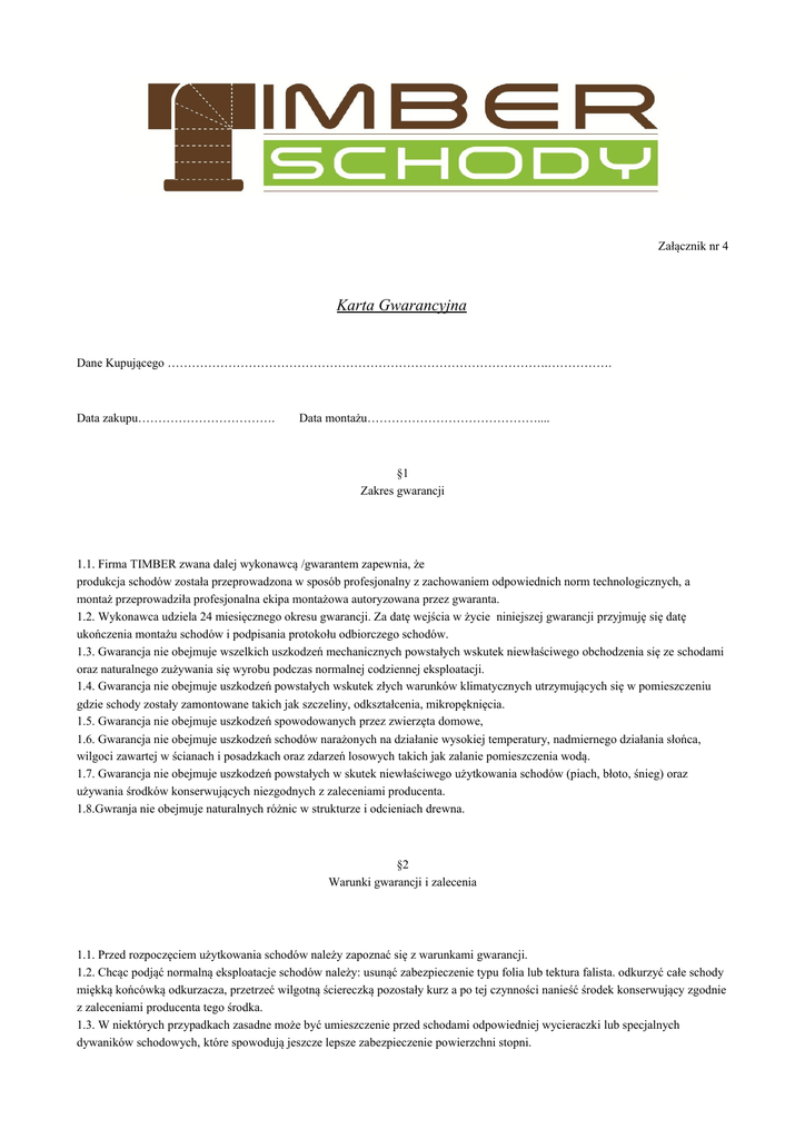 Załącznik nr 4 Karta Gwarancyjna Dane Kupującego ………………………………………………………………………………….……………. Data zakupu……………………………. Data montażu…………………………………….... §1 Zakres gwarancji 1.1. Firma TIMBER zwana dalej wykonawcą /gwarantem zapewnia, że produkcja schodów została przeprowadzona w sposób profesjonalny z zachowaniem odpowiednich norm technologicznych, a montaż przeprowadziła profesjonalna ekipa montażowa autoryzowana przez gwaranta. 1.2. Wykonawca udziela 24 miesięcznego okresu gwarancji. Za datę wejścia w życie niniejszej gwarancji przyjmuję się datę ukończenia montażu schodów i podpisania protokołu odbiorczego schodów. 1.3. Gwarancja nie obejmuje wszelkich uszkodzeń mechanicznych powstałych wskutek niewłaściwego obchodzenia się ze schodami oraz naturalnego zużywania się wyrobu podczas normalnej codziennej eksploatacji. 1.4. Gwarancja nie obejmuje uszkodzeń powstałych wskutek złych warunków klimatycznych utrzymujących się w pomieszczeniu gdzie schody zostały zamontowane takich jak szczeliny, odkształcenia, mikropęknięcia. 1.5. Gwarancja nie obejmuje uszkodzeń spowodowanych przez zwierzęta domowe, 1.6. Gwarancja nie obejmuje uszkodzeń schodów narażonych na działanie wysokiej temperatury, nadmiernego działania słońca, wilgoci zawartej w ścianach i posadzkach oraz zdarzeń losowych takich jak zalanie pomieszczenia wodą. 1.7. Gwarancja nie obejmuje uszkodzeń powstałych w skutek niewłaściwego użytkowania schodów (piach, błoto, śnieg) oraz używania środków konserwujących niezgodnych z zaleceniami producenta. 1.8.Gwranja nie obejmuje naturalnych różnic w strukturze i odcieniach drewna. §2 Warunki gwarancji i zalecenia 1.1. Przed rozpoczęciem użytkowania schodów należy zapoznać się z warunkami gwarancji. 1.2. Chcąc podjąć normalną eksploatacje schodów należy: usunąć zabezpieczenie typu folia lub tektura falista. odkurzyć całe schody miękką końcówką odkurzacza, przetrzeć wilgotną ściereczką pozostały kurz a po tej czynności nanieść środek konserwujący zgodnie z zaleceniami producenta tego środka. 1.3. W niektórych przypadkach zasadne może być umieszczenie przed schodami odpowiedniej wycieraczki lub specjalnych dywaników schodowych, które spowodują jeszcze lepsze zabezpieczenie powierzchni stopni. 1.4. Całe schody należy dokładnie posprzątać minimum dwa razy w tygodniu. Należy zwracać szczególna uwagę na metody stosowane przy sprzątaniu gdyż może to być przyczyną utraty gwarancji. Zabrania się stosowanie wszelkiego rodzaju rozcieńczalników, zmywaczy, nabłyszczaczy, silnych detergentów, utrzymywania nadmiernej ilości wody lub innego środka, pozostawiania mokrych plam. Przed zastosowaniem środka konserwującego należy uprzednio przeprowadzić próbę działania tego środka na małej-niewidocznej części schodów. 1.5. Naturalne drewno z którego wyprodukowano schody, jest produktem naturalnym i charakteryzuje się budową higroskopijną .W związku z tym prosimy o zwrócenie szczególnej uwagi na utrzymywanie odpowiedniego mikroklimatu w pomieszczeniach gdzie użytkuje się schody, w przeciwnym wypadku drewno może ulec odkształceniu, powstaniu szczelin, mikropęknięć itp. Proszę zapoznać się z poniższą tabelą określającą zależność wilgotności i temperatury otoczenia na wilgotność drewna z jakiego wykonano schody. Temperatura Powietrza Wilgotność względna powietrz w (%) 0 5 10 15 20 25 30 35 40 65 12,3 12,2 12 11,8 11,6 11,4 11,2 11 10,8 60 11,3 11 10,8 10,6 10,5 10,4 10,3 10,1 10 55 10,2 10,1 10 9,9 9,8 9,7 9,5 9,3 9,1 50 9,6 9,4 9,2 9,1 9 8,8 8,6 8,4 8,2 45 8,8 8,7 8,6 8,5 8,3 8,1 7,9 7,7 7,5 40 8,2 8,1 8 7,8 7,6 7,4 7,2 7 6,8 §3 Postanowienia końcowe 1.1. Uprawnienia z tytułu udzielonej gwarancji, mogą być realizowane tylko po przedstawieniu przez zamawiającego ważnej karty gwarancyjnej, rachunku zakupu schodów, również dopełnieniem obowiązku pełnej zapłaty za zamontowane schody. 1.2. W przypadku stwierdzenia wad kupujący zobowiązany jest do bezzwłocznego poinformowania producenta o zaistniałym fakcie producenta, pisemnie, na adres producenta lub wysyłając w wiadomość na adres mailowy „[email protected]”. Kupujący dołoży starań aby przedstawić zaistniały problem w sposób czytelny i rzetelny. W przypadku otrzymania takiego zgłoszenia, producent rozpatrzy zasadność zgłoszenia w terminie 14 dni od daty wpłynięcia zgłoszenia. 1.3. Jeżeli za zgłoszone wady odpowiedzialność leży po stronie producenta, dołoży on wszelkich starań aby usunąć te wady w terminie do 21 dni. Może on w tym celu zgodnie z rzetelna ockną sytuacji, w celu naprawy wad dokonać naprawy na miejscu u klienta lub w uzasadnionych przypadkach zdemontować schody i zabrać do siedziby firmy w celu gruntownej naprawy po czym zostaną one dostarczone i zamontowane ponownie. a odbiór ponowny będąc musiał być potwierdzony protokołem odbioru. 1.4. Odpowiedzialność producenta-gwaranta za wady stwierdzone nie może przekroczyć wartości ich zakupu. 1.5. Wady powstałe z winy kupującego mogą być usunięte tylko na jego koszt. 1.6. Nieprzestrzeganie powyższych warunków i zaleceń powoduje utratę gwarancji. Kupujący oświadcza że zapoznał się z treścią gwarancji, rozumie ją i akceptuje. Podpis Kupującego Podpis Producenta