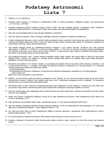 Podstawy Astronomii Lista 7 1. 2. Pokazać, Ŝe 1 pc=206265 AU. Paralaksy dwóch gwiazd A i B zmierzono z dokładnością 0''.006. Co moŜna powiedzieć o odległości kaŜdej z tych gwiazd jeŜeli πA=0''.312 oraz πB=0''.006? 3. Paralaksa najbliŜszej gwiazdy (Proxima Centauri) wynosi 0'',765. Jaka jest odległość gwiazdy w parsekach, latach świetlnych, jednostkach astronomicznych i w kilometrach? Podać wzory ogólne na przeliczenia pomiędzy tymi jednostkami. 4. Jaka jest roczna paralaksa Słońca? Jaka jest jego odległość w parsekach? 5. Policz jak długo trwa podróŜ z Ziemi na Księzyc zakładając najniŜsze wymagania energetyczne takiego lotu. 6. Z jakimi prędkościami (kierunek, zwrot i wartość wektora prędkości) naleŜy wystrzelić z Ziemi sondy aby dotarły one do Merkurego i Jowisza po orbitach eliptycznych. Które z tych dwu zadań wymaga zuŜycia mniejszej ilości paliwa? W rozwiązaniu zakładamy, Ŝe orbity planet są kołowe i leŜą w jednej płaszczyźnie. 7. Dwa satelity obiegają Ziemię po współpłaszczyznowych okręgach w tym samym kierunku. Promienie tych orbit wynoszą odpowiednio r1=7870 km i r2=7920 km, a okres pierwszego satelity T1=115.8 min. W pewnym momencie punkty podsatelitarne tych satelitów pokrywały się. Po jakim czasie od tego momentu i o jaką wartość naleŜy zwiększyć prędkości pierwszego satelity, aby dotarł on do drugiego statku po orbicie eliptycznej. 8. Jaką prędkość (kierunek, zwrot i wartość wektora prędkości) naleŜy nadać sondzie, aby mogła spaść na Słońce po linii prostej łączącej Ziemię i Słońce. Czy zadanie to wymaga zuŜycia większej ilości paliwa niŜ wysłanie sondy poza Układ Słoneczny? Zakładamy, Ŝe orbita Ziemi jest kołowa. 9. RozwaŜmy dwa satelity A i B o równych masach m, poruszające się dookoła Ziemi po tej samej orbicie kołowej o promieniu r, ale w przeciwnych kierunkach, i w związku z tym dąŜące do zderzenia. Znaleźć (w zaleŜności od G, MZ (masa Ziemi), m i r) całkowitą energię mechaniczną układu oba satelity plus Ziemia: a) przed zderzeniem, b) bezpośrednio po zderzeniu (zakładamy, Ŝe zderzenie jest całkowicie niespręŜyste i pozostanie po nim jednoczęściowy wrak o masie 2m). Opisać ruch wraka powstałego w tym zderzeniu. 10. ZałóŜmy, Ŝe przez Ziemię wzdłuŜ jej średnicy przekopano tunel. Pokazać, Ŝe ruch ciała wrzuconego do tego tunelu jest ruchem harmonicznym prostym. Wyliczyć czas przelotu ciała przez tunel i maksymalną osiągniętą przez nie prędkość. W rozwiązaniu pominąć tarcie oraz przyjąć jednorodną gęstość Ziemi. 11. Wyobraźmy sobie, Ŝe ciało wrzucone do opisanego powyŜej tunelu zaopatrzono w silnik rakietowy. Co stanie się z tym ciałem, gdy przy pomocy tego silnika w momencie przelotu przez środek Ziemi zwiększymy nagle jego prędkość o 5.8 km/s. 12. Wyznacz moment pędu ciała znajdującego się na orbicie kołowej oraz orbicie eliptycznej o zadanym mimośrodzie. Od czego zaleŜy iloraz obu tych wielkości? 13. Okular przy lunecie o ogniskowej obiektywu równej 90 cm daje powiększenie 50-krotne. Jakie powiększenie da ten okular przy lunecie o ogniskowej 2.7 m? 14. Jaką ogniskową musi posiadać okular lunety o ogniskowej równej 1 m, aby dawał powiększenie 200-krotne? 15. Jaka jest zdolność rozdzielcza refraktora Grubba (średnica obiektywu D =25 cm) Obserwatorium Warszawskiego i czy moŜna przy jego uŜyciu rozdzielić oba składniki µ Cygni, odległe od siebie o 1''.8? 16. Jak wielki jest obraz Marsa na kliszy fotograficznej zdjętej za pomocą astrografu o ogniskowej 19,36 (Obserwatorium Yerks'a; średnica kątowa Marsa = 20'')? 17. Ile wynosi ogniskowa obiektywu astrografu, jeśli średnica liniowa KsięŜyca na kliszy równa się 2 cm? 18. Gwiazda o deklinacji δ przechodzi wzdłuŜ średnicy pola widzenia lunety w ciągu t sekund. Ile minut łuku wynosi pole widzenia lunety? UBS, SK