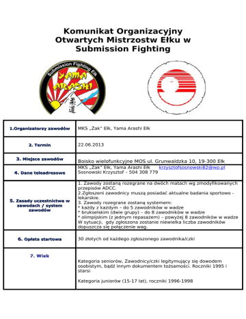 Komunikat Organizacyjny Otwartych Mistrzostw Ełku w Submission Fighting 1.Organizatorzy zawodów 2. Termin 3. Miejsce zawodów 4. Dane teleadresowe 5. Zasady uczestnictwa w zawodach / system zawodów 6. Opłata startowa MKS „Żak” Ełk, Yama Arashi Ełk 22.06.2013 Boisko wielofunkcyjne MOS ul. Grunwaldzka 10, 19-300 Ełk MKS „Żak” Ełk, Yama Arashi Ełk [email protected] Sosnowski Krzysztof – 504 308 779 1. Zawody zostaną rozegrane na dwóch matach wg zmodyfikowanych przepisów ADCC. 2.Zgłoszeni zawodnicy muszą posiadać aktualne badania sportowo lekarskie. 3. Zawody rozegrane zostaną systemem: * każdy z każdym – do 5 zawodników w wadze * brukselskim (dwie grupy) – do 8 zawodników w wadze * olimpijskim (z jednym repasażem) – powyżej 8 zawodników w wadze W sytuacji, gdy zgłoszona zostanie niewielka liczba zawodników dopuszcza się połączenie wag. 30 złotych od każdego zgłoszonego zawodnika/czki 7. Wiek Kategoria seniorów, Zawodnicy/czki legitymujący się dowodem osobistym, bądź innym dokumentem tożsamości. Roczniki 1995 i starsi Kategoria juniorów (15-17 lat), roczniki 1996-1998 8. Kategorie wagowe 9. Czas walki Juniorzy i Seniorzy: -60kg, -65kg, -70kg, -75kg, -80kg, -85kg, -90kg,-95kg, +95kg W grupie kobiet wagi zostaną ustalone podczas weryfikacji zawodniczek w dniu zawodów. Nie ma tolerancji wagowej 1. Seniorzy/ki: Czas walki – 5 minut, w razie remisu dogrywka prowadzona do pierwszej punktowanej akcji (zasada „Golden Score”) 2. Juniorzy/ki: Czas walki – 4 minuty, w razie remisu dogrywka prowadzona do pierwszej punktowanej akcji (zasada „Golden Score”) 10. Kierownik zawodów 11. Ubiór: 12. Zgłoszenia sportowe do zawodów Do 18.06.2013 włącznie (wtorek) 13. Program zawodów 14. Inne informacje 15. Wyróżnienia i nagrody Krzysztof Sosnowski Tel: 504 308 779 Obowiązują koszulki typu rashguard, bawełniane, krótkie spodenki . Pierwszy wyczytany zawodnik ubiera czerwoną przepaskę (frotkę) nakładając ją na kostkę, buty zapaśnicze nie są dozwolone. 1.Kluby dokonują zgłoszeń zawodników co najmniej na 4 dni(tj. do wtorku 18.06 do godz.23:59) przed zawodami tylko drogą mailową. 2.Zgłoszenie dokonane po terminie skutkują podniesieniem opłaty startowej do kwoty 50zł. Bez dokonania opłaty zgłoszeni zawodnicy nie zostaną rozlosowani. Program zawodów: • 8:30 – 9:00 waga nieoficjalna • 9:00 - 10:00 waga oficjalna • 10:00 - 11:00 losowanie i rozgrzewka zawodników • 11:00 – otwarcie turnieju, rozpoczęcie walk eliminacyjnych od kategorii Juniorów i kobiet do wyłonienia finalistów 1. Zawodnicy muszą posiadać ważne ubezpieczenie od następstw nieszczęśliwych wypadków (NNW). Odpowiedzialność za zapewnienie ubezpieczenia dla uczestników zawodów spoczywa na Klubach. 2. Zawodnicy muszą posiadać aktualne orzeczenie lekarskie. Odpowiedzialność za ważność i posiadanie orzeczenia przez zawodniczki i zawodników ponoszą trenerzy klubowi. 3. Organizator nie ponosi odpowiedzialności za zaistniałe wydarzenia. Zawodnicy/czki, którzy zdobyli miejsca I-III w każdej kategorii wagowej otrzymują dyplom oraz medale; miejsce V dyplom. Przepisy obowiązujące na zawodach SF w Ełku Zawody „Otwarte Mistrzostwa Ełku w Submission Fighting”: zostaną rozegrane według zmodyfikowanych zasad ADCC Zawody rozgrywane są systemem grupowym, brukselskim bądź olimpijskim – w zależności od ilości zgłoszonych zawodników w wadze. Każdy startujący zawodnik ma przynajmniej 2 walki. Pierwszy wyczytany zawodnik zakłada czerwoną przepaskę nakładając ja na kostkę jednej nogi, drugi przepaskę białą. Ubranie obowiązujące w czasie walki to koszulka typu rashguard (długi i krótki rękaw), lub bawełniana (tylko z krótkim rękawem), oraz krótkie spodenki. Dopuszczalne są przylegające getry sięgające po kostki, oraz walka bez koszulki. Buty zapaśnicze nie są dozwolone. Kiedy zawodnicy wyjdą z pola walki, sędzia przerwie walkę i wznowi ją na środku, w tej samej pozycji w jakiej ją opuścili. Jeżeli zawodnicy opuścili pole walki na stojąco, również wznowienie nastąpi w tej pozycji. Ograniczenia : • w kategorii juniorów zabronione wszystkie dźwignie skrętne na nogi i kark, rzuty na głowę, oraz slamy (rozbijanie) powyżej wysokości kolan • w kategorii seniorów zabronione slamy (rozbijanie) powyżej wysokości pasa Czas walki: walki eliminacyjne, o 3 miejsce oraz walki finałowe Juniorzy/ki: 4 min, w razie remisu dogrywka do pierwszej punktowanej akcji (zasada „Golden Score”) Seniorzy/ki: 5 min, w razie remisu dogrywka do pierwszej punktowanej akcji (zasada „Golden Score”) Techniki dozwolone o Rzuty i podcięcia sprowadzające rywala do walki na ziemi o Każdy rodzaj trzymania o Każdy rodzaj duszenia ( za wyjątkiem zatykania dłonią ust i nosa ) o Każda dźwignia na łokieć, proste dźwignie na nogi (Juniorzy/ki) dźwignie skrętne na nogi dozwolone tylko w grupie Seniorów. Techniki niedozwolone o „podwójny Nelson” oraz „krucyfiks” o Używanie t-shirta, lub chwytanie za odzież przeciwnika o Jakiekolwiek uderzenia o Atakowanie oczu, zahaczanie palcami ust przeciwnika o Łapanie za uszy o Łapanie za włosy o Wyłamywanie stawów paliczkowych zarówno u rąk jak i u stóp o Uciskanie przeciwnika punktowo kciukami o Drapanie i szczypanie o Kopanie o Gryzienie o Dotykanie okolic krocza o Odpychanie i ucisk twarzy dłońmi, łokciami i kolanami o Używanie jakichkolwiek substancji powodujących „śliskość” skóry Punkty: 1 – wykonanie rzutu lub kontr rzutu bez dojścia do pozycji gardy lub półgardy 2 – dosiad 2 – kolano na brzuch 2 – przetoczenia ( zakończone gardą lub półgardą ) 2 – sprowadzenia ( zakończone gardą lub półgardą ) 3 – wpięcie za plecy z zahaczeniem obu stóp 3 – obejście gardy 4 – czyste przetoczenie ( zakończone obejściem gardy – czyli pozycją dominującą ) 4 – czyste sprowadzenie (zakończone ob