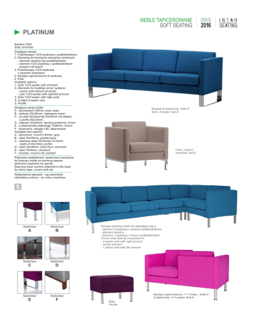 MEBLE TAPICEROWANE SOFT SEATING KATALOG CATALOG PLATINUM Kanapa, fotel Sofa, armchair Dostępne wersje: 1. Fotel/kanapa 1/2/3-osobowa z podłokietnikami 2. Elementy do tworzenia zestawów narożnych: - element narożny bez podłokietników - element 1/2/3-osobowy z podłokietnikiem prawym lub lewym 3. Fotel/kanapa 1/2/3-osobowa z wysokim ściankami 4. Kanapa naprzemienna 2-osobowa 5. Pufa Available options: 1. Sofa 1/2/3-seater with armrests 2. Elements for building corner systems: - corner sofa without armrests - sofa 1/2/3-seater with right/left armrest 3. Sofa 1/2/3-seater with high walls 4. 2-sided 2-seater sofa 5. Pouffe Dostępne opcje nóżek: A - aluminiowe f.40mm, kolor szary B - stalowe 30x30mm, malowane szare C - ze stali nierdzewnej 30x30mm na stelażu z profilu 40x10mm D - stalowe 30x30mm, łączone przód-tył, chrom E - z płaskownika stalowego 70x6mm, chrom F - drewniane, okrągłe f.40, lakierowane Available feet options: A - aluminium, round d.40mm, grey B - steel 30x30mm, painted grey C - stainless steel 30x30mm on frame made of 40x10mm profile D - steel 30x30mm, back-front, chromed E - steel 70x6mm, chromed F - wooden, round d.40, painted Kanapa 3-miejscowa, nóżki E Sofa, 3-seater, feet E Fotel, nóżki D Armchair, feet D Poduszka siedziskowa i oparciowa mocowana do korpusu mebla za pomocą rzepów, pokrowce zapinane na zamek. Seat and back cushion attached to the body by velcro tape, covers with zip. Wybarwienia tapicerki - wg wzorników Upholstery colours - as colour swatches S Nóżki/feet Nóżki/feet A B Nóżki/feet Nóżki/feet C D Nóżki/feet Nóżki/feet E F Kanapa narożna (nóżki B) składająca się z: - element 3-osobowy z prawym podłokietnikiem - element narożny - element 1-osobowy z lewym podłokietnikiem Corner sofa (feet B) composed of: - 3-seater sofa with right armrest - corner element - 1 seater sofa with left armrest Kanapa naprzemienna, 1+1-miejs., nóżki A 2-sided sofa, 1+1-seater, feet A Pufa Pouffe MEBLE TAPICEROWANE SOFT SEATING KATALOG CATALOG PLATINUM Kanapa 3-osobowa Nóżki typ E 3-seat sofa Feet type E 450 450 450 750 790 KF-PLATINUM-3E Kanapa 2-osobowa Nóżki typ D 2-seat sofa Feet type D 790 KF-PLATINUM-2D Fotel Nóżki typ D Armchair Feet type D 790 KF-PLATINUM-1D 750 1320 750 1890 Kanapa 3-osobowa Nóżki typ A 3-seat sofa Feet type A 790 450 450 450 660 1500 KF-PLATINUM-X-3A Kanapa 2-osobowa Nóżki typ A 2-seat sofa Feet type A 1500 KF-PLATINUM-X-2A Fotel Nóżki typ A Armchair Feet type A 1500 KF-PLATINUM-X-1A 750 790 1840 790