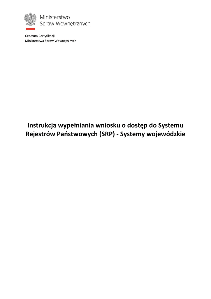 Centrum Certyfikacji Ministerstwa Spraw Wewnętrznych Instrukcja wypełniania wniosku o dostęp do Systemu Rejestrów Państwowych (SRP) ‐ Systemy wojewódzkie Informacje Instrukcja zawiera ogólne zasady wypełniania wniosku o dostęp do Systemu Rejestrów Państwowych (SRP) – Systemy wojewódzkie. Na podstawie wniosku zapewniany jest dostęp do Systemu Rejestrów Państwowych dla Urzędów Wojewódzkich, które dla realizacji swoich obowiązków posiadają dedykowany system umożliwiający komunikowanie się z SRP za pomocą usług WebService. Na podstawie wniosku przydzielany jest dostęp wyłącznie do środowiska produkcyjnego (zawierającego rzeczywiste dane osobowe). Wraz z uzyskaniem dostępu do rejestrów w środowisku produkcyjnym wnioskujący otrzymuje certyfikaty niezbędne do połączenia z Systemem Rejestrów Państwowych. Są to: certyfikat dla systemu (którym wnioskujący będzie podpisywał wszystkie zapytania przesłane do SRP) oraz certyfikat dla urządzenia, który jest wydawany tylko wtedy, gdy wnioskujący korzysta z niezaufanej sieci łączącej go z rejestrami. W przypadku korzystania przez wnioskującego z zaufanej sieci dostępowej do rejestrów (np. PESEL‐NET) wnioskujący otrzyma tylko certyfikat dla systemu. Kwestię, czy wnioskujący będzie potrzebował samego certyfikatu dla systemu czy pary kluczy system‐ urządzenie rozstrzyga MSW. Wnioskujący jest właścicielem certyfikatu. Odpowiada za: ¾ prawidłowe użytkowanie certyfikatu, ¾ przechowywanie certyfikatu zgodnie z jego przeznaczeniem, ¾ zabezpieczenie certyfikatu przed udostępnieniem osobom postronnym. UWAGA. Certyfikaty dla systemów i urządzeń wydawane są w formie plików *.p12 zabezpieczonych hasłem. W związku z powyższym wnioskujący jest zobowiązany dostarczyć nośnik, na którym zostaną zapisane dane. Dopuszczalnymi nośnikami są płyty: CD‐R, CD‐RW, DVD‐ R, DVD‐RW oraz pamięć flash USB. Przed wypełnieniem wniosku o dostęp do Systemu Rejestrów Państwowych użytkownik jest zobowiązany do zapoznania się z dokumentem „Polityka Certyfikacji dla urządzeń infrastruktury pl.ID”. O uzyskanie dostępu i otrzymanie certyfikatów wnioskuje w imieniu jednostki osoba fizyczna. Poprawnie wypełniony wniosek wraz z niezbędnymi podpisami należy przesłać na adres: Ministerstwo Spraw Wewnętrznych Departament Ewidencji Państwowych ul. Pawińskiego 17/21 02‐106 Warszawa Opracowano przez Centrum Certyfikacji Ministerstwa Spraw Wewnętrznych ul. Pawińskiego 17/21 02‐106 Warszawa, Polska msw.gov.pl 2/4 Zasady dotyczące wypełniania wniosku W punkcie 1 należy wskazać cel złożenia wniosku: a) zapewnienie dostępu dla nowego systemu ‐ w przypadku, gdy wnioskujący składa wniosek po raz pierwszy, lub gdy dotyczy on systemu lub urządzenia innego niż te, dla których posiada obecnie dostęp. Efektem jest zapewnienie dostępu do rejestrów i otrzymanie certyfikatów ‐ na system oraz opcjonalnie na urządzenie; b) zmianę danych ‐ w przypadku, gdy wnioskujący składa wniosek o zmianę danych; c) recertyfikację ‐ w przypadku, gdy zbliża się koniec ważności aktualnie używanego certyfikatu (lub certyfikatów); d) usunięcie dostępu dla systemu ‐ w przypadku, gdy wnioskujący zaprzestaje korzystania z rejestrów, do których wcześniej uzyskał dostęp. Usunięcie konta wiąże się również z unieważnieniem certyfikatów. W punkcie 2 należy wpisać dane jednostki organizacyjnej (wraz z ulicą i numerem domu/lokalu) wnioskującej o dostęp. W podpunkcie c) kod województwa należy wpisać dwucyfrowy kod Województwa. W punkcie 3 należy wpisać dane osoby, która w imieniu jednostki występuje o dostęp do rejestrów. Osoba ta odpowiada za kontakty jednostki z MSW w procesie uzyskiwania dostępu do SRP. W punkcie 4 należy wybrać rejestry, do których dostęp ma posiadać wnioskujący. Dopuszcza się możliwość wyboru następujących rejestrów: a) PESEL ‐ Powszechny Elektroniczny System Ewidencji Ludności; b) RDO ‐ Rejestr Dowodów Osobistych (dawne OEWiUDO); Do każdego z rejestrów możliwy jest dostęp za pomocą kilku typów usług, które wnioskujący powinien wybrać podczas składania wniosku: a) Usługi wyszukiwania ‐ wyszukiwanie danych w rejestrze za pomocą różnych kryteriów ( np. imienia, nazwiska, danych adresowych); b) Usługi udostępniania ‐ udostępnianie przez system SRP do systemu wnioskującego danych konkretnych osób dla których podano na wejściu usługi numer PESEL (lub inny identyfikator); c) Usługi weryfikacji ‐ usługi zwracające wyłącznie odpowiedź typu TAK/NIE (true/false) stwierdzającą, czy dane podane na wejściu usługi są zgodne z danymi znajdującymi się w rejestrze; d) Usługi subskrypcji ‐ usługa informująca użytkownika o zmianach zachodzących w rejestrze dla danych, do których użytkownik posiada uprawnienia (np. informacja zwrotna do użytkownika za każdym razem, gdy zostanie unieważniony dowód osobisty obywatela). Opracowano przez Centrum Certyfikacji Ministerstwa Spraw Wewnętrznych ul. Pawińskiego 17/21 02‐106 Warszawa, Polska msw.gov.pl 3/4 Punkt 5 należy wypełnić w przypadku odbioru osobistego certyfikatu w MSW. Podpunkty a) Rodzaj dokumentu tożsamości i b) Seria dokumentu tożsamości należy wypełnić, gdy wnioskujący (lub osoba przez niego wyznaczona) zamierza osobiście odebrać nośnik z danymi wraz z hasłem w Centrum Certyfikacji MSW. Podpunkty c) Imię i d) Nazwisko należy wypełnić w przypadku, jeżeli nośnik z danymi i hasłem odbiera osoba wyznaczona przez wnioskującego. Odbiór osobisty wymaga wcześniejszego uzgodnienia terminu. W przypadku pozostawienia pustych pól w punkcie 4, nośnik z danymi oraz hasło zostaną przesłane pocztą w dwóch oddzielnych przesyłkach na adres jednostki podany przez wnioskującego w punkcie 2 wniosku. Wydrukowany wniosek o uzyskanie dostępu należy opatrzyć podpisem osoby składającej wniosek w imieniu