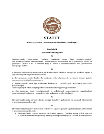 STATUT Stowarzyszenia: „Towarzystwo Produktu Górskiego” Rozdział I Postanowienia ogólne §1 Stowarzyszenie Towarzystwo Produktu Górskiego zwane dalej „Stowarzyszeniem” jest Stowarzyszeniem dobrowolnym i samorządnym zrzeszeniem osób fizycznych, działa na podstawie Ustawy z dn. 7 kwietnia 1989 r. Prawo o stowarzyszeniach oraz postanowień niniejszego statutu. §2 1. Terenem działania Stowarzyszenia jest Rzeczpospolita Polska, szczególnie polskie Karpaty, a jego siedzibą jest miejscowość Ludźmierz. 2. Stowarzyszenie może działać dla realizacji celów statutowych na terenie innych państw z poszanowaniem tamtejszego prawa. 3. Stowarzyszenie może być członkiem krajowych i zagranicznych organizacji rolniczych, gospodarczych i samorządowych o tym samym profilu działania zachowując swoją autonomie. 4. Stowarzyszenie może współpracować z podmiotami gospodarczymi, pozarządowymi krajowymi i zagranicznymi o podobnym profilu działania. organizacjami §3 Stowarzyszenie może używać odznak, pieczęci i znaków graficznych na zasadach określonych w przepisach szczegółowych. §4 Stowarzyszenie ma prawo zakładania oddziałów i ognisk wg zasad organizacyjnych, określonych w przepisach szczegółowych. 1. Stowarzyszenie posiada odrębną osobowość prawną. Oddziały mogą podjąć starania o uzyskanie osobowości prawnej po otrzymaniu pisemnej zgody Zarządu Stowarzyszenia. W ramach własnej osobowości prawnej Oddziały mogą prowadzić działalność gospodarczą i rozliczenia finansowe. 2. Oddział musi składać się z minimum 10 członków. 3. Oddział występuje pod nazwą Stowarzyszenia z dodaniem nazwy miejscowości, w której znajduje się siedziba lub określeniem subregionu na, którym działa Oddział. 4. Decyzję o akceptacji powstania, bądź rozwiązania Oddziału Stowarzyszenia w drodze uchwały podejmuje Zarząd Stowarzyszenia. §5 Stowarzyszenie opiera swoją działalność przede wszystkim na pracy społecznej członków, a do prowadzenia spraw może zatrudnić pracowników lub zlecać podmiotom gospodarczym usługi do wykonywania w ramach celów statutowych Stowarzyszenia. §6 Stowarzyszenie posiada osobowość prawną i powołane jest na czas nieokreślony. §7 Stowarzyszenie może prowadzić działalność gospodarczą z której dochody służyć będą wspomaganiu działalności statutowej. Rozdział II Cele i sposoby działania Stowarzyszenia §8 Celem Stowarzyszenia jest: 1. Popieranie i rozwój produktu górskiego, tradycyjnego i regionalnego. 2. Działanie na rzecz producentów tradycyjnych i regionalnych produktów wytwarzanych na terenach Karpat pochodzenia zwierzęcego i roślinnego, szczególnie serów, wędlin, ryb i miodów. 3. Wdrażanie systemu jakości produktów rolnych ujętych w rozporządzeniach UE dotyczących produktu górskiego. 4. Podejmowanie działań promocyjno - edukacyjnych i upowszechnianie wiedzy na temat produktów regionalnych. 5. Wspieranie rozwoju tradycyjnej kultury regionalnej. 6. Działanie na rzecz zrównoważonego rozwoju Karpat w oparciu o Konwencję Karpacką. 7. Ochrona naturalnego środowiska i promowanie zdrowego trybu życia. 8. Organizowanie konferencji, seminariów, warsztatów i szkoleń w zakresie podnoszenia jakości produktów regionalnych i utrzymania dziedzictwa kulturowego. 9. Dbanie o utrzymanie charakterystycznego rolnictwa na terenach górskich. 10. Budowanie wokół produktu górskiego partnerstwa lokalnego osób i środowisk mających na celu wzmocnienie znaczenia produktów regionalnych. 11. Wspieranie inicjatyw zmierzających do tworzenia szlaków kulinarnych opartych o produkty górskie. 12. Upowszechnianie wiedzy na temat produktów regionalnych, szczególnie wśród młodzieży uczących się w szkołach. 13. Reprezentowanie interesów producentów górskich produktów regionalnych przed instytucjami samorządowymi i państwowymi. tradycyjnych i 14. Wspieranie zrównoważonego rozwoju turystyki górskiej. 15. Wspieranie aktywności zawodowej i przedsiębiorczości producentów produktów górskich. 16. Wzmocnienie współpracy międzysektorowej, międzynarodowej, międzyregionalnej i międzypokoleniowej. §9 Towarzystwo realizuje swoje cele przez : 1. Prowadzenie działalności informacyjno – promocyjnej, wydawniczej i edukacyjno – szkoleniowej. 2. Organizowanie wystaw, targów kraju i zagranicą. i wydarzeń promocyjnych i okolicznościowych w 3. Propagowanie poprzez różnego rodzaju media znaczenia i jakości produktów górskich. 4. Nawiązywanie i utrzymywanie kontaktów z organizacjami krajowymi i zagranicznymi o wspólnym celu działania. 5. Wykonywanie i przygotowywanie produktów górskich. analiz, raportów, opracowań dotyczących 6. Wprowadzanie i stosowanie wspólnych opakowań i oznakowań produktu górskiego. 7. Udzielanie pomocy młodzieży kształcącej się w zakresie gastronomi i produkcji produktów regionalnych. 8. Udział w opracowywaniu strategicznych planów rozwoju regionu. 9. Działalność doradczą producentów produktów górskich. 10. Wsparcie finansowe i pozafinansowe osób i instytucji oraz regranting. 11. Promocję obszarów wiejskich i górskich. 12. Wspieranie małych i średnich producentów produktów górskich. 13. Pozyskiwanie środków europejskich i krajowych na cele statutowe. 14. Organizowanie i wspieranie tworzenia ośrodków, centrów produktu regionalnego, punktów sprzedaży i dystrybucji. 15. Inne działania zgodne z prawem niewymienione w ust. 1) – 16) służące realizacji celów statutowych Stowarzyszenia. Rozdział III Członkowie Towarzystwa, ich prawa i obowiązki §10 Stowarzyszenie zrzesza członków zwyczajnych, honorowych i wspierających. §11 1. Członkami zwyczajnymi Stowarzyszenia stają się wszyscy uczestnicy zebrania założycielskiego Towarzystwa 2. Członkiem zwyczajnym Stowarzyszenia może być każda pełnoletnia osoba fizyczna o pełnej zdolności do czynności prawnych, która złoży deklaracje i zost