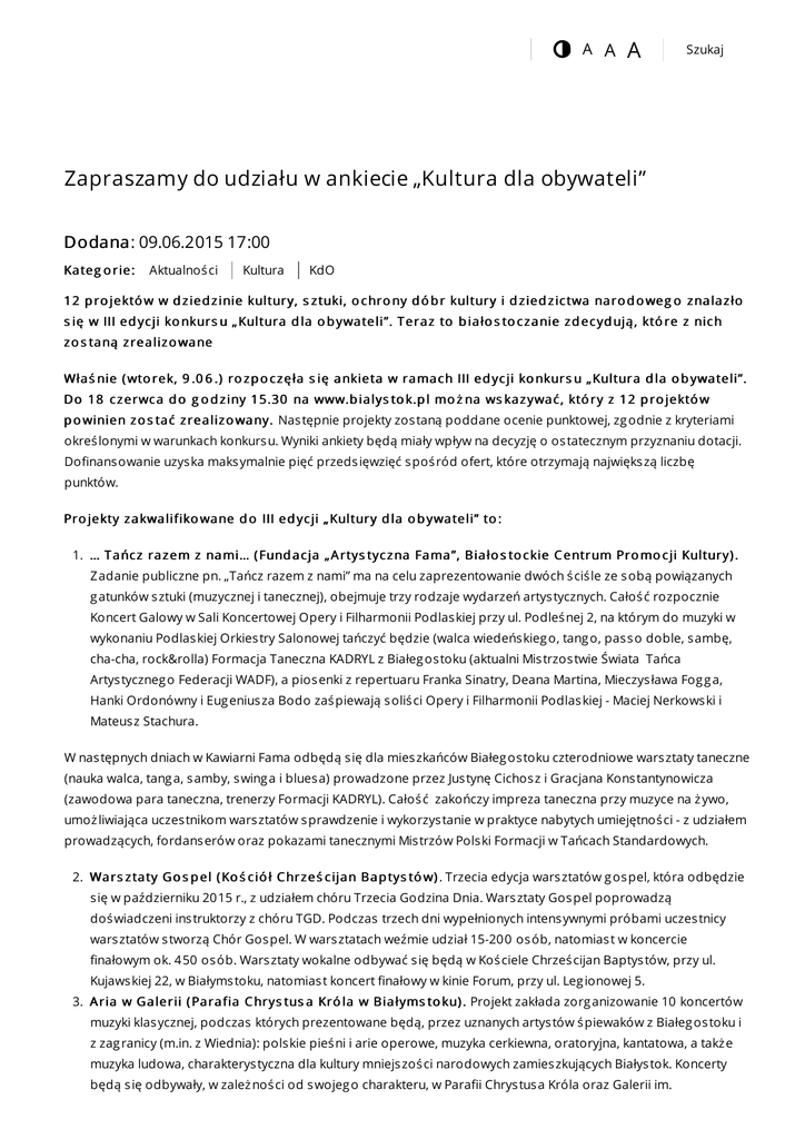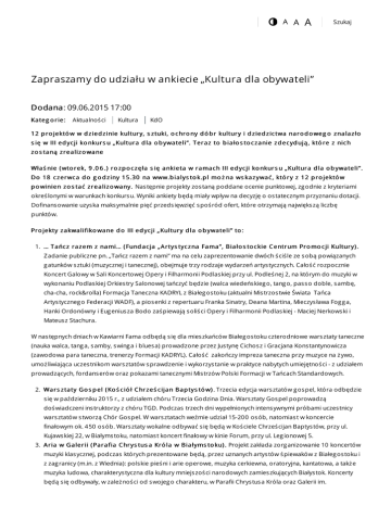A A A Szukaj Zapraszamy do udziału w ankiecie „Kultura dla obywateli” Dodana : 09.06.2015 17:00 Ka te g o rie : Aktualnoś ci Kultura KdO 12 p ro je któ w w d z ie d z inie kultury, s z tuki, o c hro ny d ó b r kultury i d z ie d z ic twa na ro d o we g o z na la z ło s ię w III e d yc ji ko nkurs u „Kultura d la o b ywa te li”. T e ra z to b ia ło s to c z a nie z d e c yd ują , któ re z nic h z o s ta ną z re a liz o wa ne Wła ś nie ( wto re k, 9 .0 6 .) ro z p o c z ę ła s ię a nkie ta w ra ma c h III e d yc ji ko nkurs u „Kultura d la o b ywa te li”. D o 18 c z e rwc a d o g o d z iny 15.30 na www.b ia lys to k.p l mo ż na ws ka z ywa ć , któ ry z 12 p ro je któ w p o winie n z o s ta ć z re a liz o wa ny. Nas tępnie projekty zos taną poddane ocenie punktowej, zg odnie z kryteriami okreś lonymi w warunkach konkurs u. Wyniki ankiety będą miały wpływ na decyzję o os tatecznym przyznaniu dotacji. Dofinans owanie uzys ka maks ymalnie pięć przeds ięwzięć s poś ród ofert, które otrzymają najwięks zą liczbę punktów. Pro je kty z a kwa lifiko wa ne d o III e d yc ji „Kultury d la o b ywa te li” to : 1. … T a ńc z ra z e m z na mi… ( Fund a c ja „A rtys tyc z na Fa ma ”, B ia ło s to c kie C e ntrum Pro mo c ji Kultury) . Z adanie publiczne pn. „Tańcz razem z nami” ma na celu zaprezentowanie dwóch ś ciś le ze s obą powiązanych g atunków s ztuki (muzycznej i tanecznej), obejmuje trzy rodzaje wydarzeń artys tycznych. Całoś ć rozpocznie Koncert Galowy w Sali Koncertowej Opery i Filharmonii Podlas kiej przy ul. Podleś nej 2, na którym do muzyki w wykonaniu Podlas kiej Orkies try Salonowej tańczyć będzie (walca wiedeńs kieg o, tang o, pas s o doble, s ambę, cha-cha, rock&rolla) Formacja Taneczna KADRYL z Białeg os toku (aktualni Mis trzos twie Świata Tańca Artys tyczneg o Federacji WADF), a pios enki z repertuaru Franka Sinatry, Deana Martina, Mieczys ława Fog g a, Hanki Ordonówny i Eug enius za Bodo zaś piewają s oliś ci Opery i Filharmonii Podlas kiej - Maciej Nerkows ki i Mateus z Stachura. W nas tępnych dniach w Kawiarni Fama odbędą s ię dla mies zkańców Białeg os toku czterodniowe wars ztaty taneczne (nauka walca, tang a, s amby, s wing a i blues a) prowadzone przez Jus tynę Cichos z i Gracjana Kons tantynowicza (zawodowa para taneczna, trenerzy Formacji KADRYL). Całoś ć zakończy impreza taneczna przy muzyce na ż ywo, umoż liwiająca uczes tnikom wars ztatów s prawdzenie i wykorzys tanie w praktyce nabytych umiejętnoś ci - z udziałem prowadzących, fordans erów oraz pokazami tanecznymi Mis trzów Pols ki Formacji w Tańcach Standardowych. 2. Wa rs z ta ty G o s p e l ( Ko ś c ió ł C hrz e ś c ija n B a p tys tó w) . Trzecia edycja wars ztatów g os pel, która odbędzie s ię w październiku 2015 r., z udziałem chóru Trzecia Godzina Dnia. Wars ztaty Gos pel poprowadzą doś wiadczeni ins truktorzy z chóru TGD. Podczas trzech dni wypełnionych intens ywnymi próbami uczes tnicy wars ztatów s tworzą Chór Gos pel. W wars ztatach weźmie udział 15-200 os ób, natomias t w koncercie finałowym ok. 450 os ób. Wars ztaty wokalne odbywać s ię będą w Koś ciele Chrześ cijan Baptys tów, przy ul. Kujaws kiej 22, w Białyms toku, natomias t koncert finałowy w kinie Forum, przy ul. Leg ionowej 5. 3. A ria w G a le rii ( Pa ra fia C hrys tus a Kró la w B ia łyms to ku) . Projekt zakłada zorg anizowanie 10 koncertów muzyki klas ycznej, podczas których prezentowane będą, przez uznanych artys tów ś piewaków z Białeg os toku i z zag ranicy (m.in. z Wiednia): pols kie pieś ni i arie operowe, muzyka cerkiewna, oratoryjna, kantatowa, a takż e muzyka ludowa, charakterys tyczna dla kultury mniejs zoś ci narodowych zamies zkujących Białys tok. Koncerty będą s ię odbywały, w zależ noś ci od s wojeg o charakteru, w Parafii Chrys tus a Króla oraz Galerii im. Sleńdzińs kich w Białyms toku. Sleńdzińs kich w Białyms toku. 4. Wyc ho wa nie p rz e z s z tukę ( T o wa rz ys two Prz yja c ió ł U niwe rs yte tu Muz yc z ne g o w B ia łyms to ku) . W roku 2015 przypada X-lecie org anizacji s eminariów Wychowanie Przez Sztukę. Projekt rozpocznie otwarta dla ws zys tkich uczes tników konferencja KO-RESPONDENCJA. NA STYKU SZ TUK. Celem konferencji jes t zas tanowienie s ię nad s zeroko pojętymi konteks tami s ztuki, jej wielowymiarowoś cią i wzajemnym przenikaniem s ię róż nych dys cyplin. Konferencja KO-RESPONDENCJA. Na s tyku s ztuk ma rozbudzić zainteres owanie róż nymi dziedzinami s ztuki i być preteks tem do pos zukiwań twórczych. Dla uczes tników wars ztatów to preteks t do twórczeg o nauczania i rozwijania zainteres owań kulturą ws zys tkich odbiorców s ztuki od najmłods zych do najs tars zych. Konferencja będzie otwarta dla ws zys tkich zainteres owanych. Odbiorcą wars ztatów jes t g rupa nauczycieli, którzy dzięki s potkaniom Wychowanie Przez Sztukę uczą s ię aktywneg o nauczania, innowacyjnych metod pracy z najmłods zymi dziećmi i poznają prog ramy edukacji artys tycznej. Z a ich poś rednictwem – projekt Wychowania Przez Sztukę trafia do znaczącej więks zoś ci s zkół i przeds zkoli Białeg os toku. W projekcie przekazuje s ię nowe narzędzia pracy, aby poprzez nauczycieli rozwijać w dzieciach potrzebę kontaktu ze s ztuką. Uczes tnicy otrzymują materiały przys tos owane do natychmias toweg o wdroż enia w ż ycie. Gotowe materiały wydawnicze pozwalają im na utrwalenie pomys łów i błys kawiczne zas tos owanie ich w pracy z dziećmi. 5. Kultura lne Po lo wa nie z H e tma ne m – fe s tyn re ko ns trukc yjny ( Fund a c ja „Pro A nima ”) . Tradycje związane z polowaniami i łowiectwem były bardzo blis kie Hetmanowi Branickiemu, o czym ś wiadczą pozos tałoś ci w nazwach dzielnic Białeg os toku tj. Las Z wierzyniecki czy Baż antarnia. Z g odnie ze zwyczajami łowieckimi po ś w. Hubercie (3 XI) or