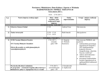 Powiatowy Młodzieżowy Dom Kultury i Sportu w Wieluniu HARMONOGRAM IMPREZ FERYJNYCH Ferie zimowe 2017 r. 16.01. – 27.01.2017 r. L.p. Nazwa imprezy (rodzaj zajęć) 1) Gitarowy Koncert Kolęd Data – dzień Osoby tygodnia, godz. odpowiedzialne rozpoczęcia zajęć, imprezy PONIEDZIAŁEK, 16.01.2017 r. 17.30 Andrzej Freus 2) Taniec towarzyski 3) XVIII Turniej Młodych Fizyków XVI Turniej Młodych Chemików 15.30 – 17.10 17.15 – 18.55 WTOREK, 17.01.2017 r. 17.01.2017 r. (wtorek) godz. 9.00 17.01.2017 r. (wtorek)Wyjazd godz. 7.30 Sala taneczna Rafał Janecki Sala językowa Z. Stojecka E. WielochKostrzewa Sala taneczna PMDKiS, sala językowa multimedialna prezentacja nagrodzonych fotografii z XIV Ogólnopolskiego konkursu fizycznofotograficznego „Zjawiska fizyczne wokół nas” ciekawe doświadczenia i zabawki fizyczne prezentacja multimedialna uczniów nagrodzonych na ogólnopolskich konkursach fizycznych Oferta dla uczniów ze szkół gimnazjalnych i ponadgimnazjalnych Wycieczka dla dzieci i młodzieży W programie: - zwiedzanie kopalni odkrywkowej w Bełchatowie- pobyt w Aquaparku FALA w Łodzi Uwagi – miejsce realizacji imprezy J. Nowakowski Z. Szpikowski 4) Rytmika (gr. wtorkowa) razem 2 15.30 – 16.30 G. Kaczmarek Sala taneczna 5) Plastyka 17.00 – 18.30 Joanna Dudek Pracownia plastyczna 6) Feryjny turniej piłki siatkowej dla szkół ponadgimnazjalnych 8.30 7) Zimowy koncert „Narodziła nam się miłość” II LO ŚRODA, 18.01.2017 r. 18.00 Zofia Szpikowska Próba 10.00 – 14.00 Aneta Włodarczyk Sala taneczna 8) Taniec towarzyski 15.00 – 16.40 Rafał Janecki Sala językowa 9) Zajęcia teatralno-filmowe 16.10 – 17.40 Jarosław Strzała Sala nr 1 10 Plastyka ) 17.00 – 18.30 Joanna Dudek Pracownia plastyczna 11 Wycieczka do Wrocławia ) Program wycieczki: - spektakl „Noc bez księżyca” w Teatrze Lalek - zwiedzanie ZOO i Afrykarium 12 ) Taniec towarzyski 13 ) Zajęcia teatralne CZWARTEK, 19.01.2017 r. 19.01.2017 r. Zofia Szpikowska (czwartek) Zbigniew Szpikowski Wyjazd godz. 7.00 15.30 – 17.10 17.10 – 18.50 Rafał Janecki Sala taneczna 15.00 – 16.30 16.30 – 19.30 Jarosław Strzała Sala językowa 14 ) Taniec nowoczesny 15 ) Turniej mini siatkówki 3 PIĄTEK, 20.01.2017 r. III gr. 12.00 – 13.30 II gr. – 13.30 – 14.45 I gr. – 14.45 – 16.00 Godz. 9.00 Grażyna Kaczmarek Arkadiusz Górny Szkoła Podstawowa w Wierzchlesie PONIEDZIAŁEK, 23.01.2017 r. 16 Godz. 9.00 Wanda Lewik ) Piotr Owczarek Turniej tenisa stołowego dla szkół podstawowych 17 ) Sala taneczna Sala taneczna Godz. 15.30 – 18.30 Jolanta Łuczak Sala plastyczna 18 Taniec towarzyski (grupa najmłodsza) ) Taniec towarzyski (grupa 10 – 14 lat) Godz. 12.00 – 15.30 Rafał Janecki Godz. 15.30 – 19.00 Sala taneczna 19 Próba chóru (grupa średnia i najstarsza) ) Godz. 16.30 – 19.30 Jakub Jurdziński Sala językowa Otwarte warsztaty plastyczne (dzieci od lat 7) 20 ) Turniej Mini siatkówki „Trójki” 21 Bal kostiumowy dla najmłodszych ) 22 ) Język niemiecki – gry i zabawy językowe Godz. 9.00 Leszek Pałyga WTOREK, 24.01.2017 r. 24.01.2017 r. R. Janecki (wtorek), godz. 16.00 G. Kaczmarek D. Baranowska E. Kapral Gr. mł. - godz. 10.00 – Joanna Kucharczyk 11.30 Gr. star. – godz. 11.30 Szkoła Podstawowa nr 2 w Wieluniu sala taneczna sala nr 8 4 – 13.00 23 ) Otwarte warsztaty plastyczne (dzieci od lat 7) Godz. 15.30 – 17.00 Jolanta Łuczak Sala plastyczna 24 Gitara (grupa wtorkowa) ) Godz. 12.00 – 13.30 Andrzej Freus Godz. 13.30 – 15.00 Sala nr 3 25 Gitara (grupa środowa) ) Godz. 15.00 – 16.30 Andrzej Freus Godz. 16.30 – 18.00 Sala nr 3 26 Plastyka ) 27 ) Maraton zumby 28 ) XIII Feryjna akcja „Poszukujemy wokalnych perełek” 17.00 – 18.30 Joanna Dudek ŚRODA, 25.01.2017 r. Godz. 14.00 – 16.00 Edyta Kapral Godz. 10.00 Pracownia plastyczna Sala taneczna Zofia Szpikowska Sala taneczna Aneta Włodarczyk Zbigniew Szpikowski 29 ) Taniec towarzyski Godz. 15.00 – 16.40 Rafał Janecki Sala językowa 30 Zajęcia teatralno-filmowe ) Godz. 16.10 – 17.40 Jarosław Strzała Sala nr 1 CZWARTEK, 26.01.2017 r. 31 26.01.2017 r. ) Uroczyste zakończenie ferii zimowych (czwartek) Wręczenie nagród laureatom: - Turnieju młodych przyrodników g. 11.00 - XVIII Wojewódzkiego konkursu plastycznego, pn. s. taneczna 5 „Inaczej niż u nas” - XIII Feryjnej akcji „Poszukujemy wokalnych perełek” Zofia Szpikowska Zbigniew Szpikowski (występy wokalne i keyboardzistów) 32 ) Taniec towarzyski 33 ) Taniec nowoczesny 34 Zespół muzyki dawnej ) Chór (grupa średnia i starsza zaawansowana) Grupa najmłodsza (kl. I – III) 1) Turniej piłki ręcznej rocznik 2006 15.30 – 17.10 17.10 – 18.50 PIĄTEK, 27.01.2017 III gr. 12.00 – 13.30 II gr. – 13.30 – 14.45 I gr. – 14.45 – 16.00 Godz. 12.00 – 13.30 Rafał Janecki Sala taneczna Grażyna Kaczmarek Sala taneczna Jakub Jurdziński Sala nr 3 Wojciech Psuja Biała Godz. 13.30 – 15.00 Godz. 15.00 – 16.40 NIEDZIELA, 29.01.2017 Godz. 9.00 – 16.00