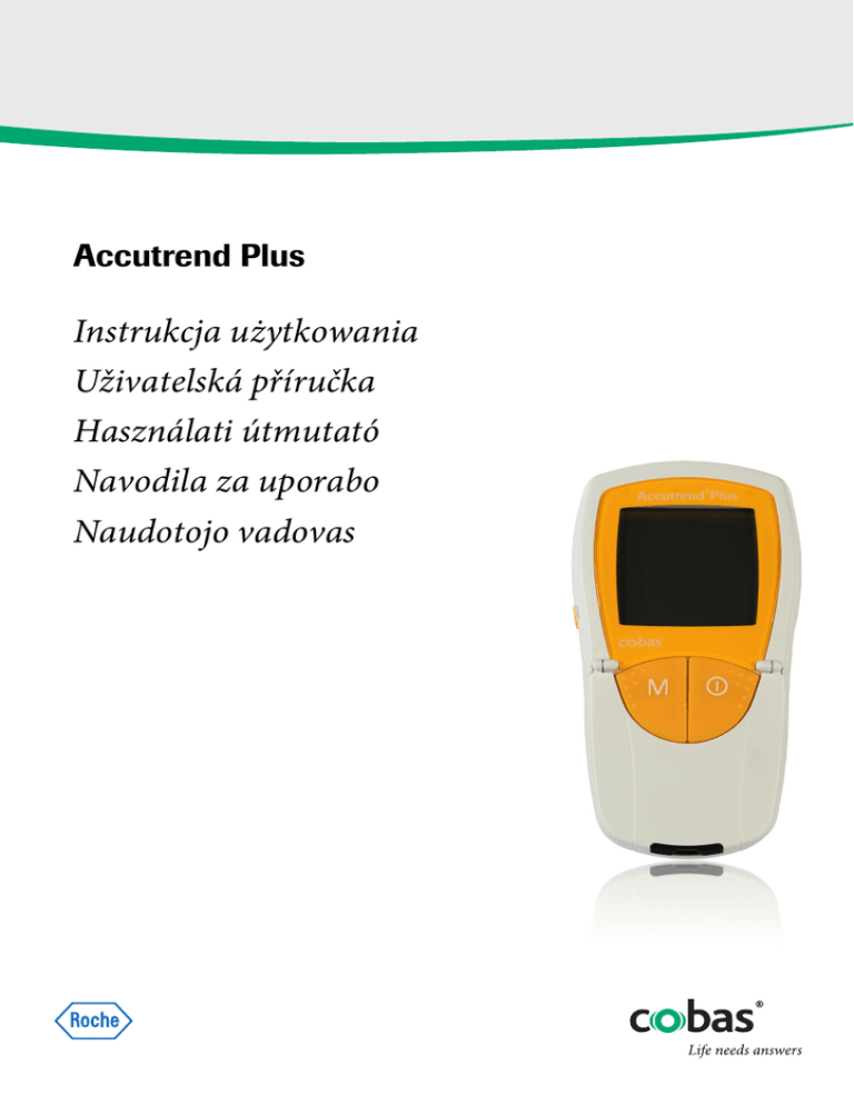 Accutrend Plus Instrukcja użytkowania Uživatelská příručka Használati útmutató Navodila za uporabo Naudotojo vadovas Wersja instrukcji Data zmiany Zmiany Wersja 1.0 2007-03 Nowy dokument Wersja 2.0 2011-06 Nowy układ instrukcji; aktualizacja treści; poprawa wyglądu informacji dotyczących bezpieczeństwa. Accutrend® Plus Instrukcja użytkowania . 0 6406955001 (01) 2011-06 PL-CZ-HU-SL-LT ©2011 Roche Diagnostics. Wszelkie prawa zastrzeżone Treść niniejszego dokumentu wraz ze wszystkimi obrazami graficznymi stanowi własność firmy Roche Diagnostics. Informacje zawarte w dokumencie mogą zostać zmienione bez powiadomienia. Firma Roche Diagnostics nie odpowiada za zawarte w niniejszym dokumencie błędy techniczne lub redakcyjne ani za fragmenty pominięte. Kopiowanie lub przekazywanie jakiejkolwiek części niniejszego dokumentu w dowolnej postaci i jakimikolwiek metodami elektronicznymi lub mechanicznymi, w jakimkolwiek celu, jest niedozwolone bez wyraźnego pisemnego zezwolenia firmy Roche Diagnostics. Pytania i uwagi dotyczące niniejszej instrukcji należy kierować do lokalnego przedstawiciela firmy Roche. ACCU-CHEK, ACCU-CHEK MULTICLIX, ACCUTREND, COBAS i SAFE-T-PRO są znakami towarowymi firmy Roche. Wszystkie inne znaki towarowe są chronione prawem autorskim. Aparat został wyprodukowany i sprawdzony zgodnie z normą EN 61010-1 („Wymagania bezpieczeństwa elektrycznych przyrządów pomiarowych, automatyki i urządzeń laboratoryjnych; Część 1: Wymagania ogólne”) i w chwili opuszczenia fabryki odpowiadał wymogom bezpieczeństwa. Aby zachować ten stan rzeczy i zapewnić sobie bezpieczną obsługę urządzenia, użytkownik musi postępować zgodnie ze wskazówkami i ostrzeżeniami zamieszczonymi w niniejszej instrukcji. Użytkownik ponosi całkowitą odpowiedzialność za instalację, użytkowanie i konserwację aparatu Accutrend Plus. Poniżej przedstawiono symbole, które mogą znajdować się na opakowaniu i płytce znamionowej aparatu, wraz z wyjaśnieniem ich znaczenia: Uwaga, należy zapoznać się z dołączoną dokumentacją. Zapoznać się z uwagami związanymi z bezpieczeństwem, zawartymi w instrukcji użytkownika. Przestrzegać zakresu temperatury (Przechowywać w temp.) Użyć przed Producent Kod partii Numer katalogowy Wyrób do diagnostyki in vitro 0123 Ten produkt spełnia wymogi Dyrektywy Wspólnoty Europejskiej 98/79/EC dotyczącej diagnostycznych urządzeń medycznych do stosowania in vitro. Sprawdź w instrukcji obsługi System spełnia kanadyjskie i amerykańskie wymagania dotyczące bezpieczeństwa (UL LISTED, zgodne z UL 61010A-1:02 i CAN/CSA-C22.2 No. 61010-1-04). 4 Wprowadzenie 7 Przed uruchomieniem urządzenia ....................................................................................................... 7 Przeznaczenie ...................................................................................................................................... 7 Ważne informacje dotyczące użytkowania............................................................................... 7 Jeśli potrzebna będzie pomoc....................................................................................................... 7 Zasada pomiaru.................................................................................................................................. 8 Kontrola zawartości opakowania ................................................................................................. 8 Ważne informacje dotyczące bezpieczeństwa oraz informacje dodatkowe........................ 9 Informacje dotyczące bezpieczeństwa..................................................................................... 10 Usuwanie systemu........................................................................................................................... 10 Ogólne zasady konserwacji.......................................................................................................... 11 Zakłócenia elektromagnetyczne................................................................................................. 11 Warunki pracy ................................................................................................................................... 12 Kontrola jakości ................................................................................................................................ 13 2 Aparat Accutrend Plus Przegląd elementów aparatu ............................................................................................................... Informacje i ikony na wyświetlaczu................................................................................................... Zasilanie ...................................................................................................................................................... 3 Rozpoczęcie pracy aparatu 19 Wkładanie baterii ..................................................................................................................................... 20 4 Ustawianie aparatu Krótki przegląd ustawień aparatu...................................................................................................... Ogólna procedura ustawiania aparatu (tryb ustawień)............................................................. Ustawianie formatu daty ....................................................................................................................... Ustawianie daty......................................................................................................................................... Ustawianie formatu godziny ................................................................................................................ Ustawianie godziny ................................................................................................................................. Ustawianie sygnału dźwiękowego..............