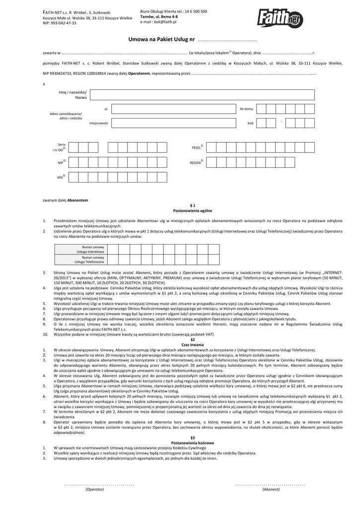 FAITH-NET s.c. R. Wróbel , S. Sutkowski Koszyce Małe ul. Wolska 38, 33-111 Koszyce Wielkie NIP: 993-042-47-33 Biuro Obsługi Klienta tel.: 14 6 500 500 Tarnów, ul. Bema 4-8 e-mail : [email protected] Umowa na Pakiet Usług nr ……………………………………………………. 1) zawarta w ………………………………………………………………………………………………….…………….. (w lokalu/poza lokalem Operatora), dnia ………………………..…………………. r. pomiędzy FAITH-NET s. c. Robert Wróbel, Stanisław Sutkowski zwaną dalej Operatorem z siedzibą w Koszycach Małych, ul. Wolska 38, 33-111 Koszyce Wielkie, NIP 9930424733, REGON 120018814 zwaną dalej Operatorem, reprezentowaną przez ….................................................................................................................. a Imię i nazwisko/ Nazwa ul. Nr domu miejscowośd kod Adres zameldowania/ adres i siedziba Seria 2) PESEL 2) i nr DO NIP KRS - 3) 3) REGON 3) zwanym dalej Abonentem §1 Postanowienia ogólne 1. 2. Przedmiotem niniejszej Umowy jest udzielanie Abonentowi ulg w miesięcznych opłatach abonamentowych wnoszonych na rzecz Operatora na podstawie odrębnie zawartych umów telekomunikacyjnych. Udzielenie przez Operatora ulg o których mowa w pkt 1 dotyczy usług telekomunikacyjnych (Usługi Internetowej oraz Usługi Telefonicznej) świadczonej przez Operatora na rzecz Abonenta na podstawie niniejszych umów: Numer umowy Usługa Interetowa Numer umowy Usługa Telefoniczna 3. 4. 5. 6. 7. 8. 9. 10. 1. 2. 3. 4. 5. 6. 7. 8. 1. 2. 3. Stroną Umowy na Pakiet Usług może zostad Abonent, który posiada z Operatorem zawartą umowę o świadczenie Usługi Internetowej (w Promocji „INTERNET20/2013”) w wybranej ofercie (MINI, OPTYMALNY, AKTYWNY, PREMIUM) oraz umowę o świadczenie Usługi Telefonicznej w wybranym planie taryfowym (50 MINUT, 150 MINUT, 300 MINUT, 10 ZŁOTYCH, 20 ZŁOTYCH, 30 ZŁOTYCH). Ulga jest ustalona na podstawie Cennika Pakietów Usług, który określa koocową wysokośd opłat abonamentowych dla usług objętych Umową. Wysokośd Ulgi to różnica między wartością opłat wynikającą z umów wymienionych w §1 pkt 2, a ceną koocową usługi określoną w Cenniku Pakietów Usług. Cennik Pakietów Usług stanowi integralną częśd niniejszej Umowy. Wysokośd udzielonej Ulgi w trakcie trwania niniejszej Umowy może ulec zmianie w przypadku zmiany opcji czy planu taryfowego usługi z której korzysta Abonent. Ulga przysługuje począwszy od pierwszego Okresu Rozliczeniowego występującego po miesiącu, w którym została zawarta Umowa. Ulgi przewidziane w niniejszej Umowie mogą byd łączone z innymi ulgami lub/i promocjami dotyczącymi usług objętych niniejszą Umową. Operatorowi przysługuje prawo odmowy zawarcia Umowy, jeżeli Abonent zalega względem Operatora z płatnościami z jakiegokolwiek tytułu. O ile z niniejszej Umowy nie wynika inaczej, wszelkie określenia oznaczone wielkimi literami, mają znaczenie nadane im w Regulaminie Świadczenia Usług Telekomunikacyjnych przez FAITH-NET s.c. Wszystkie podane w niniejszej Umowie kwoty są wartościami brutto (zawierają podatek VAT) §2 Czas trwania W okresie obowiązywania Umowy, Abonent otrzymuję Ulgi w opłatach abonamentowych za korzystanie z Usługi Internetowej oraz Usługi Telefonicznej. Umowa jest zawarta na okres 20 miesięcy licząc od pierwszego dnia miesiąca następującego po miesiącu, w którym została zawarta. Ulgi w miesięcznej opłacie abonamentowej za korzystanie z Usługi Internetowej oraz Usługi Telefonicznej Operatora określone w Cenniku Pakietów Usług, stosownie do odpowiadającego wariantu Abonenta, obowiązują przez okres kolejnych 20 pełnych miesięcy kalendarzowych. Po tym terminie, Abonent zobowiązany będzie do uiszczania opłat zgodnie z obowiązującym go umowami na usługi telekomunikacyjne Operatora. W okresie stosowania Ulg, Abonent zobowiązany jest do ponoszenia pozostałych opłat za świadczone przez Operatora usługi zgodnie z Cennikiem obowiązującym u Operatora, z wyjątkiem przypadków, gdy warunki korzystania z tych usług regulują odrębne promocje Operatora, do których przystąpił Abonent. Ulga przyznana Abonentowi w ramach niniejszej Umowy, stanowiąca podstawę ustalenia wielkości kary umownej, o której mowa jest w §2 pkt 6, nie przekracza sumy Ulg (ulga przyznana abonentowi) określonych w Cenniku Pakietów Usług. Abonent, który przed upływem kolejnych 20 pełnych miesięcy, rozwiąże niniejszą Umowę lub umowę na świadczenie usług telekomunikacyjnych wykazaną §1 pkt 2, utraci wszelkie korzyści wynikające z Umowy i będzie zobowiązany do uiszczenia na rzecz Operatora kary umownej w wysokości nie przekraczającej ulgi przyznanej mu w związku z zawarciem niniejszej Umowy, pomniejszonej o proporcjonalną jej wartośd za okres od dnia jej zawarcia do dnia jej rozwiązania. W terminie określonym w §2 pkt 2, Abonent nie może dokonad czasowego zawieszenia korzystania z usług objętych niniejszą Promocją ani przeniesienia miejsca ich świadczenia. Operator uprawniony będzie ponadto do żądania od Abonenta kary umownej, o której mowa jest w §2 pkt 5 w przypadku, gdy w okresie wskazanym w §2 pkt 2, niniejsza Umowa zostanie rozwiązana przez Operatora, bez zachowania okresu wypowiedzenia, na skutek okoliczności, za które Abonent ponosid będzie odpowiedzialnośd. §3 Postanowienia końcowe W sprawach nie unormowanych Umową mają zastosowanie przepisy Kodeksu Cywilnego Wszelkie spory wynikające z realizacji niniejszej Umowy będą rozstrzygane przez Sąd właściwy dla siedziby Operatora. Umowę sporządzono w dwóch jednobrzmiących egzemplarzach, po jednym dla każdej ze stron. ................................... (Operator) ................................... (Abonent) FAITH-NET s.c. R. Wróbel , S. Sutkowski Koszyce Małe ul. Wolska 38, 33-111 Koszyce Wielkie NIP: 