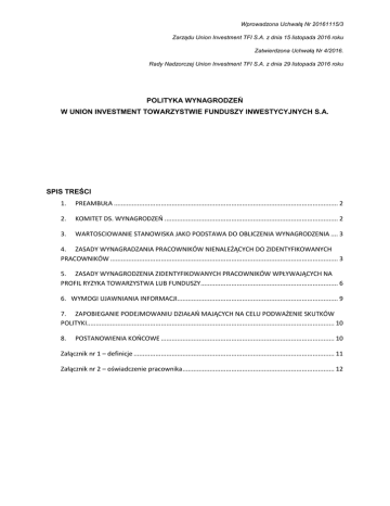 Wprowadzona Uchwałą Nr 20161115/3 Zarządu Union Investment TFI S.A. z dnia 15 listopada 2016 roku Zatwierdzona Uchwałą Nr 4/2016. Rady Nadzorczej Union Investment TFI S.A. z dnia 29 listopada 2016 roku POLITYKA WYNAGRODZEŃ W UNION INVESTMENT TOWARZYSTWIE FUNDUSZY INWESTYCYJNYCH S.A. SPIS TREŚCI 1. PREAMBUŁA ............................................................................................................................ 2 2. KOMITET DS. WYNAGRODZEŃ ................................................................................................ 2 3. WARTOSCIOWANIE STANOWISKA JAKO PODSTAWA DO OBLICZENIA WYNAGRODZENIA .... 3 4. ZASADY WYNAGRADZANIA PRACOWNIKÓW NIENALEŻĄCYCH DO ZIDENTYFIKOWANYCH PRACOWNIKÓW .............................................................................................................................. 3 5. ZASADY WYNAGRODZENIA ZIDENTYFIKOWANYCH PRACOWNIKÓW WPŁYWAJĄCYCH NA PROFIL RYZYKA TOWARZYSTWA LUB FUNDUSZY............................................................................ 6 6. WYMOGI UJAWNIANIA INFORMACJI......................................................................................... 9 7. ZAPOBIEGANIE PODEJMOWANIU DZIAŁAŃ MAJĄCYCH NA CELU PODWAŻENIE SKUTKÓW POLITYKI......................................................................................................................................... 10 8. POSTANOWIENIA KOŃCOWE ................................................................................................ 10 Załącznik nr 1 – definicje ............................................................................................................... 11 Załącznik nr 2 – oświadczenie pracownika .................................................................................... 12 Polityka wynagrodzeń Union Investment TFI S.A. 1. PREAMBUŁA Polityka została opracowana i wdrożona do stosowania w celu wdrożenia przepisów art. 47a Ustawy oraz Rozporządzenia ws. polityki wynagrodzeń. System wynagrodzeń Towarzystwa ma na celu adekwatne uhonorowanie pracy pracowników i skuteczne wdrażanie zachęt do osiągania lepszych wyników. Jednocześnie celem systemu wynagrodzeń jest zapobieganie podejmowaniu ryzyka niezgodnego z profilami ryzyka, polityką inwestycyjną, strategiami inwestycyjnymi, statutami funduszy inwestycyjnych, którymi zarządza Towarzystwo oraz regulacjami wewnętrznymi Towarzystwa. System wynagrodzeń stosowany w Towarzystwie wspiera realizację strategii prowadzenia działalności Towarzystwa i przeciwdziała powstawaniu konfliktu interesów. Politykę opracowuje, wdraża i aktualizuje Zarząd. Polityka jest zatwierdzana przez Radę Nadzorczą, po uprzednim zaopiniowaniu przez Komitet Wynagrodzeń. Realizacja Polityki podlega co najmniej raz w roku przeglądowi. Przegląd jest dokonywany przez Inspektora Nadzoru. Na podstawie przeglądu sporządzany jest pisemny raport określający stan realizacji Polityki, który jest przedstawiany Radzie Nadzorczej. Pierwszy przegląd, o którym mowa w ust. 4 powyżej, dokonywany jest w terminie do dnia 31 grudnia 2017 r. Polityka nie ma zastosowania do innych niż wynagrodzenie świadczeń związanych ze stosunkiem pracy przyznawanych pracownikom na mocy przepisów prawa pracy. 2. KOMITET DS. WYNAGRODZEŃ Komitet Wynagrodzeń Towarzystwa jest organem składającym się z co najmniej 3 członków Rady Nadzorczej, obradującym co najmniej raz w roku i wykonującym zadania określone przepisami prawa, w szczególności coroczną weryfikację istniejącego systemu wynagrodzeń na którą składa się m.in.: - opiniowanie polityki wynagrodzeń, - opiniowanie realizacji polityki wynagrodzeń. str. 2 Polityka wynagrodzeń Union Investment TFI S.A. Komitet Wynagrodzeń realizuje zadania uwzględniając konieczność zapewnienia prawidłowego i ostrożnego zarządzania ryzykiem TFI, a także szczególną dbałość o stan jego kapitałów i płynność finansową, interesy TFI oraz zarządzanych przez nie funduszy i ich uczestników w perspektywie długoterminowej oraz interesy akcjonariuszy TFI. Komitet Wynagrodzeń przekazuje wyniki corocznej weryfikacji systemu wynagrodzeń Radzie Nadzorczej Towarzystwa. 3. WARTOSCIOWANIE STANOWISKA JAKO PODSTAWA DO OBLICZENIA WYNAGRODZENIA Wartość każdego stanowiska w Towarzystwie określa się metodą wartościowania stanowiska. Analityczne punktowanie poziomów następuje według następujących kryteriów: umiejętności o wiedza merytoryczna o umiejętność zarządzania o kompetencja społeczna obciążenie intelektualne o swoboda rozwiązywania problemów o rodzaj problemu odpowiedzialność o kompetencje decyzyjne o zakres odpowiedzialności o wpływ na wynik Ocena stanowiska dokonywana jest corocznie. 4. ZASADY WYNAGRADZANIA PRACOWNIKÓW NIENALEŻĄCYCH DO ZIDENTYFIKOWANYCH PRACOWNIKÓW Zasady wynagradzania pracowników nienależących do Zidentyfikowanych Pracowników znajdują zastosowanie w odniesieniu do wszystkich pracowników, którzy są zatrudnieni na podstawie umowy o pracę i nie zostali zakwalifikowani do Zidentyfikowanych Pracowników. str. 3 Polityka wynagrodzeń Union Investment TFI S.A. Na system wynagrodzeń pracowników nienależących do Zidentyfikowanych Pracowników składają się trzy możliwe składniki wynagrodzenia: - płaca podstawowa (wynagrodzenie podstawowe), - zmienne wynagrodzenie zależne od wyników pracy/ wyniki firmy (wynagrodzenie zmienne), - premia. Podczas gdy płaca podstawowa oraz zmienne wynagrodzenie zależne od wyników pracy stanowią stałe składniki wynagrodzenia oraz są przedmiotem postanowień umowy o pracę, to premia stanowi dobrowolne świadczenie specjalne, niestanowiące stałego składnika wynagrodzenia. Szczegóły przedstawione są poniżej. 4.1. WYNAGRODZENIE PODSTAWOWE Uzależniona od stanowiska płaca podstawowa, która wypłacana jest co miesiąc, ustalana jest indywidualnie w toku negocjacji między Towarzystwem a pracownikiem w 