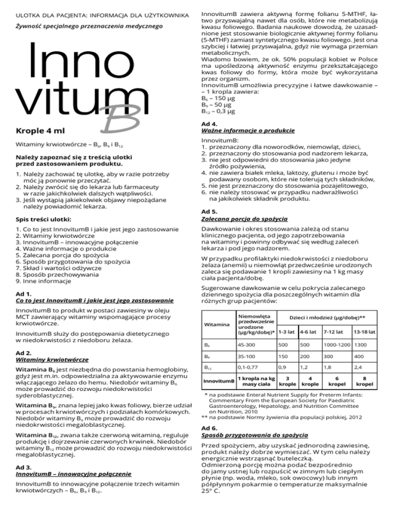 ULOTKA DLA PACJENTA: INFORMACJA DLA UŻYTKOWNIKA Żywność specjalnego przeznaczenia medycznego Krople 4 ml Witaminy krwiotwórcze – B6, B9 i B12 Należy zapoznać się z treścią ulotki przed zastosowaniem produktu. 1.Należyzachowaćtęulotkę,abywraziepotrzeby mócjąponownieprzeczytać. 2.Należyzwrócićsiędolekarzalubfarmaceuty wraziejakichkolwiekdalszychwątpliwości. 3.Jeśliwystąpiąjakiekolwiekobjawyniepożądane należypowiadomićlekarza. Spis treści ulotki: 1.CotojestInnovitumBijakiejestjegozastosowanie 2. Witaminy krwiotwórcze 3.InnovitumB–innowacyjnepołączenie 4.Ważneinformacjeoprodukcie 5.Zalecanaporcjadospożycia 6.Sposóbprzygotowaniadospożycia 7.Składiwartościodżywcze 8.Sposóbprzechowywania 9.Inneinformacje Ad 1. Co to jest InnovitumB i jakie jest jego zastosowanie InnovitumBtoproduktwpostacizawiesinywoleju MCTzawierającywitaminywspomagająceprocesy krwiotwórcze. InnovitumBsłużydopostępowaniadietetycznego wniedokrwistościzniedoborużelaza. Ad 2. Witaminy krwiotwórcze Witamina B6jestniezbędnadopowstaniahemoglobiny, gdyżjestm.in.odpowiedzialnazaaktywowanieenzymu włączającegożelazodohemu.NiedobórwitaminyB6 możeprowadzićdorozwojuniedokrwistości syderoblastycznej. Witamina B9 ,znanalepiejjakokwasfoliowy,bierzeudział wprocesachkrwiotwórczychipodziałachkomórkowych. NiedobórwitaminyB9możeprowadzićdorozwoju niedokrwistościmegaloblastycznej. Witamina B12 ,zwanatakżeczerwonąwitaminą,reguluje produkcjęidojrzewanieczerwonychkrwinek.Niedobór witaminy B12możeprowadzićdorozwojuniedokrwistości megaloblastycznej. Ad 3. InnovitumB – innowacyjne połączenie InnovitumBtoinnowacyjnepołączenietrzechwitamin krwiotwórczych–B6 , B9 i B12 . InnovitumB zawiera aktywną formę folianu 5-MTHF, łatwoprzyswajalnąnawetdlaosób,któreniemetabolizują kwasufoliowego.Badanianaukowedowodzą,żeuzasadnionejeststosowaniebiologicznieaktywnejformyfolianu (5-MTHF)zamiastsyntetycznegokwasufoliowego.Jestona szybciejiłatwiejprzyswajalna,gdyżniewymagaprzemian metabolicznych. Wiadomo bowiem, że ok. 50% populacji kobiet w Polsce ma upośledzoną aktywność enzymu przekształcającego kwas foliowy do formy, która może być wykorzystana przezorganizm. InnovitumBumożliwiaprecyzyjneiłatwedawkowanie– –1kroplazawiera: B6–150µg B9–50µg B12–0,3µg Ad 4. Ważne informacje o produkcie InnovitumB: 1.przeznaczonydlanoworodków,niemowląt,dzieci, 2.przeznaczonydostosowaniapodnadzoremlekarza, 3.niejestodpowiednidostosowaniajakojedyne źródłopożywienia, 4.niezawierabiałekmleka,laktozy,glutenuimożebyć podawanyosobom,którenietolerujątychskładników, 5.niejestprzeznaczonydostosowaniapozajelitowego, 6.nienależystosowaćwprzypadkunadwrażliwości najakikolwiekskładnikproduktu. Ad 5. Zalecana porcja do spożycia Dawkowanieiokresstosowaniazależąodstanu klinicznegopacjenta,odjegozapotrzebowania nawitaminyipowinnyodbywaćsięwedługzaleceń lekarzaipodjegonadzorem. Wprzypadkuproilaktykiniedokrwistościzniedoboru żelaza(anemii)uniemowlątprzedwcześnieurodzonych zalecasiępodawanie1kroplizawiesinyna1kgmasy ciałapacjenta/dobę. Sugerowanedawkowaniewcelupokryciazalecanego dziennegospożyciadlaposzczególnychwitamindla różnychgruppacjentów: Witamina Niemowlęta Dzieci i młodzież (µg/dobę)** przedwcześnie urodzone 13-18 lat (µg/kg/dobę)* 1-3 lat 4-6 lat 7-12 lat B6 45-300 500 500 B9 35-100 150 200 1000-1200 1300 300 400 B12 0,1-0,77 0,9 1,2 1,8 2,4 InnovitumB 1 kropla na kg 3 4 masy ciała krople krople 6 kropel 8 kropel *napodstawieEnteralNutrientSupplyforPretermInfants: CommentaryFromtheEuropeanSocietyforPaediatric Gastroenterology,Hepatology,andNutritionCommittee onNutrition,2010 **napodstawieNormyżywieniadlapopulacjipolskiej,2012 Ad 6. Sposób przygotowania do spożycia Przedspożyciem,abyuzyskaćjednorodnązawiesinę, produktnależydobrzewymieszać.Wtymcelunależy energiczniewstrząsnąćbuteleczką. Odmierzonąporcjęmożnapodaćbezpośrednio dojamyustnejlubrozpuścićwzimnymlubciepłym płynie(np.woda,mleko,sokowocowy)lubinnym półpłynnympokarmieotemperaturzemaksymalnie 25° C. Ad 7. Skład i wartości odżywcze Piśmiennictwo: Składniki:OlejMCT(średniołańcuchowekwasytłuszczowe), substancjawypełniająca–monoidiglicerydykwasów tłuszczowych,witaminaB6(chlorowodorekpirydoksyny), kwasfoliowyB9(L-metylofolianwapnia),witaminaB12 (cyjanokobalamina). Wartość odżywcza: 100 ml 1 kropla 3750kJ/ 917 kcal 1kJ/ 0kcal Tłuszcz,wtym 100g 0g - kwasytłuszczowe nasycone 100g 0g - kwasytłuszczowe jednonienasycone 0g 0g - kwasytłuszczowe wielonienasycone 0g 0g Wartośćenergetyczna Węglowodany,wtym - cukry Błonnik <0,5g 0g 0g 0g 0g 0g Białko <0,5g 0g Sól 0,11g <0,01g 612mg 0,15mg Witamina B6 Kwasfoliowy(B9) Witamina B12 204000µg 50µg 1200µg 0,3µg Ad 8. Sposób przechowywania Przechowywaćnależywsuchymmiejscu,wtemperaturze nieprzekraczającej25°C.Nienależynarażaćproduktuna działanie źródeł ciepła, promieni słonecznych. Spożyć w ciągu30dniodotwarcia. Ad 9. Inne informacje Podmiot odpowiedzialny: SmartPharmasp.zo.o. Złotniki,Ul.Kobaltowa6 62-002SuchyLas Tel.+4861 6593865 www.smartpharma.com.pl W celu uzyskania bardziej szczegółowych informacji należy zwrócić się do przedstawiciela podmiotu odpowiedzialnego: SmartPharmasp.zo.o. Złotniki,Ul.Kobaltowa6 62-002SuchyLas Tel.+4861 6593865 www.smartpharma.com.pl Data minimalnej trwałości i numer partiiznajdująsię naopakowaniuproduktu. Data zatwierdzenia ulotki: 25.07.2016 1. 2. 3. 4. AgostoniC,BuonocoreG,CarnielliVP,deCurtisM.DarmaunD etal.EnteralNutrientSupplyforPretermInfants:Commentary FromtheEuropeanSocietyforPaediatricGastroenterology, Hepatology,andNutritionCommitteeonNutrition.JPediatr GastroenterolNutr2010,50:1-9. Gołębiowska-StaroszczykS,MatysiakM.Rolawitaminwprocesie erytropoezy.StandMed./Pediatria2011,8:938-946. JaroszM(red.).Normyżywieniadlapopulacjipolskiej–nowelizacja.IŻŻ, Warszawa2012 Seremak-MrozikiewiczA.,BarlikM.,BorowczakP.,KurzawińskaG.