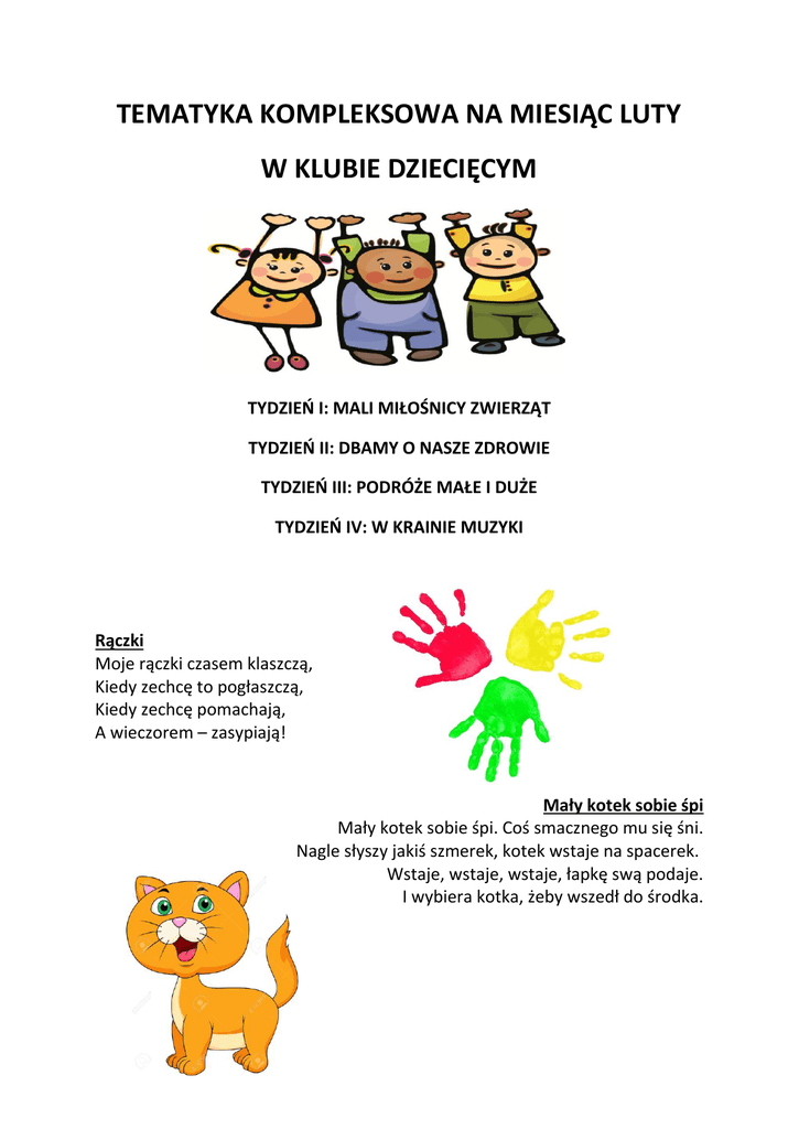 TEMATYKA KOMPLEKSOWA NA MIESIĄC LUTY W KLUBIE DZIECIĘCYM TYDZIEO I: MALI MIŁOŚNICY ZWIERZĄT TYDZIEO II: DBAMY O NASZE ZDROWIE TYDZIEO III: PODRÓŻE MAŁE I DUŻE TYDZIEO IV: W KRAINIE MUZYKI Rączki Moje rączki czasem klaszczą, Kiedy zechcę to pogłaszczą, Kiedy zechcę pomachają, A wieczorem – zasypiają! Mały kotek sobie śpi Mały kotek sobie śpi. Coś smacznego mu się śni. Nagle słyszy jakiś szmerek, kotek wstaje na spacerek. Wstaje, wstaje, wstaje, łapkę swą podaje. I wybiera kotka, żeby wszedł do środka. Idzie wąż Idzie wąż, idzie wąż Rośnie wciąż, rośnie wciąż Kasia węża się nie boi I dlatego za nim stoi. Długi jest ten wąż. Długi jest ten wąż. Samochody Jadą samochody, ulica za ulicą, a każdy kierowca tak kręci kierownicą. Brum, brum, brum, brum, brum, brum, tak kręci kierownicą! Teraz hamujemy i chwilkę zaczekamy, bo czerwone światło na skrzyżowaniu mamy. Stop, stop, stop! Stop, stop, stop! Na skrzyżowaniu mamy. Myję zęby Szczotka, pasta, kubek, ciepła woda, tak się zaczyna wielka przygoda Myję zęby, bo wiem dobrze o tym, kto ich nie myje, ten ma kłopoty Szczotko, szczotko, hej szczoteczko, o, o, o, zataocz z nami, taocz w kółeczko, o, o, o W prawo, w lewo, w lewo, w prawo, o, o, o, po jedzeniu kręd się żwawo, o, o, o Bo to bardzo ważna rzecz, żeby zdrowe zęby mied! Dziwne plamy Ręce, ręce brudne mamy, Same, same, dziwne plamy. Woda, woda, woda spływa, Zmywa, zmywa, zmywa. Buzie, buzie brudne mamy, Same, same, dziwne plamy. Woda, woda, woda spływa, Zmywa, zmywa, zmywa. Nogi, nogi brudne mamy Same, same, dziwne plamy. Woda, woda, woda spływa, Zmywa, zmywa, zmywa. Brzuchy, brzuchy brudne mamy Same, same, dziwne plamy. Woda, woda, woda spływa, Zmywa, zmywa, zmywa. Czoła, czoła brudne mamy Same, same, dziwne plamy. Woda, woda, woda spływa, Zmywa, zmywa, zmywa