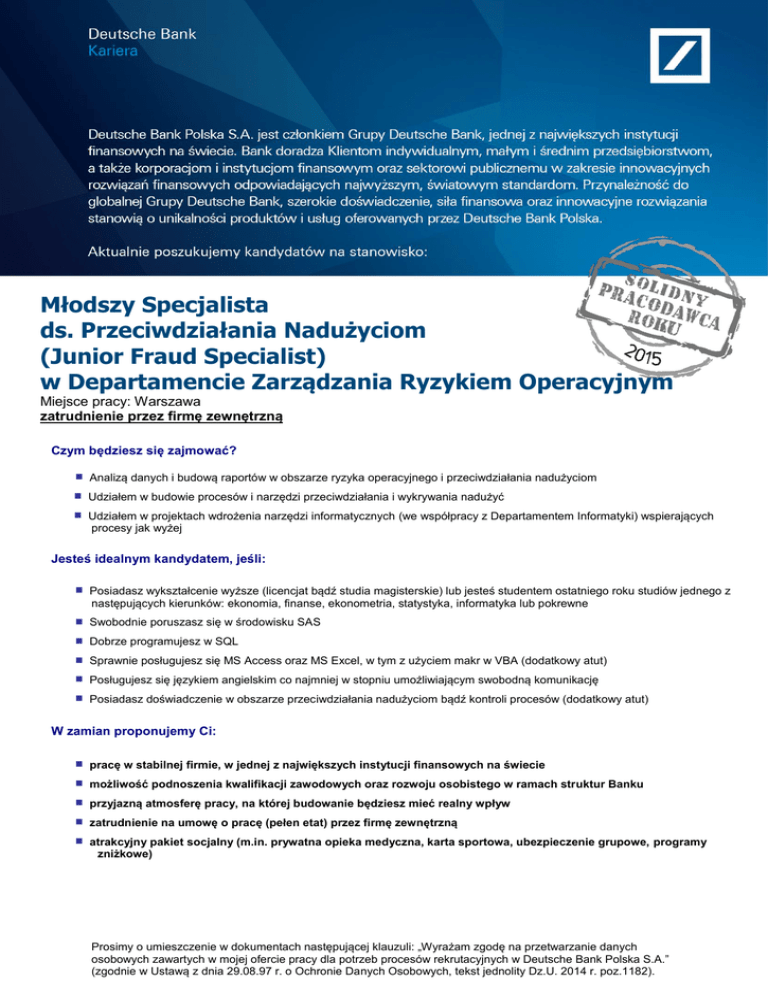 Młodszy Specjalista ds. Przeciwdziałania Nadużyciom (Junior Fraud Specialist) w Departamencie Zarządzania Ryzykiem Operacyjnym Miejsce pracy: Warszawa zatrudnienie przez firmę zewnętrzną Czym będziesz się zajmować? Analizą danych i budową raportów w obszarze ryzyka operacyjnego i przeciwdziałania nadużyciom Udziałem w budowie procesów i narzędzi przeciwdziałania i wykrywania nadużyć Udziałem w projektach wdrożenia narzędzi informatycznych (we współpracy z Departamentem Informatyki) wspierających procesy jak wyżej Jesteś idealnym kandydatem, jeśli: Posiadasz wykształcenie wyższe (licencjat bądź studia magisterskie) lub jesteś studentem ostatniego roku studiów jednego z następujących kierunków: ekonomia, finanse, ekonometria, statystyka, informatyka lub pokrewne Swobodnie poruszasz się w środowisku SAS Dobrze programujesz w SQL Sprawnie posługujesz się MS Access oraz MS Excel, w tym z użyciem makr w VBA (dodatkowy atut) Posługujesz się językiem angielskim co najmniej w stopniu umożliwiającym swobodną komunikację Posiadasz doświadczenie w obszarze przeciwdziałania nadużyciom bądź kontroli procesów (dodatkowy atut) W zamian proponujemy Ci: pracę w stabilnej firmie, w jednej z największych instytucji finansowych na świecie możliwość podnoszenia kwalifikacji zawodowych oraz rozwoju osobistego w ramach struktur Banku przyjazną atmosferę pracy, na której budowanie będziesz mieć realny wpływ zatrudnienie na umowę o pracę (pełen etat) przez firmę zewnętrzną atrakcyjny pakiet socjalny (m.in. prywatna opieka medyczna, karta sportowa, ubezpieczenie grupowe, programy zniżkowe) Prosimy o umieszczenie w dokumentach następującej klauzuli: „Wyrażam zgodę na przetwarzanie danych osobowych zawartych w mojej ofercie pracy dla potrzeb procesów rekrutacyjnych w Deutsche Bank Polska S.A.” (zgodnie w Ustawą z dnia 29.08.97 r. o Ochronie Danych Osobowych, tekst jednolity Dz.U. 2014 r. poz.1182). Wyślij do nas swoje CV za pomocą przycisku: Uprzejmie informujemy, że skontaktujemy się tylko z wybranymi Kandydatami, a nadesłanych dokumentów nie zwracamy. Prosimy o umieszczenie w dokumentach następującej klauzuli: „Wyrażam zgodę na przetwarzanie danych osobowych zawartych w mojej ofercie pracy dla potrzeb procesów rekrutacyjnych w Deutsche Bank Polska S.A.” (zgodnie w Ustawą z dnia 29.08.97 r. o Ochronie Danych Osobowych, tekst jednolity Dz.U. 2014 r. poz.1182).