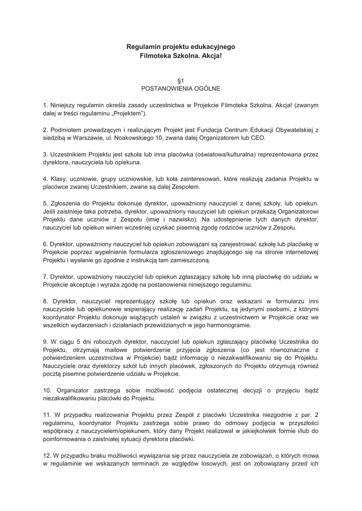 Regulamin projektu edukacyjnego Filmoteka Szkolna. Akcja! §1 POSTANOWIENIA OGÓLNE 1. Niniejszy regulamin określa zasady uczestnictwa w Projekcie Filmoteka Szkolna. Akcja! (zwanym dalej w treści regulaminu „Projektem”). 2. Podmiotem prowadzącym i realizującym Projekt jest Fundacja Centrum Edukacji Obywatelskiej z siedzibą w Warszawie, ul. Noakowskiego 10, zwana dalej Organizatorem lub CEO. 3. Uczestnikiem Projektu jest szkoła lub inna placówka (oświatowa/kulturalna) reprezentowana przez dyrektora, nauczyciela lub opiekuna. 4. Klasy, uczniowie, grupy uczniowskie, lub koła zainteresowań, które realizują zadania Projektu w placówce zwanej Uczestnikiem, zwane są dalej Zespołem. 5. Zgłoszenia do Projektu dokonuje dyrektor, upoważniony nauczyciel z danej szkoły, lub opiekun. Jeśli zaistnieje taka potrzeba, dyrektor, upoważniony nauczyciel lub opiekun przekażą Organizatorowi Projektu dane uczniów z Zespołu (imię i nazwisko). Na udostępnienie tych danych dyrektor, nauczyciel lub opiekun winien wcześniej uzyskać pisemną zgodę rodziców uczniów z Zespołu. 6. Dyrektor, upoważniony nauczyciel lub opiekun zobowiązani są zarejestrować szkołę lub placówkę w Projekcie poprzez wypełnienie formularza zgłoszeniowego znajdującego się na stronie internetowej Projektu i wysłanie go zgodnie z instrukcją tam zamieszczoną. 7. Dyrektor, upoważniony nauczyciel lub opiekun zgłaszający szkołę lub inną placówkę do udziału w Projekcie akceptuje i wyraża zgodę na postanowienia niniejszego regulaminu. 8. Dyrektor, nauczyciel reprezentujący szkołę lub opiekun oraz wskazani w formularzu inni nauczyciele lub opiekunowie wspierający realizację zadań Projektu, są jedynymi osobami, z którymi koordynator Projektu dokonuje wiążących ustaleń w związku z uczestnictwem w Projekcie oraz we wszelkich wydarzeniach i działaniach przewidzianych w jego harmonogramie. 9. W ciągu 5 dni roboczych dyrektor, nauczyciel lub opiekun zgłaszający placówkę Uczestnika do Projektu, otrzymają mailowe potwierdzenie przyjęcia zgłoszenia (co jest równoznaczne z potwierdzeniem uczestnictwa w Projekcie) bądź informację o niezakwalifikowaniu się do Projektu. Nauczyciele oraz dyrektorzy szkół lub innych placówek, zgłoszonych do Projektu otrzymują również pocztą pisemne potwierdzenie udziału w Projekcie. 10. Organizator zastrzega sobie możliwość podjęcia ostatecznej decyzji o przyjęciu bądź niezakwalifikowaniu placówki do Projektu. 11. W przypadku realizowania Projektu przez Zespół z placówki Uczestnika niezgodnie z par. 2 regulaminu, koordynator Projektu zastrzega sobie prawo do odmowy podjęcia w przyszłości współpracy z nauczycielem/opiekunem, który dany Projekt realizował w jakiejkolwiek formie i/lub do poinformowania o zaistniałej sytuacji dyrektora placówki. 12. W przypadku braku możliwości wywiązania się przez nauczyciela ze zobowiązań, o których mowa w regulaminie we wskazanych terminach ze względów losowych, jest on zobowiązany przed ich upływem poinformować o tym koordynatora Projektu i wnosić o przedłużenie terminu. W przeciwnym razie brak działania ze strony nauczyciela traktowany będzie jako rezygnacja z udziału w Projekcie. 13. Nauczyciele lub opiekunowie w ramach uczestnictwa w Projekcie zobowiązują się do przeprowadzenia zajęć z uczniami (nauczyciel lub opiekun mają prawo wyboru formy, metod i narzędzi wykorzystywanych przy realizacji Projektu) z wykorzystaniem materiałów edukacyjnych i pomocy dydaktycznych opracowanych lub proponowanych przez Organizatora Projektu. 14. Po zakończeniu Projektu nauczyciele lub opiekunowie otrzymują zaświadczenia imienne, Zespoły - dyplomy grupowe. Na prośbę nauczyciela lub opiekuna koordynator może wysłać indywidualne zaświadczenia dla uczniów in blanco. Dyrektor placówki otrzymuje pisemne potwierdzenie o zakończeniu realizacji Projektu przez Zespół w placówce. 15. Udział w Projekcie jest bezpłatny. 16. W sprawach nie uregulowanych niniejszym regulaminem mają zastosowanie odpowiednie przepisy kodeksu cywilnego oraz inne stosowne przepisy prawa polskiego. §2 ZASADY UCZESTNICTWA 1. Realizacja Projektu odbywa się w Projekcie w Zespołach uczniowskich/młodzieżowych pracujących pod opieką nauczyciela lub opiekuna upoważnionego przez placówkę. 2. Uczestnicy reprezentowani przez dyrektora, upoważnionego nauczyciela lub opiekuna zobowiązani są do: a. wyboru działania (projekt edukacyjny, szkolny DKF, lekcje z filmem) b. opracowania harmonogramu i scenariusza działań Zespołu c. utrzymywania kontaktu z organizatorami za pośrednictwem poczty elektronicznej d. dokumentowania przebiegu swoich działań (relacje, opisy, zdjęcia, filmy). e. przesyłania esejów, recenzji, relacji z debat i imprez filmowych do Organizatora, lub publikacji ww. na blogu, profilu facebook, kanale youtube dedykowanym Projektowi. Nadesłane artykuły będą opublikowane na stronach internetowych www.filmoteka.ceo.org.pl (najlepsze prace będą umieszczane na stronie www.filmotekaszkolna.pl). 3. Nauczyciel lub opiekun zobowiązany jest do przesłania na adres Organizatora sprawozdania z realizacji działań. a. Nauczyciel/opiekun wyraża zgodę by sprawozdanie to było wykorzystywane w celach dydaktycznych i statystycznych przez CEO. b. Ostateczny termin nadesłania sprawozdania upływa 26 czerwca 2017 r. (jeżeli uczestnicy chcą otrzymać zaświadczenia o udziale w Projekcie przed końcem roku szkolnego, termin nadesłania sprawozdania upływna 31 maja 2017 r.) c. Sprawozdanie opracowane w formie elektronicznej (CD) lub w formie mailowej należy wysyłać na adres: Fundacja Centrum Edukacji Obywatelskiej, Noakowskiego 10, 00-666 Warszawa z dopiskiem: „Filmoteka Szkolna. Akcja!" lub w formie mailowej na adres koordynatorek Projektu. d. Przesłane do Organizatora sprawozdanie powinno zawierać następujące elementy: - formularz sprawozdania, - dodatkowe elementy (te