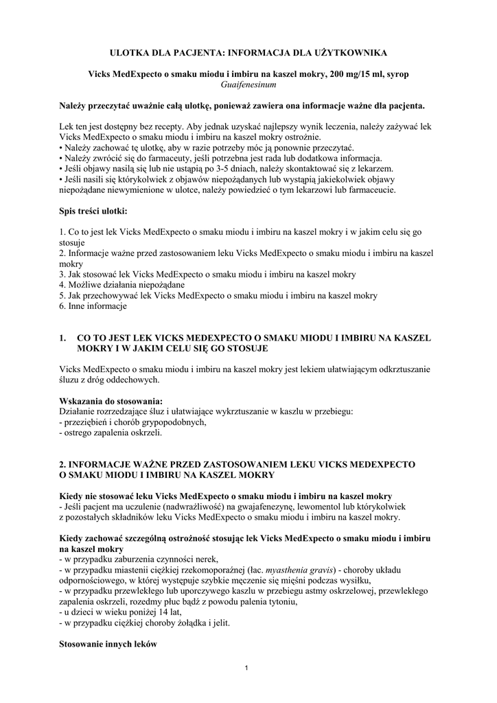 ULOTKA DLA PACJENTA: INFORMACJA DLA UśYTKOWNIKA Vicks MedExpecto o smaku miodu i imbiru na kaszel mokry, 200 mg/15 ml, syrop Guaifenesinum NaleŜy przeczytać uwaŜnie całą ulotkę, poniewaŜ zawiera ona informacje waŜne dla pacjenta. Lek ten jest dostępny bez recepty. Aby jednak uzyskać najlepszy wynik leczenia, naleŜy zaŜywać lek Vicks MedExpecto o smaku miodu i imbiru na kaszel mokry ostroŜnie. • NaleŜy zachować tę ulotkę, aby w razie potrzeby móc ją ponownie przeczytać. • NaleŜy zwrócić się do farmaceuty, jeśli potrzebna jest rada lub dodatkowa informacja. • Jeśli objawy nasilą się lub nie ustąpią po 3-5 dniach, naleŜy skontaktować się z lekarzem. • Jeśli nasili się którykolwiek z objawów niepoŜądanych lub wystąpią jakiekolwiek objawy niepoŜądane niewymienione w ulotce, naleŜy powiedzieć o tym lekarzowi lub farmaceucie. Spis treści ulotki: 1. Co to jest lek Vicks MedExpecto o smaku miodu i imbiru na kaszel mokry i w jakim celu się go stosuje 2. Informacje waŜne przed zastosowaniem leku Vicks MedExpecto o smaku miodu i imbiru na kaszel mokry 3. Jak stosować lek Vicks MedExpecto o smaku miodu i imbiru na kaszel mokry 4. MoŜliwe działania niepoŜądane 5. Jak przechowywać lek Vicks MedExpecto o smaku miodu i imbiru na kaszel mokry 6. Inne informacje 1. CO TO JEST LEK VICKS MEDEXPECTO O SMAKU MIODU I IMBIRU NA KASZEL MOKRY I W JAKIM CELU SIĘ GO STOSUJE Vicks MedExpecto o smaku miodu i imbiru na kaszel mokry jest lekiem ułatwiającym odkrztuszanie śluzu z dróg oddechowych. Wskazania do stosowania: Działanie rozrzedzające śluz i ułatwiające wykrztuszanie w kaszlu w przebiegu: - przeziębień i chorób grypopodobnych, - ostrego zapalenia oskrzeli. 2. INFORMACJE WAśNE PRZED ZASTOSOWANIEM LEKU VICKS MEDEXPECTO O SMAKU MIODU I IMBIRU NA KASZEL MOKRY Kiedy nie stosować leku Vicks MedExpecto o smaku miodu i imbiru na kaszel mokry - Jeśli pacjent ma uczulenie (nadwraŜliwość) na gwajafenezynę, lewomentol lub którykolwiek z pozostałych składników leku Vicks MedExpecto o smaku miodu i imbiru na kaszel mokry. Kiedy zachować szczególną ostroŜność stosując lek Vicks MedExpecto o smaku miodu i imbiru na kaszel mokry - w przypadku zaburzenia czynności nerek, - w przypadku miastenii cięŜkiej rzekomoporaźnej (łac. myasthenia gravis) - choroby układu odpornościowego, w której występuje szybkie męczenie się mięśni podczas wysiłku, - w przypadku przewlekłego lub uporczywego kaszlu w przebiegu astmy oskrzelowej, przewlekłego zapalenia oskrzeli, rozedmy płuc bądź z powodu palenia tytoniu, - u dzieci w wieku poniŜej 14 lat, - w przypadku cięŜkiej choroby Ŝołądka i jelit. Stosowanie innych leków 1 NaleŜy powiedzieć lekarzowi lub farmaceucie o wszystkich przyjmowanych aktualnie lub ostatnio lekach, równieŜ tych, które wydawane są bez recepty. Vicks MedExpecto o smaku miodu i imbiru na kaszel mokry moŜe nasilać działanie: - leków uspokajających, - leków zwiotczających mięśnie stosowanych np. podczas znieczulenia ogólnego podczas zabiegów chirurgicznych. Stosowanie leku Vicks MedExpecto o smaku miodu i imbiru na kaszel mokry z jedzeniem i piciem Brak ograniczeń. CiąŜa i karmienie piersią Przed zastosowaniem jakiegokolwiek leku naleŜy poradzić się lekarza lub farmaceuty. Bezpieczeństwo stosowania gwajafenezyny w ciąŜy i podczas karmienia piersią nie zostało całkowicie ustalone. Zastosowanie tego leku w ciąŜy lub podczas karmienia piersią moŜliwe jest jedynie na wyraźne zalecenie lekarskie. Prowadzenie pojazdów i obsługiwanie maszyn Ze względu na zawartość alkoholu lek Vicks MedExpecto o smaku miodu i imbiru na kaszel mokry moŜe wpływać na zdolność prowadzenia pojazdów i obsługiwania maszyn. WaŜne informacje o niektórych składnikach leku Vicks MedExpecto o smaku miodu i imbiru na kaszel mokry Lek zawiera następujące składniki: • Sacharoza. JeŜeli stwierdzono wcześniej u pacjenta nietolerancję niektórych cukrów, pacjent powinien skontaktować się z lekarzem przed przyjęciem leku Vicks MedExpecto o smaku miodu i imbiru na kaszel mokry. 15 ml leku zawiera 5,5 g sacharozy (cukru), co odpowiada około 0,46 jednostkom chlebowym. NaleŜy to uwzględnić, jeśli pacjent stosuje dietę cukrzycową. • Zawiera 5% (obj.) alkoholu. W przypadku dawkowania zgodnego z zaleceniami jedna dawka (15 ml) zawiera 0,63 g alkoholu. Ryzyko szkodliwego działania moŜe występować u pacjentów z chorobą wątroby, chorobą alkoholową, padaczką, organiczną chorobą mózgu, u kobiet w ciąŜy i karmiących piersią oraz u dzieci. MoŜe wystąpić osłabienie lub nasilenie działania innych leków. • Sód. 15 ml produktu zawiera 1,3 mmol (30 mg) sodu. NaleŜy to uwzględnić, jeśli pacjent stosuje dietę niskosodową. 3. JAK STOSOWAĆ LEK VICKS MEDEXPECTO O SMAKU MIODU I IMBIRU NA KASZEL MOKRY Lek Vicks MedExpecto o smaku miodu i imbiru na kaszel mokry naleŜy przyjmować zgodnie z informacjami przedstawionymi w niniejszej ulotce. W razie wątpliwości naleŜy zwrócić się do lekarza lub farmaceuty. Jeśli lekarz nie zaleci inaczej, stosuje się następujące dawkowanie: Dorośli i młodzieŜ w wieku powyŜej 14 lat: zaŜywać 200 mg gwajafenezyny, tj. 15 ml (jedna miarka - do poziomu kreski) co 4 godziny. Stosować maksymalnie sześć razy na dobę. Nie stosować dawek większych od zalecanych. Nie naleŜy stosować syropu przed snem. Sposób uŜycia Wstrząsnąć butelkę przed uŜyciem. Nacisnąć zakrętkę zabezpieczającą przed otwarciem przez dzieci i obracać w kierunku wskazanym przez strzałkę. Długość leczenia 2 Lek Vicks MedExpecto o smaku miodu i imbiru na kaszel mokry moŜna samodzielnie stosować nie dłuŜej niŜ przez 3-5 dni. Jeśli po tym okresie nie nastąpi istotna poprawa i utrzymuje się odkrztuszanie śluzu lub uporczywy kaszel, naleŜy zasięgnąć porady lekarskiej, gdyŜ moŜe to wskazywać na powaŜniejszą chorobę. Nie naleŜy stoso