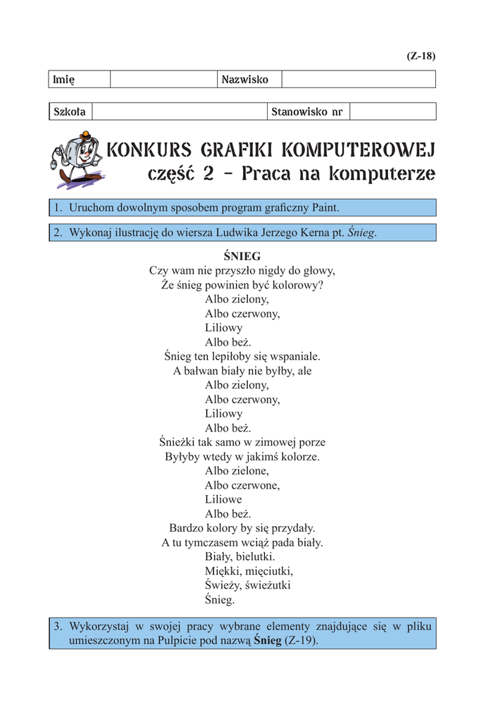 (Z-18) Imię Szkoła Nazwisko Stanowisko nr KONKURS GRAFIKI KOMPUTEROWEJ część 2 – Praca na komputerze 1. Uruchom dowolnym sposobem program graficzny Paint. 2. Wykonaj ilustrację do wiersza Ludwika Jerzego Kerna pt. Śnieg. śNIEG Czy wam nie przyszło nigdy do głowy, że śnieg powinien być kolorowy? Albo zielony, Albo czerwony, Liliowy Albo beż. Śnieg ten lepiłoby się wspaniale. A bałwan biały nie byłby, ale Albo zielony, Albo czerwony, Liliowy Albo beż. Śnieżki tak samo w zimowej porze Byłyby wtedy w jakimś kolorze. Albo zielone, Albo czerwone, Liliowe Albo beż. Bardzo kolory by się przydały. A tu tymczasem wciąż pada biały. Biały, bielutki. Miękki, mięciutki, Świeży, świeżutki Śnieg. 3. Wykorzystaj w swojej pracy wybrane elementy znajdujące się w pliku umieszczonym na Pulpicie pod nazwą Śnieg (Z-19). 4. Zapisz swoją pracę na Pulpicie pod nazwą Konkurs. Lp. 1. 2. 3. 4. 4.1 4.2 4.3 4.4 CO PODLEGA OCENIE? Uruchomienie programu graficznego Paint. Wykorzystanie gotowych elementów graficznych. Zapisanie pracy we wskazanym miejscu. Wykonanie ilustracji do wiersza. Dobór motywów i staranność ich wykonania. Dobór barw. Kompozycja przestrzenna (wielkość, proporcje, położenie poszczególnych elementów rysunku). Pomysłowość i oryginalność przedstawienia tematu. Suma uzyskanych punktów PRZEWIDYWANA LICZBA PUNKTÓW 1 3 1 4 4 5 5 23 UZYSKANA LICZBA PUNKTÓW