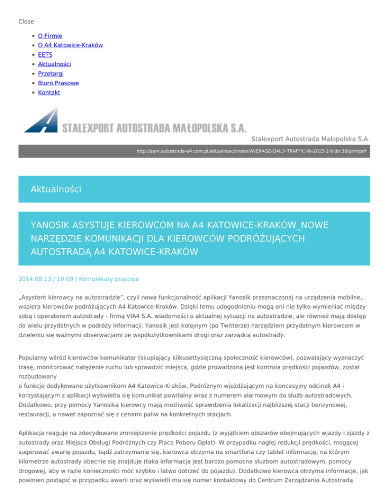 Close O Firmie O A4 Katowice-Kraków EETS Aktualności Przetargi Biuro Prasowe Kontakt Stalexport Autostrada Małopolska S.A. http://sam.autostrada-a4.com.pl/aktualnosci/index/AVERAGE-DAILY-TRAFFIC-IN-2015-1H/idn:39/printpdf Aktualności YANOSIK ASYSTUJE KIEROWCOM NA A4 KATOWICE-KRAKÓW_NOWE NARZĘDZIE KOMUNIKACJI DLA KIEROWCÓW PODRÓŻUJĄCYCH AUTOSTRADĄ A4 KATOWICE-KRAKÓW 2014.08.13 / 10:09 | Komunikaty prasowe „Asystent kierowcy na autostradzie”, czyli nowa funkcjonalność aplikacji Yanosik przeznaczonej na urządzenia mobilne, wspiera kierowców podróżujących A4 Katowice-Kraków. Dzięki temu udogodnieniu mogą oni nie tylko wymieniać między sobą i operatorem autostrady - firmą VIA4 S.A. wiadomości o aktualnej sytuacji na autostradzie, ale również mają dostęp do wielu przydatnych w podróży informacji. Yanosik jest kolejnym (po Twitterze) narzędziem przydatnym kierowcom w dzieleniu się ważnymi obserwacjami ze współużytkownikami drogi oraz zarządcą autostrady. Popularny wśród kierowców komunikator (skupiający kilkusettysięczną społeczność kierowców), pozwalający wyznaczyć trasę, monitorować natężenie ruchu lub sprawdzić miejsca, gdzie prowadzona jest kontrola prędkości pojazdów, został rozbudowany o funkcje dedykowane użytkownikom A4 Katowice-Kraków. Podróżnym wjeżdżającym na koncesyjny odcinek A4 i korzystającym z aplikacji wyświetla się komunikat powitalny wraz z numerem alarmowym do służb autostradowych. Dodatkowo, przy pomocy Yanosika kierowcy mają możliwość sprawdzenia lokalizacji najbliższej stacji benzynowej, restauracji, a nawet zapoznać się z cenami paliw na konkretnych stacjach. Aplikacja reaguje na zdecydowane zmniejszenie prędkości pojazdu (z wyjątkiem obszarów obejmujących wjazdy i zjazdy z autostrady oraz Miejsca Obsługi Podróżnych czy Place Poboru Opłat). W przypadku nagłej redukcji prędkości, mogącej sugerować awarię pojazdu, bądź zatrzymanie się, kierowca otrzyma na smartfona czy tablet informację, na którym kilometrze autostrady obecnie się znajduje (taka informacja jest bardzo pomocna służbom autostradowym, pomocy drogowej, aby w razie konieczności móc szybko i łatwo dotrzeć do pojazdu). Dodatkowo kierowca otrzyma informacje, jak powinien postąpić w przypadku awarii oraz wyświetli mu się numer kontaktowy do Centrum Zarządzania Autostradą. Dzięki temu będzie mógł wezwać pomoc bez konieczności wysiadania z samochodu. Ponadto, Centrum Zarządzania Autostradą, które przez 24 godziny na dobę czuwa nad bezpieczeństwem kierowców, jest powiadamiane o każdym zdarzeniu drogowym, zgłoszonym przez użytkowników aplikacji, co pozwala na jeszcze szybszą reakcję służb autostradowych. W przyszłości aplikacja zostanie uzupełniona o dodatkowe funkcje, które jeszcze bardziej ułatwią podróżnym dostęp do informacji o bieżącej sytuacji na autostradzie. - Przewidywalność warunków panujących na drodze jest ważnym elementem komfortu podróżowania, a ambicją koncesjonariusza jest uczynienie autostrady A4 Katowice-Kraków możliwie najbardziej przyjazną kierowcom. Dlatego przed rokiem uruchomiliśmy na Twitterze profil koncesyjnego odcinka autostrady, za pomocą którego na bieżąco komunikujemy się z kierowcami. Wprowadzone właśnie, dedykowane A4 Katowice-Kraków, rozwiązanie w ramach usługi Yanosik, jest kolejnym narzędziem, które dzięki prostocie obsługi pozwala kierowcom w optymalny sposób dzielić się ważnymi obserwacjami ze współużytkownikami drogi i centrum zarządzania autostradą – mówi Rafał Czechowski, rzecznik prasowy Stalexport Autostrada Małopolska S.A. – Mamy nadzieję, że dzięki temu podniesie się nie tylko komfort korzystania z A4 Katowice-Kraków, ale też poziom bezpieczeństwa na tym odcinku autostrady. Aplikację uwzględniającą funkcjonalności przydatne dla podróżnych koncesyjnym autostradą A4 można bezpłatnie pobrać z Google play, iTunes oraz Windows Phone. ### Informacje o SAM S.A. Stalexport Autostrada Małopolska S.A. zarządza 60-kilometrowym odcinkiem autostrady A4 pomiędzy Katowicami a Krakowem. Jest to pierwsza pełnowartościowa tego typu droga w Polsce, wybudowana w ramach partnerstwa publicznoprywatnego, jako inwestycja typu brownfield – na bazie drogi powstałej w latach 70. i 80. Stalexport Autostrada Małopolska S.A. uzyskał koncesję na jej przystosowanie do wymogów autostrady płatnej oraz eksploatację w 1997 roku. Wymagało to licznych inwestycji. Wszystkie projekty inwestycyjne, a także bieżące utrzymanie pasa drogowego finansowane są z przychodów z tytułu poboru opłat za przejazd odcinkiem koncesyjnym oraz kredytów pozyskanych z międzynarodowego konsorcjum bankowego. Projekt realizowany przez Stalexport Autostrada Małopolska S.A., w odróżnieniu od innych koncesji na zarządzanie autostradami płatnymi, nie obciąża Skarbu Państwa żadnymi zobowiązaniami.Spółkanie korzysta z żadnych dotacji, czy też gwarancji Skarbu Państwa. Informacje o VIA4 S.A. Spółka (dawniej Stalexport Transroute Autostrada S.A.) powstała w 1998 roku. Przedmiotem działalności VIA4 jest działalność związana z eksploatacją odcinka autostrady płatnej A4 na trasie Katowice-Kraków. Podmiot ten świadczy swoje usługi na rzecz SAM S.A., jako podmiotu zarządzającego tym odcinkiem autostrady na podstawie Umowy Koncesyjnej. Do najważniejszych zadań realizowanych przez VIA4 należą usługi bieżącej eksploatacji i utrzymania odcinka autostrady płatnej A4 (Katowice-Kraków), w tym m.in.: eksploatacja systemu poboru opłat, zarządzanie ruchem na autostradzie oraz utrzymanie zimowe autostrady. Równie istotne znaczenie mają zadania z zakresu bezpieczeństwa i ruchu drogowego, w ramach których VIA4 zapewnia: całodobowe patrole autostrady, które przy współpracy z Centrum Zarządzania Autostradą zapewniają możliwe szybkie wykrywanie zdarzeń, obsługiwanie systemu telefon