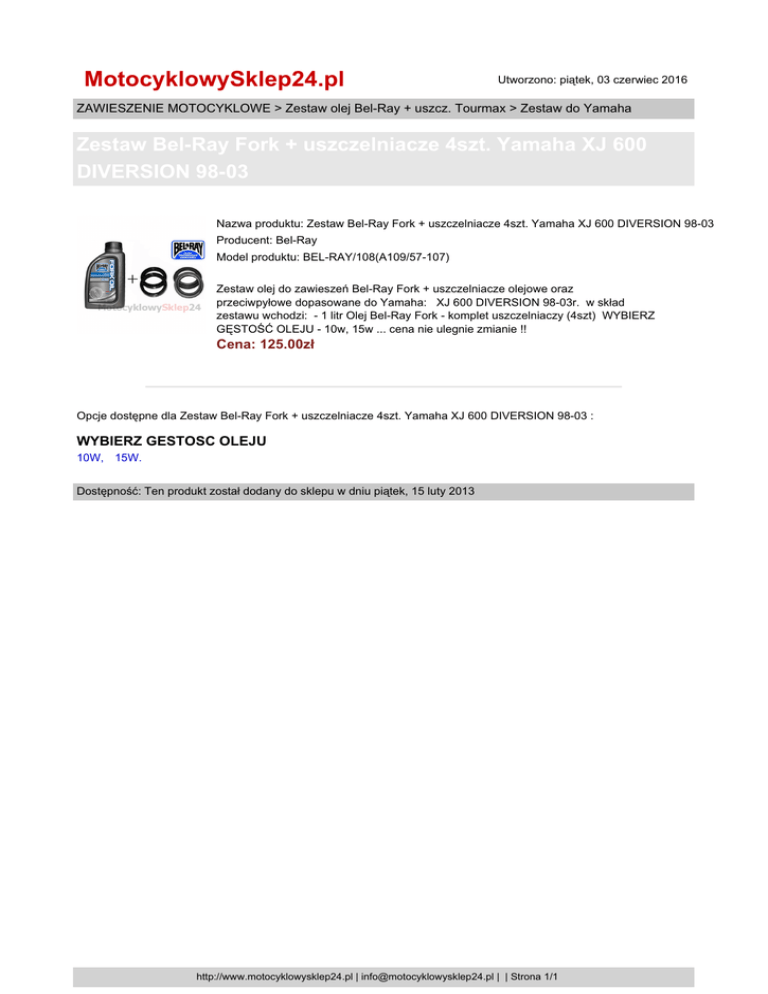 MotocyklowySklep24.pl Utworzono: piątek, 03 czerwiec 2016 ZAWIESZENIE MOTOCYKLOWE > Zestaw olej Bel-Ray + uszcz. Tourmax > Zestaw do Yamaha Zestaw Bel-Ray Fork + uszczelniacze 4szt. Yamaha XJ 600 DIVERSION 98-03 Nazwa produktu: Zestaw Bel-Ray Fork + uszczelniacze 4szt. Yamaha XJ 600 DIVERSION 98-03 Producent: Bel-Ray Model produktu: BEL-RAY/108(A109/57-107) Zestaw olej do zawieszeń Bel-Ray Fork + uszczelniacze olejowe oraz przeciwpyłowe dopasowane do Yamaha: XJ 600 DIVERSION 98-03r. w skład zestawu wchodzi: - 1 litr Olej Bel-Ray Fork - komplet uszczelniaczy (4szt) WYBIERZ GĘSTOŚĆ OLEJU - 10w, 15w ... cena nie ulegnie zmianie !! Cena: 125.00zł Opcje dostępne dla Zestaw Bel-Ray Fork + uszczelniacze 4szt. Yamaha XJ 600 DIVERSION 98-03 : WYBIERZ GESTOSC OLEJU 10W, 15W. Dostępność: Ten produkt został dodany do sklepu w dniu piątek, 15 luty 2013 http://www.motocyklowysklep24.pl | [email protected] | | Strona 1/1