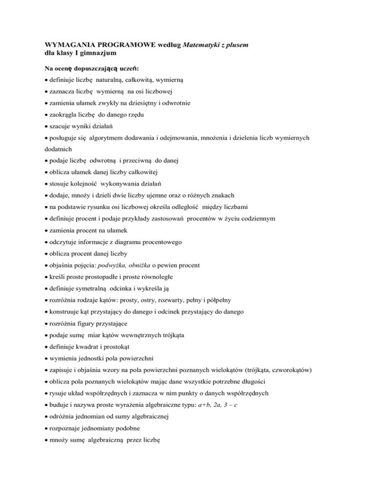 WYMAGANIA PROGRAMOWE według Matematyki z plusem dla klasy I gimnazjum Na ocenę dopuszczającą uczeń: definiuje liczbę naturalną, całkowitą, wymierną zaznacza liczbę wymierną na osi liczbowej zamienia ułamek zwykły na dziesiętny i odwrotnie zaokrągla liczbę do danego rzędu szacuje wyniki działań posługuje się algorytmem dodawania i odejmowania, mnożenia i dzielenia liczb wymiernych dodatnich podaje liczbę odwrotną i przeciwną do danej oblicza ułamek danej liczby całkowitej stosuje kolejność wykonywania działań dodaje, mnoży i dzieli dwie liczby ujemne oraz o różnych znakach na podstawie rysunku osi liczbowej określa odległość między liczbami definiuje procent i podaje przykłady zastosowań procentów w życiu codziennym zamienia procent na ułamek odczytuje informacje z diagramu procentowego oblicza procent danej liczby objaśnia pojęcia: podwyżka, obniżka o pewien procent kreśli proste prostopadłe i proste równoległe definiuje symetralną odcinka i wykreśla ją rozróżnia rodzaje kątów: prosty, ostry, rozwarty, pełny i półpełny konstruuje kąt przystający do danego i odcinek przystający do danego rozróżnia figury przystające podaje sumę miar kątów wewnętrznych trójkąta definiuje kwadrat i prostokąt wymienia jednostki pola powierzchni zapisuje i objaśnia wzory na pola powierzchni poznanych wielokątów (trójkąta, czworokątów) oblicza pola poznanych wielokątów mając dane wszystkie potrzebne długości rysuje układ współrzędnych i zaznacza w nim punkty o danych współrzędnych buduje i nazywa proste wyrażenia algebraiczne typu: a+b, 2a, 3 – c odróżnia jednomian od sumy algebraicznej rozpoznaje jednomiany podobne mnoży sumę algebraiczną przez liczbę sprawdza rachunkowo, czy dana liczba spełnia równanie stopnia I z jedną niewiadomą podaje przykłady proporcji rozpoznaje figury symetryczne względem prostej i względem punktu, w tym także w układzie współrzędnych wykreśla punkt symetryczny do danego względem prostej i względem punktu podaje przykłady figur mających oś symetrii. Na ocenę dostateczną uczeń: zapisuje liczby wymierne w postaci rozwinięć dziesiętnych skończonych i nieskończonych okresowych porównuje liczby wymierne wykonuje działania łączne na liczbach wymiernych dodatnich i stosuje prawa działań oblicza liczbę na podstawie danego jej ułamka zaznacza na osi liczbowej liczby spełniające określoną nierówność zamienia liczbę wymierną na procent określa procentowo zaznaczoną część figury oblicza jakim procentem jednej liczby jest druga liczba oblicza obniżkę (podwyżkę) o pewien procent nazywa kąty utworzone przez dwie przecinające się proste oraz utworzone między dwiema prostymi równoległymi przeciętymi trzecią prostą oblicza miary kątów wierzchołkowych, naprzemianległych i odpowiadających, gdy dana jest miara jednego z nich wykreśla poszczególne rodzaje trójkątów wymienia cechy przystawania trójkątów konstruuje trójkąt o danych trzech bokach definiuje trapez, romb, równoległobok i wymienia ich własności rysuje wysokości czworokątów zamienia jednostki pola powierzchni (bez arów i hektarów) redukuje wyrazy podobne w sumie algebraicznej mnoży sumę algebraiczną przez jednomian wyłącza wspólny czynnik przed nawias rozwiązuje równanie stopnia I z jedną niewiadomą z zastosowaniem prostych przekształceń rozwiązuje równanie zapisane w postaci proporcji zapisuje równaniem typową sytuację zadaniową, np.: zakupy rozpoznaje wielkości wprost i odwrotnie proporcjonalne w różnych sytuacjach określa własności punktów symetrycznych względem prostej i względem punktu rysuje figury symetryczne względem prostej i względem punktu, w tym w układzie współrzędnych rysuje oś symetrii figury wymienia własności symetralnej odcinka definiuje środek symetrii figury i podaje przykłady figur środkowosymetrycznych. Na ocenę dobrą uczeń: dokonuje porównań poprzez szacowanie w zadaniach tekstowych przedstawia rozwinięcie dziesiętne nieskończone w postaci ułamka zwykłego oblicza wartości wyrażeń arytmetycznych zawierających większą liczbę działań, wykorzystuje kalkulator oblicza wartość wyrażenia arytmetycznego z wartością bezwzględną rozwiązuje zadania z zastosowaniem ułamków wykorzystuje wartość bezwzględną do obliczania odległości liczb na osi liczbowej definiuje promil; zamienia ułamek i procent na promil i odwrotnie ilustruje diagramem procentowym wybrane informacje oblicza o ile procent jest większa (mniejsza) liczba od danej rozwiązuje zadania tekstowe dotyczące obliczenia liczby na podstawie jej procentu wykreśla geometryczną sumę i różnicę kątów podaje warunek budowy trójkąta z trzech odcinków klasyfikuje trójkąty ze względu na boki i kąty konstruuje trójkąt o dwóch danych bokach i kącie między nimi zawartym konstruuje trójkąt, gdy dany jest bok i dwa kąty przyległe do niego klasyfikuje czworokąty zamienia jednostki pola powierzchni, w tym ary i hektary oblicza pola powierzchni wielokątów w układzie współrzędnych wyznacza brakujące wierzchołki prostokąta buduje i nazywa wyrażenie algebraiczne o konstrukcji wielodziałaniowej dodaje i odejmuje sumy algebraiczne oblicza wartości wyrażeń algebraicznych dla zadanych zmiennych rozwiązuje równania stopnia I z jedną niewiadomą z zastosowaniem przekształceń stosuje równania, wielkości wprost i odwrotnie proporcjonalne do rozwiązywania zadań tekstowych w zadaniach wykorzystuje własności symetrii osiowej i środkowej rysuje figury posiadające więcej niż jedną oś symetrii dzieli odcinek na 2n części dzieli kąt na 2n części. Na ocenę bardzo dobrą uczeń: w wyrażeniu arytmetycznym wstawia nawiasy tak, aby otrzymać Żądany wynik zaznacza na osi liczbowej zbiór liczb spełniających jednocześnie dwie nierówności stosuje zależności między bokami i kątami w tró