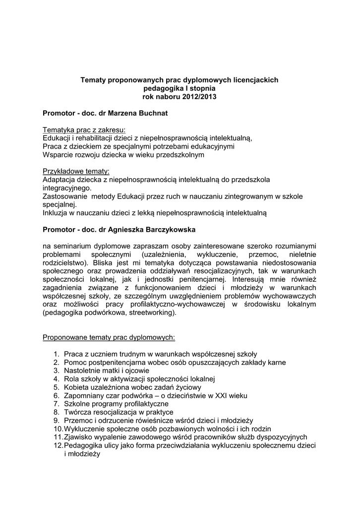 Tematy proponowanych prac dyplomowych licencjackich pedagogika I stopnia rok naboru 2012/2013 Promotor - doc. dr Marzena Buchnat Tematyka prac z zakresu: Edukacji i rehabilitacji dzieci z niepełnosprawnością intelektualną, Praca z dzieckiem ze specjalnymi potrzebami edukacyjnymi Wsparcie rozwoju dziecka w wieku przedszkolnym Przykładowe tematy: Adaptacja dziecka z niepełnosprawnością intelektualną do przedszkola integracyjnego. Zastosowanie metody Edukacji przez ruch w nauczaniu zintegrowanym w szkole specjalnej. Inkluzja w nauczaniu dzieci z lekką niepełnosprawnością intelektualną Promotor - doc. dr Agnieszka Barczykowska na seminarium dyplomowe zapraszam osoby zainteresowane szeroko rozumianymi problemami społecznymi (uzależnienia, wykluczenie, przemoc, nieletnie rodzicielstwo). Bliska jest mi tematyka dotycząca powstawania niedostosowania społecznego oraz prowadzenia oddziaływań resocjalizacyjnych, tak w warunkach społeczności lokalnej, jak i jednostki penitencjarnej. Interesują mnie również zagadnienia związane z funkcjonowaniem dzieci i młodzieży w warunkach współczesnej szkoły, ze szczególnym uwzględnieniem problemów wychowawczych oraz możliwości pracy profilaktyczno-wychowawczej w środowisku lokalnym (pedagogika podwórkowa, streetworking). Proponowane tematy prac dyplomowych: 1. Praca z uczniem trudnym w warunkach współczesnej szkoły 2. Pomoc postpenitencjarna wobec osób opuszczających zakłady karne 3. Nastoletnie matki i ojcowie 4. Rola szkoły w aktywizacji społeczności lokalnej 5. Kobieta uzależniona wobec zadań życiowy 6. Zapomniany czar podwórka – o dzieciństwie w XXI wieku 7. Szkolne programy profilaktyczne 8. Twórcza resocjalizacja w praktyce 9. Przemoc i odrzucenie rówieśnicze wśród dzieci i młodzieży 10. Wykluczenie społeczne osób pozbawionych wolności i ich rodzin 11. Zjawisko wypalenie zawodowego wśród pracowników służb dyspozycyjnych 12. Pedagogika ulicy jako forma przeciwdziałania wykluczeniu społecznemu dzieci i młodzieży 13. Macierzyństwo/ojcostwo w warunkach izolacji penitencjarnej Promotor: prof. WSH dr hab. Agnieszka Cybal-Michalska Problematyka badawcza, zainteresowania naukowe: Przedmiotem moich zainteresowań jest młodzież jako główny aktor prospektywnych zmian, który partycypuje w ciągle na nowo konstruowanej, wieloznacznej i ambiwalentnej rzeczywistości globalnej. Ponadto żyje on w świecie „bezgranicznych” karier. Współczesne studium kariery, które stanowi przedmiot moich zainteresowań, nakazuje uwzględniać wielokontekstowe zmiany świecie pracy, które stawiają przed pracownikami nowe wymagania. Do najważniejszych zalicza się wzrost roli przypisywanej karierze oraz zdolność do planowania, zarządzania i monitorowania własnej kariery w perspektywie całożyciowej. Studenci mogą podejmować prace w następujących obszarach tematycznych: Globalizacja współczesnego świata (jako największy megatrend współczesności), spektrum problemów świata globalnego a jakość życia współczesnego człowieka, młodzieży; Orientacje młodzieży na: doświadczenie zapośredniczone z mediów, kulturę popularną, ideologię konsumpcji; Młodzież jako menadżer własnej kariery; Młodzież w świecie „bezgranicznych” karier: Planowanie i monitorowanie kariery – przejście młodzieży z edukacji na rynek pracy Tożsamość współczesnej młodzieży oraz czynniki determinujące jakość jej krystalizowania w świecie permanentnej zmiany; Plany, ideały, system wartości, style życia oraz prospektywne orientacje i postawy życiowe młodzieży; Współczesne zjawiska a subkultury młodzieżowe Proponowana tematyka prac dyplomowych (konkretne przykłady tematów): • Spektrum problemów świata globalnego z perspektywy młodzieży. • Orientacje młodzieży na kulturę popularną i doświadczenie zapośredniczone z mediów • Tolerancja wobec „Innych i „Obcych” w świadomości młodzieży. • Dylematy tożsamościowe młodzieży jako odpowiedź na ambiwalencję i permanentną zmianę. • Młodzież wobec własnej przyszłości w dobie ponowoczesności • Młodzież w świecie „karier bez granic”. • Uczenie się od „Innych” jako tworzenie płaszczyzny porozumienia kulturowego. • Edukacja „dla” Europy – ku nowym wyzwaniom dla aktywnego współuczestnictwa w rzeczywistości europejskiej • Aspiracje życiowe współczesnej młodzieży w dobie globalizacji Inne informacje: Poza wyżej wskazanymi obszarami zagadnień przy ustalaniu problematyki rozpraw również brane są pod uwagę zainteresowania studentów.