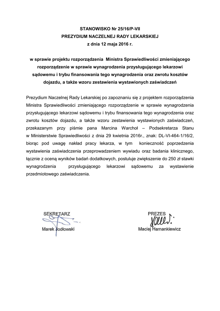 STANOWISKO Nr 25/16/P-VII PREZYDIUM NACZELNEJ RADY LEKARSKIEJ z dnia 12 maja 2016 r. w sprawie projektu rozporządzenia Ministra Sprawiedliwości zmieniającego rozporządzenie w sprawie wynagrodzenia przysługującego lekarzowi sądowemu i trybu finansowania tego wynagrodzenia oraz zwrotu kosztów dojazdu, a także wzoru zestawienia wystawionych zaświadczeń Prezydium Naczelnej Rady Lekarskiej po zapoznaniu się z projektem rozporządzenia Ministra Sprawiedliwości zmieniającego rozporządzenie w sprawie wynagrodzenia przysługującego lekarzowi sądowemu i trybu finansowania tego wynagrodzenia oraz zwrotu kosztów dojazdu, a także wzoru zestawienia wystawionych zaświadczeń, przekazanym przy piśmie pana Marcina Warchoł – Podsekretarza Stanu w Ministerstwie Sprawiedliwości z dnia 29 kwietnia 2016r., znak: DL-VI-464-1/16/2, biorąc pod uwagę nakład pracy lekarza, w tym konieczność poprzedzenia wystawienia zaświadczenia przeprowadzeniem wywiadu oraz badania klinicznego, łącznie z oceną wyników badań dodatkowych, postuluje zwiększenie do 250 zł stawki wynagrodzenia przysługującego przedmiotowego zaświadczenia. lekarzowi sądowemu za wystawienie