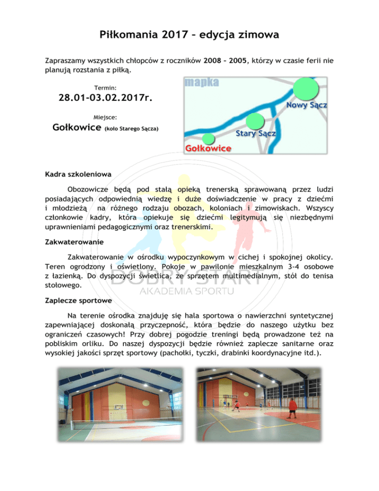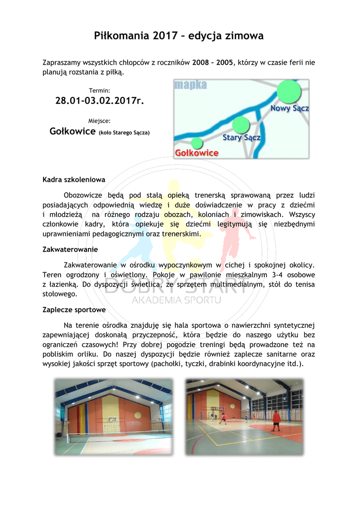 Piłkomania 2017 – edycja zimowa Zapraszamy wszystkich chłopców z roczników 2008 – 2005, którzy w czasie ferii nie planują rozstania z piłką. Termin: 28.01-03.02.2017r. Miejsce: Gołkowice (koło Starego Sącza) Kadra szkoleniowa Obozowicze będą pod stałą opieką trenerską sprawowaną przez ludzi posiadających odpowiednią wiedzę i duże doświadczenie w pracy z dziećmi i młodzieżą na różnego rodzaju obozach, koloniach i zimowiskach. Wszyscy członkowie kadry, która opiekuje się dziećmi legitymują się niezbędnymi uprawnieniami pedagogicznymi oraz trenerskimi. Zakwaterowanie Zakwaterowanie w ośrodku wypoczynkowym w cichej i spokojnej okolicy. Teren ogrodzony i oświetlony. Pokoje w pawilonie mieszkalnym 3-4 osobowe z łazienką. Do dyspozycji świetlica, ze sprzętem multimedialnym, stół do tenisa stołowego. Zaplecze sportowe Na terenie ośrodka znajduję się hala sportowa o nawierzchni syntetycznej zapewniającej doskonałą przyczepność, która będzie do naszego użytku bez ograniczeń czasowych! Przy dobrej pogodzie treningi będą prowadzone też na pobliskim orliku. Do naszej dyspozycji będzie również zaplecze sanitarne oraz wysokiej jakości sprzęt sportowy (pachołki, tyczki, drabinki koordynacyjne itd.). Wyżywienie Cztery smaczne posiłki dziennie (śniadanie, obiad, podwieczorek i kolacja) wydawane będą w stołówce mieszczącej się na terenie ośrodka Szkolenie narciarskie* W przypadku uzbierania grupy min. 15 chętnych osób prowadzone będzie 5 dniowe (poniedziałek – piątek) szkolenie narciarskie. Zajęcia pod okiem instruktorów narciarskich będą odbywały się w utworzonych grupach, podzielonych pod względem umiejętności. Każda z grup będzie doskonaliła jazdę przez 2 godzinny dziennie. Uczestnicy obozu zobowiązani są do posiadania sprzętu narciarskiego w tym kasku (obowiązkowo). Zajęcia narciarskie będą się odbywały na stoku w pobliskim Rytrze (ośrodek narciarski Ryterski Raj) Koszt uczestnictwa w zajęciach narciarskich to 599 zł. Opłata obejmuje: zajęcia z instruktorem, karnet, transport na i ze stoku. Zajęcia dla zapisanych osób prowadzone będą zamiast porannego treningu piłkarskiego. Ramowy plan obozu: 28.01 (sobota) godz. 08.45 zbiórka zawodników ok. godz. 11.30 przyjazd do Gołkowic (kwaterowanie, zapoznanie z regulaminem, obiad, trening, zajęcia programowe, kolacja) 29.01-02.02 realizacja programu sportowo-wychowawczego 03.02 (piątek) (śniadanie, trening, obiad, pakowanie i przygotowanie do drogi, oficjalne zakończenie obozu, ok. godz. 16.00 wyjazd do Krakowa). Całkowity koszt 850 zł. W cenie oferujemy: przejazd tam i z powrotem, zakwaterowanie i wyżywienie, treningi piłki nożnej (ok. 11 jednostek) pod okiem wykwalifikowanych trenerów, mecze sparingowe, wodę na treningi, gry i zabawy na świeżym powietrzu, zajęcia świetlicowe, ubezpieczenie od NNW, opiekę kadry wychowawczej, wyjście na basen, turniej tenisa stołowego, nocny turniej piłkarski, konkurs TURBOKOZAK, testy umiejętności piłkarskich, ognisko z kiełbaskami, upominek niespodziankę na zakończenie obozu, codzienną relację z przebiegu obozu na facebok’u. Doskonałą zabawę i niezapomniane chwile !! Nasze obozy, zgodnie z obowiązującymi przepisami, zgłoszone są do odpowiednich instytucji zajmujących się nadzorem wypoczynku dzieci i młodzieży (m. in. Kuratorium Oświaty). Zapisy: Osoby zainteresowane proszone są o przesłanie maila na adres: [email protected] W tytule wiadomości prosimy wpisać „GOŁKOWICE” a w treści imię i nazwisko dziecka oraz dane kontaktowe do rodzica. Informacje dodatkowe: tel. +48 733 444 614