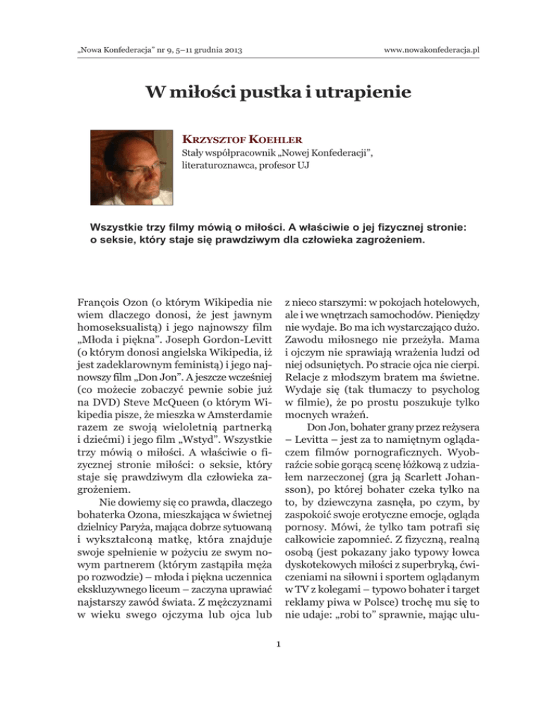 „Nowa Konfederacja” nr 9, 5–11 grudnia 2013 www.nowakonfederacja.pl W miłości pustka i utrapienie Krzysztof Koehler Stały współpracownik „Nowej Konfederacji”, literaturoznawca, profesor UJ Wszystkie trzy filmy mówią o miłości. A właściwie o jej fizycznej stronie: o seksie, który staje się prawdziwym dla człowieka zagrożeniem. François Ozon (o którym Wikipedia nie wiem dlaczego donosi, że jest jawnym homoseksualistą) i jego najnowszy film „Młoda i piękna”. Joseph Gordon-Levitt (o którym donosi angielska Wikipedia, iż jest zadeklarownym feministą) i jego najnowszy film „Don Jon”. A jeszcze wcześniej (co możecie zobaczyć pewnie sobie już na DVD) Steve McQueen (o którym Wikipedia pisze, że mieszka w Amsterdamie razem ze swoją wieloletnią partnerką i dziećmi) i jego film „Wstyd”. Wszystkie trzy mówią o miłości. A właściwie o fizycznej stronie miłości: o seksie, który staje się prawdziwym dla człowieka zagrożeniem. Nie dowiemy się co prawda, dlaczego bohaterka Ozona, mieszkająca w świetnej dzielnicy Paryża, mająca dobrze sytuowaną i wykształconą matkę, która znajduje swoje spełnienie w pożyciu ze swym nowym partnerem (którym zastąpiła męża po rozwodzie) – młoda i piękna uczennica ekskluzywnego liceum – zaczyna uprawiać najstarszy zawód świata. Z mężczyznami w wieku swego ojczyma lub ojca lub z nieco starszymi: w pokojach hotelowych, ale i we wnętrzach samochodów. Pieniędzy nie wydaje. Bo ma ich wystarczająco dużo. Zawodu miłosnego nie przeżyła. Mama i ojczym nie sprawiają wrażenia ludzi od niej odsuniętych. Po stracie ojca nie cierpi. Relacje z młodszym bratem ma świetne. Wydaje się (tak tłumaczy to psycholog w filmie), że po prostu poszukuje tylko mocnych wrażeń. Don Jon, bohater grany przez reżysera – Levitta – jest za to namiętnym oglądaczem filmów pornograficznych. Wyobraźcie sobie gorącą scenę łóżkową z udziałem narzeczonej (gra ją Scarlett Johansson), po której bohater czeka tylko na to, by dziewczyna zasnęła, po czym, by zaspokoić swoje erotyczne emocje, ogląda pornosy. Mówi, że tylko tam potrafi się całkowicie zapomnieć. Z fizyczną, realną osobą (jest pokazany jako typowy łowca dyskotekowych miłości z superbryką, ćwiczeniami na siłowni i sportem oglądanym w TV z kolegami – typowo bohater i target reklamy piwa w Polsce) trochę mu się to nie udaje: „robi to” sprawnie, mając ulu1 „Nowa Konfederacja” nr 9, 5–11 grudnia 2013 2013 www.nowakonfederacja.pl biony zestaw zachowań, którego nie zawsze przestrzega druga strona, co innego w filmach… tam jest zupełnie inaczej. No i bohater filmu „Wstyd”: zdaje się, że najdalej zabrnął w podróży do zaspokojenia. Jego przypadłością jest uzależnienie od seksu. Niekończąca się, niezaspokajalna pasja, potrzeba, przymus, który prawie absolutnie demoluje jego życie, aż po granice rozpaczy. Czy to, że jakoś ostatnio tego typu filmy pojawiły się na naszych ekranach, świadczy o tym, iż kultura, która wszak od jakiegoś już długiego czasu wyciąga nas z domu (i wyciąga nam pieniądze z portfela!), odwołując się w mniej lub bardziej zawoalowanej formie do libido (znamy ten proces wszak nie tylko z kina, ale tak samo z teatru – vide ostatnie awantury ze Starym Teatrem w Krakowie i z domniemanym uprawianiem seksu z dekoracjami w wykonaniu Krzysztofa Globisza czy ze sztuką współczesną: ktoś tam obściskujący się w lubieżnościach z krzyżem), zabrała się wreszcie i do dekonstrukcji owego seksualnego swego motoru? Ukrytej sprężyny nie tylko działań reklamowych, ale i – jak się okazuje – swych wysublimowanych bardziej tworów? Być może film Levitta, a na pewno McQueena można uznać za tego typu głosy. „Wstyd” jest zaś właściwie oskarżeniem gwałtownym owej dzikiej seksualności kultury współczesnej. W jednej ze scen filmu, scenie, która zapewne mogłaby stanowić spełnienie, podejrzewam, najbardziej mrocznych marzeń, jak to się dawniej mawiało, erotomana, czyli seks z wieloma kobietami, widzimy w zbliżeniu udręczoną, pełną niewyobrażalnego cierpienia, jakże smutną, przeraźliwie smutną twarz bohatera (Michael Fassbender). Levitt z iście hollywoodzkim gestem tworzy moralitet o sile prawdziwej miłości. Mamy nadzieję, że bohater odetnie się od swego uzależnienia. Pojawia się tu też ciekawy i dyskusyjny wątek Kościoła katolickiego: spowiedzi. Dyskusyjny on jest dlatego, że nie bardzo wiemy (ale właściwie spieramy się i jako widzowie między sobą, i z reżyserem), czy bohaterowi coś w ogóle przynosiła cotygodniowa spowiedź i – takie odnosimy wrażenie – automatyczna pokuta (dziesięć zdrowasiek, pięć „Ojcze nasz” albo w odwrotnej proporcji). Kiedy się „nawraca” na miłość, po raz pierwszy zadaje pytanie swemu spowiednikowi o ową automatyczność pokuty. W odpowiedzi słyszy tylko „Ufaj, synu”. Co to znaczy? Idźcie, zobaczcie, może wy pojmiecie, my wciąż się tu w domu ze sobą o to spieramy. Czy kultura, która wszak od jakiegoś już długiego czasu wyciąga nas z domu (i wyciąga nam pieniądze z portfela!), odwołując się do libido, zabrała się wreszcie i do dekonstrukcji owego seksualnego swego motoru? U Ozona jest jednak inaczej. Nie ma tu oskarżenia, nie ma rozwiązania; nie mamy żadnej pewności, czy „młoda i piękna” pozostawi za sobą ten przygodowy etap życia. Zresztą dlaczego niby miałaby to uczynić? Seks jest zaraz za ścianą. Rodzinna sielanka: rodzice czekają ze śniadaniem. Ojczym podchodzi, otwiera drzwi do pokoju pasierba: przerywa jego masturbację; podchodzi do pokoju pa2 „Nowa Konfederacja” nr 9, 5–11 grudnia 2013 2013 www.nowakonfederacja.pl sierbicy, ale nie wchodzi, bo przez drzwi słyszy, że dziewczyna uprawia seks ze swym chłopakiem. Schodzi na dół, mówi do kobiety: „Nie czekajmy na nich. Szybko nie zejdą”. No to po co