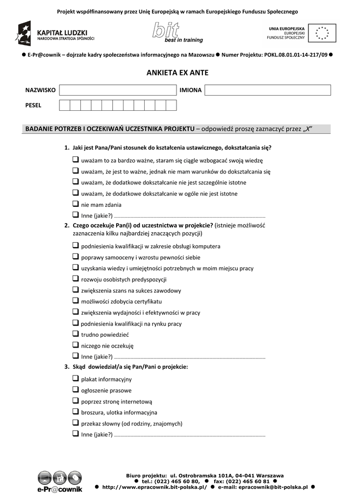 Projekt współfinansowany przez Unię Europejską w ramach Europejskiego Funduszu Społecznego best in training ● E-Pr@cownik – dojrzałe kadry społeczeństwa informacyjnego na Mazowszu ● Numer Projektu: POKL.08.01.01-14-217/09 ● ANKIETA EX ANTE NAZWISKO IMIONA PESEL BADANIE POTRZEB I OCZEKIWAŃ UCZESTNIKA PROJEKTU – odpowiedź proszę zaznaczyć przez „X” 1. Jaki jest Pana/Pani stosunek do kształcenia ustawicznego, dokształcania się? uważam to za bardzo ważne, staram się ciągle wzbogacać swoją wiedzę uważam, że jest to ważne, jednak nie mam warunków do dokształcania się uważam, że dodatkowe dokształcanie nie jest szczególnie istotne uważam, że dodatkowe dokształcanie w ogóle nie jest istotne nie mam zdania Inne (jakie?) ………………………………………………………………………………………………………………………… 2. Czego oczekuje Pan(i) od uczestnictwa w projekcie? (istnieje możliwość zaznaczenia kilku najbardziej znaczących pozycji) podniesienia kwalifikacji w zakresie obsługi komputera poprawy samooceny i wzrostu pewności siebie uzyskania wiedzy i umiejętności potrzebnych w moim miejscu pracy rozwoju osobistych predyspozycji zwiększenia szans na sukces zawodowy możliwości zdobycia certyfikatu zwiększenia wydajności i efektywności w pracy podniesienia kwalifikacji na rynku pracy trudno powiedzieć niczego nie oczekuję Inne (jakie?) ………………………………………………………………………………………………………………………… 3. Skąd dowiedział/a się Pan/Pani o projekcie: plakat informacyjny ogłoszenie prasowe poprzez stronę internetową broszura, ulotka informacyjna przekaz słowny (od rodziny, znajomych) Inne (jakie?) ………………………………………………………………………………………………………………………… Biuro projektu: ul. Ostrobramska 101A, 04-041 Warszawa ● tel.: (022) 465 60 80, ● fax: (022) 465 60 81 ● ● http://www.epracownik.bit-polska.pl/ ● e-mail: [email protected] ● Projekt współfinansowany przez Unię Europejską w ramach Europejskiego Funduszu Społecznego best in training ● E-Pr@cownik – dojrzałe kadry społeczeństwa informacyjnego na Mazowszu ● Numer Projektu: POKL.08.01.01-14-217/09 ● KWALIFIKACJE W ZAKRESIE OBSŁUGI KOMPUTERA Proszę zakreślić odpowiedź (odpowiednia cyfra w szarym polu), która najtrafniej wyraża Państwa opinię: 1. 2. 3. 4. 5. ZDECYDOWANIE SIĘ NIE ZGADZAM (gdy to stwierdzenie jest całkowicie nietrafne), NIE ZGADZAM SIĘ (gdy to stwierdzenie jest raczej nie trafne), TRUDNO POWIEDZIEĆ, ZGADZAM SIĘ (gdy to stwierdzenie jest raczej trafne), ZDECYDOWANIE SIĘ ZGADZAM (gdy to stwierdzenie jest całkowicie trafne) ODPOWIEDZI Znajomość obsługi komputera pozwoli mi zwiększyć szanse na sukces zawodowy. Boję się utraty pracy w związku z posiadaniem zbyt małej wiedzy z obsługi 2. komputera. 1. 1 2 3 4 5 1 2 3 4 5 3. Uważam, że znajomość obsługi komputera ułatwia moją pracę. 1 2 3 4 5 4. Uważam, iż poznanie obsługi komputera zwiększy moją efektywność pracy. 1 2 3 4 5 1 2 3 4 5 1 2 3 4 5 1 2 3 4 5 1 2 3 4 5 1 2 3 4 5 5. 6. 7. 8. 9. Kiedy mam problem w obsłudze komputera, muszę poprosić kogoś o pomoc. Nieznajomość obsługi komputera powoduje, że czuję się mniej wykwalifikowany (-ana) w pracy. Czuję się niekomfortowo, gdy pracuję na komputerze w obecności osób trzecich. Wolę udawać, że nie mam problemu z obsługą komputera, niż przyznać się do niewiedzy. Korzystam z komputera tylko w ostateczności, na co dzień wolę tradycyjne metody: kartka, długopis, kalkulator. Miejscowość i data Czytelny podpis Uczestnika Projektu Biuro projektu: ul. Ostrobramska 101A, 04-041 Warszawa ● tel.: (022) 465 60 80, ● fax: (022) 465 60 81 ● ● http://www.epracownik.bit-polska.pl/ ● e-mail: [email protected] ●