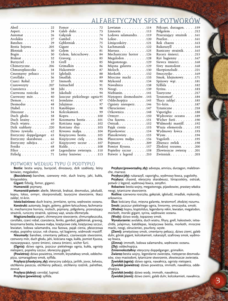 ALFABETYCZNY SPIS POTWORÓW . 22 . 24 . 26 . 27 . 29 .205 . 30 . 30 . 32 . 33 .206 . 34 . 35 . 36 . 37 .207 . 38 . 39 . 40 . 41 . 48 . 51 . 54 . 58 . 59 . 60 .220 . 62 . 65 . 66 . 67 . 68 . 69 . 71 Fomor . . . . . . . . . . . 72 Galeb duhr. . . . . . . . . 73 Gałęziak . . . . . . . . . . 74 Gambol . . . . . . . . . . . 74 Gębłotniak . . . . . . . . . 75 Gigant . . . . . . . . . . . 76 Golem . . . . . . . . . . . 81 Golem, łańcuchowy . . . . 84 Gravorg . . . . . . . . . . . 85 Grell . . . . . . . . . . . . 85 Grimalkin . . . . . . . . . 86 Hakostwór . . . . . . . . . 87 Igłoludź. . . . . . . . . . . 88 Imadlak. . . . . . . . . . . 89 Immoth. . . . . . . . . . . 90 Ixitxachitl . . . . . . . . . 91 Jahi . . . . . . . . . . . . . 93 Jakoludź . . . . . . . . . . 94 Jaszczur piekielnego ognia 95 Jermlaine . . . . . . . . . . 97 Julajimus . . . . . . . . . . 97 Katoblepas . . . . . . . . . 98 Kolcokamień . . . . . . . . 99 Kopru. . . . . . . . . . . .100 Koszmarna bestia . . . . .101 Kościana naga . . . . . . .102 Kościany śluz . . . . . . .103 Krwawa małpa. . . . . . .104 Księżycowa bestia . . . . .105 Księżycowe cielę . . . . .106 Księżycowy szczur . . . .107 Kukła . . . . . . . . . . . .108 Legendarne zwierzęta. . .110 Leśny leniwiec . . . . . .113 POTWORY WEDŁUG TYPU (I PODTYPU) Bestia: bestia wojny, burzyciel, dinozaury, dzik szablasty, leśny leniwiec, megalodon. (Bezcielesne): banshee, czerwony mór, duch krainy, jahi, kukła, lśniącoskóry. Gigant: firbolg, fomor, giganci. Humanoid: pojmany. Humanoid-potwór: abeile, błotniak, braksat, desmodus, jakoludź, kopru, lokso, ormyrr, skorpionoludź, tauryczne stworzenie, tkacz zaklęć, tri-krin. Istota baœniowa: duch krainy, jermlaine, syrina, wędrowiec oceanu. Konstrukt: automaty, bogin, golemy, golem łańcuchowy, łachmaniaki, mechaniczne horrory, moloch, pojmany, półgolemy, przerażający strażnik, runiczny strażnik, spiżowy wąż, wraża efemeryda. Magiczna bestia: asperi, chimeryczne stworzenie, chmuropłaszczka, corollaks, czarci robal, czarożerca, feniks, gambol, gębłotniak, gravorg, koszmarna bestia, krwawa małpa, księżycowe cielę, księżycowy szczur, lewiatan, lodowa salamandra, osa fazowa, pająk cienia, płaszczowa małpa, popielny szczur, rok chaosu, ryś bagienny, widmooki mastiff. Nieumarły: banshee, cmentarny pełzacz, czarowszyte stworzenie, czerwony mór, duch głodu, jahi, kościana naga, kukła, pomiot Kyussa, rozszarpywacz, rycerz śmierci, siewca śmierci, wicher furii. (Ognia): dziwo ognia, jaszczur piekielnego ognia, kukła, ognisty nietoperz, popielny szczur, słoneczny gigant. (Powietrza): dziwo powietrza, immoth, kryształowy smok, oddechopijca, szmaragdowy smok, sylfida. Przybysz (chaotyczny, zły): eteryczny zabójca, jarilith, jovoc, kelvezu, otchłanna paszcza, otchłanny pełzacz, otchłanny rzeźnik, palrethee, zovvut. Przybysz (dobry): cervidal, lupinal. Przybysz (powietrza): sylfida. Lewiatan . . . . . . . . . Linnorm . . . . . . . . . Lodowa salamandra . . . Lokso . . . . . . . . . . . Lśniącoskóry . . . . . . . Łachmaniak . . . . . . . Marrasz . . . . . . . . . . Mechaniczny horror . . Megalodon . . . . . . . . Megastonoga . . . . . . . Mięsna galareta . . . . . Moloch . . . . . . . . . . Morkoth . . . . . . . . . Mroczne macki . . . . . Mykonid . . . . . . . . . Nawałnica . . . . . . . . Neogi . . . . . . . . . . . Niebianin. . . . . . . . . Nietoperz desmodusów. Oddechopijca . . . . . . Ognisty nietoperz . . . . Okrucieniec . . . . . . . Orkownica . . . . . . . . Ormyrr . . . . . . . . . . Osa fazowa. . . . . . . . Ostrzak . . . . . . . . . . Pająk cienia . . . . . . . Pijawkowiec . . . . . . . Planokrwisty . . . . . . . Płaszczowa małpa . . . . Pojmany . . . . . . . . . Pomiot Kyussa. . . . . . Popielny szczur . . . . . Potwór z legend . . . . .114 .115 .119 .120 .121 .122 .125 .126 .128 .129 .129 .130 .132 .133 .134 .138 .139 .141 .143 .145 .146 .147 .148 .150 .151 .152 .153 .154 .155 .156 .209 .157 .158 .210 Półczart, durzagon. . Półgolem . . . . . . . Przerażający strażnik Psurlon . . . . . . . . Rok chaosu . . . . . Rukarazyll . . . . . . Runiczny strażnik. . Rycerz śmierci. . . . Ryś bagienny . . . . Siewca śmierci. . . . Siwy mastodont . . . Skorpionoludź . . . . Smoczysko . . . . . . Smok, klejnotowy . . Spiżowy wąż . . . . . Sylfida . . . . . . . . Syrina. . . . . . . . . Tauryczne . . . . . . Teratomorf . . . . . . Tkacz zaklęć . . . . . Tri-krin. . . . . . . . Tytaniczne . . . . . . Vaporighu . . . . . . Wędrowiec oceanu . Wicher furii . . . . . Widmooki mastiff. . Wraża efemeryda . . Wydmowy łowca . . Wyste . . . . . . . . . Yugoloth . . . . . . . Zbieracz zwłok . . . Złodziej rozumu. . . Złowieszcze zwierzę Zwinniak . . . . . . . . . . . . . . . . . . . . . . . . . . . . . . . . . . . . . . . . . . . . . . . . . . . . . . . . . . . . . . . . . . . . . . . . . . . .159 .212 .161 .161 .163 .164 .165 .215 .167 .168 .168 .221 .169 .171 .181 .182 .183 .217 .184 .185 .187 .218 .188 .189 .190 .192 .192 .193 .194 .195 .198 .200 .201 .203 Przybysz (praworz¹dny, zły): advespa, amnizu, durzagon, malebranche, marrasz. Przybysz (zły): rukarazyll, vaporighu, wydmowy łowca, yugolothy. Przybysz: chaond, eteryczny skarabeusz, lśniącoskóry, ostrzak, potwór z legend, wydmowy łowca, zenythri. Robactwo: bestia wojny, megastonoga, pijawkowiec, prastary władca neogi, tytaniczne stworzenie. Roœlina: czerwona rosiczka, gałęziak, igłoludź, imadlak, mykonidy, orkownica. Œluz: kościany śluz, mięsna galareta, teratomorf, złodziej rozumu. Smok: jaszczur piekielnego ognia, linnormy, smoczyska, smoki. (Wodne): kopru, kryptolidus, legendarny rekin, lewiatan, megalodon, morkoth, morski gigant, syrina, wędrowiec oceanu. (Wody): dziwo wody, topazowy smok. Wynaturzenie: avolakia, duch wiatru, fihyry, grell, hakostwór, ixitxachitle, julajimus, katoblepas, księżycowa bestia, morkoth, mroczne macki, neogi, okrucieniec, psurlony