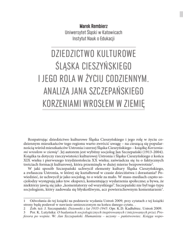 Marek Rembierz Uniwersytet Śląski w Katowicach Instytut Nauk o Edukacji Dziedzictwo kulturowe Śląska Cieszyńskiego i jego rola w życiu codziennym. Analiza Jana Szczepańskiego Korzeniami wrosłem w ziemię Rozpatrując dziedzictwo kulturowe Śląska Cieszyńskiego i jego rolę w życiu codziennym mieszkańców tego regionu warto zwrócić uwagę – na cieszącą się popularnością wśród mieszkańców Ustronia i szerzej Śląska Cieszyńskiego – książkę Korzeniami wrosłem w ziemię1. Jej autorem jest wybitny socjolog Jan Szczepański (1913-2004). Książka ta dotyczy rzeczywistości kulturowej Ustronia i Śląska Cieszyńskiego z końca XIX wieku i pierwszego trzydziestolecia XX wieku; zaświadcza się tu o faktycznych treściach formacji kulturowej, która przeminęła w dużej mierze bezpowrotnie2. W jaki sposób Szczepański uchwycił elementy kultury Śląska Cieszyńskiego, a zwłaszcza Ustronia, w której się kształtował w czasie dzieciństwa i dorastania? Powiedzieć, że uchwycił je jako socjolog, to o wiele za mało. W mass-mediach często socjolodzy występują jako tzw. eksperci, komentujący wydarzenia społeczne; a bywa, że niektórzy jawią się jako „komentatorzy od wszystkiego”. Szczepański nie był tego typu socjologiem, który zadowala się błyskotliwym, acz powierzchownym komentarzem3. 1 Odwołania do tej książki na podstawie wydania Ustroń 2009; przy cytatach z tej książki strony będę podawał w nawiasie umieszczonym na końcu danego cytatu. . 2 Zob. też: J. Szczepański: Dzienniki z lat 1935-1945. Opr. K.D. Kadłubiec. Ustroń 2009. 3 Por. K. Lutyńska: O badaniach socjologicznych inspirowanych i inicjowanych przez Profesora po wojnie. W: Jan Szczepański. Humanista – uczony – państwowiec. Księga wspo- Marek Rembierz: Dziedzictwo kulturowe Śląska Cieszyńskiego... 189 Dążył do pogłębionego zrozumienia znaczenia interesujących go zjawisk. Korzeniami wrosłem w ziemię także przenika takie dążenie4. Określając postawę badawczą Szczepańskiego należy uwzględnić, że jego droga do socjologii wiodła przez filozofię. I to w dwójnasób: filozofia odegrała istotną rolę w edukacji licealnej i w czasie studiów. W cieszyńskim liceum miał Szczepański lekcje filozofii z Julianem Przybosiem (1901-1970). Podstawą była książka Wstęp do filozofii, autorstwa wiedeńskiego filozofa i pedagoga Wilhelma Jerusalema (1854-1923). Jedna czwarta treści tego podręcznika dotyczy zagadnień należących do socjologii. Szczepański zaświadcza, że po raz pierwszy na lekcjach filozofii zetknął się on z socjologią. I uznał ją za dziedzinę, która pozwala mu lepiej zrozumieć świat i lepiej zrozumieć siebie. Fascynacja socjologią ma źródło w zajęciach z filozofii, służących rozbudzaniu i systematyzowaniu pogłębionej refleksji nad światem. Dociekanie sensu zjawisk i istoty tego, co jest nam dane w naszym doświadczaniu świata jest stale obecne w „socjologii rozumiejącej” Szczepańskiego5. W Korzeniami wrosłem w ziemię zastanawia się on, jakie ma znaczenie dla jego osobowej tożsamości, że kształtował się w środowisku kulturowym Ustronia, jaki to nadało sens jego postawie życiowej? Autor pyta o znaczenie tego, co go ukształtowało i co zarazem nadaje znaczenie jego egzystencji, o trwały sens zdarzeń codziennych, uchodzących z pamięci, które wszakże wydatnie formują ludzką tożsamość6. Jan Szczepański łączy na kartach Korzeniami wrosłem w ziemię i w swej postawie badawczej dwie różniące się kultury intelektualne – kulturę filozoficzną i socjologiczną. A przecież niektórzy wskazują na dość radykalne rozdarcie między nastawieniem badawczym filozofa i nastawieniem socjologa w sprawach społecznych. „Ziejąca przepaść” między oglądem rzeczywistości dokonanym przez filozofa i przez socjologa – jak ujmuje to Tadeusz Kotarbiński – bierze się stąd, że socjolog „pracuje na materiale dziejów, gromad ludzkich, kultur masowych” i częstokroć bywa „urzeczony fikcją rzeczywistości społecznej ponadindywidualnej, a różnej od międzyosobniczych stosunków”7. Natomiast filozof nie wierzy w ową fikcję rzeczywistości społecznej, lecz swą uwagę kieruje na relacje międzyludzkie; zazwyczaj przyjmuje inną koncepcję rzeczywistości społecznej, wręcz inną wizję świata. To nie ogólna fikcja rzeczywistości społecznej ponadindywidualnej, ale fundamentalne relacje międzyosobowe interesują filozofa. Szczepański, będąc socjologiem, nie dał się uwieść fikcji rzeczywistości społecznej i zwracał uwagę – w Korzeniami wrosłem w ziemię oraz w dociekaniach o indywidualności i sprawach ludzkich – na relacje międzyosobowe. Nie tylko relacje międzyjednostkowe, ale właśnie międzyosobowe. Pytał o to, jak kształtuje się ludzki umysł, ludzka wyobraźnia i ludzki charakter, a nie tylko o to jak kształtują się wielkie grupy społeczne i zależne od nich tożsamości i role społeczne. Jeśli popatrzymy na te pytania w kontekście wielkiego mnień. Red. J. Kulpińska. Warszawa 2005, s. 146-151; K. Łęcki: Profesor i „socjologiczny odruch warunkowy”. W: Jan Szczepański. Humanista…, s. 157-163. 4 Por. M. Porębski: Jan z Brzeziny. W: Jan Szczepański. Humanista…, s. 90-96. 5 Zob. J. Szczepański: Interpretacja i rozumienie ludzkiego zachowania. W: Tenże: Odmiany czasu teraźniejszego. Warszawa 1973, s. 499-518. 6 Zob. M. Rembierz: Źródła i dylematy tożsamości. Filozofia wobec pytań o treść tożsamości i sens egzystencji. „Colloquia Communia” (Tożsamość człowieka wobec życia i śmierci) 2 (69) 1999. Red. J. Mizińska i H. Rarot, Lublin 1999, s. 11-39. 7 T. Kotarbiński: Myśli o ludziach i ludzkich sprawach. Wrocław 1986, s. 240-241. 190 Dziedzictwo kulturowe • Kulturní dědictví konfliktu XX wieku między systemami kolektywistycznymi a systemami akcentującymi istnienie i wolność jednostki, to S