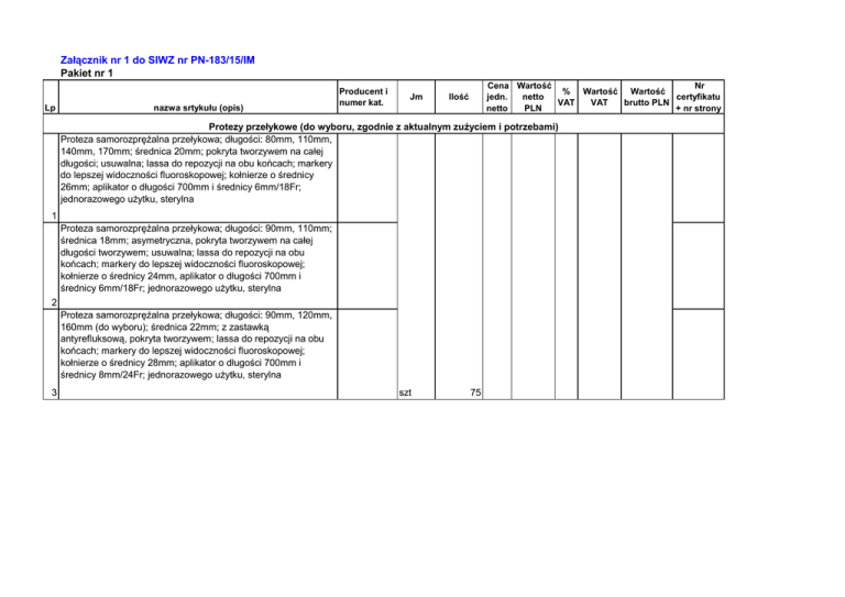 Załącznik nr 1 do SIWZ nr PN-183/15/IM Pakiet nr 1 Lp nazwa srtykułu (opis) Producent i numer kat. Jm Cena Wartość Nr % Wartość Wartość jedn. netto certyfikatu VAT VAT brutto PLN netto PLN + nr strony Ilość Protezy przełykowe (do wyboru, zgodnie z aktualnym zużyciem i potrzebami) Proteza samorozprężalna przełykowa; długości: 80mm, 110mm, 140mm, 170mm; średnica 20mm; pokryta tworzywem na całej długości; usuwalna; lassa do repozycji na obu końcach; markery do lepszej widoczności fluoroskopowej; kołnierze o średnicy 26mm; aplikator o długości 700mm i średnicy 6mm/18Fr; jednorazowego użytku, sterylna 1 Proteza samorozprężalna przełykowa; długości: 90mm, 110mm; średnica 18mm; asymetryczna, pokryta tworzywem na całej długości tworzywem; usuwalna; lassa do repozycji na obu końcach; markery do lepszej widoczności fluoroskopowej; kołnierze o średnicy 24mm, aplikator o długości 700mm i średnicy 6mm/18Fr; jednorazowego użytku, sterylna 2 Proteza samorozprężalna przełykowa; długości: 90mm, 120mm, 160mm (do wyboru); średnica 22mm; z zastawką antyrefluksową, pokryta tworzywem; lassa do repozycji na obu końcach; markery do lepszej widoczności fluoroskopowej; kołnierze o średnicy 28mm; aplikator o długości 700mm i średnicy 8mm/24Fr; jednorazowego użytku, sterylna 3 szt 75 Protezy do dróg żółciowych (do wyboru, zgodnie z aktualnym zużyciem i potrzebami) Proteza samorozprężalna do dróg żółciowych, usuwalna; pokrywana na całej długości tworzywem; wykonana z metalu; z listkami zapobiegającymi migracji; długości: 40mm, 60mm, 80mm, 100mm; średnica 10mm; średnica kołnierza proksymalnego ok. 13,5mm; aplikator o długości 1800mm i średnicy 9,5 Fr; proteza kompatybilna z prowadnicą 0,038”; znaczniki dla lepszej widoczności fluoroskopowej; podwójny system kontroli punktu, po przekroczeniu którego nie można wycofać protezy do aplikatora: znacznik radiologiczny i graficzny 4 na aplikatorze; jednorazowego użytku, sterylna Proteza samorozprężalna do dróg żółciowych, usuwalna; pokrywana na całej długości tworzywem; wykonana z metalu; z listkami zapobiegającymi migracji; długości: 40mm, 60mm, 80mm, 100mm; średnica 10mm; średnica kołnierzy 13,5mm; aplikator o długości 1800mm i średnicy 10,2 Fr; 2 lassa z tworzywa, krótsze i dłuższe (na dłuższym znaczniki); proteza kompatybilna z prowadnicą 0,038”; znaczniki dla lepszej widoczności fluoroskopowej; podwójny system kontroli punktu, po przekroczeniu którego nie można wycofać protezy do aplikatora: znacznik radiologiczny i graficzny na aplikatorze; szt 75 5 jednorazowego użytku, sterylna Protezy dojelitowe (do wyboru, zgodnie z aktualnym zużyciem i potrzebami) Proteza samorozprężalna dojelitowa; wykonana z metalu; niepokrywana; wprowadzana przez kanał roboczy endoskopu; długości: 80mm, 110 mm, 140mm; średnica 24mm; średnica kołnierzy 28mm; aplikator o długości 2300mm i średnicy 10,2Fr; 6 jednorazowego użytku, sterylna szt 75 Protezy do dwunastnicy i odźwiernika (do wyboru, zgodnie z aktualnym zużyciem i potrzebami) Proteza samorozprężalna do dwunastnicy i odźwiernika, wykonana z metalu; niepowlekana; długości: 80mm, 110mm, 140mm; średnica 20mm; średnica kołnierzy 25mm; aplikator o długości 2300mm i średnicy 10,2Fr; jednorazowego użytku, 7 sterylna Proteza samorozprężalna do dwunastnicy i odźwiernika, wykonana z metalu; częściowo pokrywana tworzywem; długości: 90mm, 110mm; średnica 20mm; średnica kołnierzy 26mm; aplikator o długości 2300mm i średnicy 10,2Fr; jednorazowego 8 użytku, sterylna razem PLN: szt 75 W celu dokonania oceny cech użytkowych Wykonawca zobowiązany jest do nieodpłatnego złożenia próbek w ilości: po 2 szt z pozycji 1,4,5. poz. 1 (dł. 110 mm) - 2 szt poz. 4 (dł. 60 mm) - 2 szt poz. 5 (dł. 80 mm) - 2 szt Wartość netto: .................... PLN (słownie: …………………………………...……………………………………………………………. PLN) Wartość brutto: .................... PLN (słownie: ………………………………………………………………………………………………………….. PLN) ........................................ (data, pieczęć, podpis) Pakiet nr 2 Lp Nazwa artykułu (opis) Cewnik popychający (popychacz) do protez średnicy 7Fr; 1 długość robocza 1600mm, minimalna średnica kanału roboczego 2,8mm; kompatybilny z protezami średnicy 7Fr; wielorazowego użytku; do sterylizacji parą wodną w nadciśnieniu Zestaw do wprowadzania protez o średnicy 8,5Fr, wstępnie złożony zawierający razem złożone i pakowane: cewnik teflonowy wprowadzający (wielorazowego użytku) i popychacz 2 (wielorazowego użytku); długość robocza 1550mm, minimalna średnica kanału roboczego 3,2mm; kompatybilny z prowadnicą 0,035", kompatybilny z protezami średnicy 8,5Fr; do sterylizacji parą wodną w nadciśnieniu Zestaw do wprowadzania protez o średnicy 10Fr, wstępnie złożony zawierający razem złożone i pakowane: cewnik teflonowy wprowadzający (wielorazowego użytku) i popychacz 3 (wielorazowego użytku); długość robocza 1550mm, minimalna średnica kanału roboczego 3,7mm; kompatybilny z prowadnicą 0,035", kompatybilny z protezami średnicy 10Fr; do sterylizacji parą wodną w nadciśnieniu Zestaw do wprowadzania protez o średnicy 12Fr, wstępnie złożony zawierający razem złożone i pakowane: cewnik teflonowy wprowadzający (wielorazowego użytku) i popychacz 4 (wielorazowego użytku); długość robocza 1550mm, minimalna średnica kanału roboczego 4,2mm", kompatybilny z protezami średnicy 12Fr; do sterylizacji parą wodną w nadciśnieniu Producent i numer kat. Jm Nr Cena Wartość % Wartość Wartość certyfikatu jedn. netto VAT VAT brutto PLN + nr strony netto PLN w ofercie Ilość szt 3 szt 10 szt 10 szt 10 Prowadnica giętka; średnica: 0,025”, 0,035"; dł. robocza 4500mm; końcówki: prosta i 
