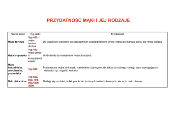 PRZYDATNOŚĆ MĄKI I JEJ RODZAJE Nazwa mąki Typ mąki Przydatność Typ 450 – mąka Mąka tortowa Do wszelkich wypieków ze szczególnym uwzględnieniem tortów. Mąka jest bardzo jasna, ale mniej lepiąca. bardzo drobna Typ 450 – mąka gruba Mąka krupczatka o Wyśmienita do makaronów i ciast kruchych. konsystencji kaszki Mąka koszalińska, Podstawowa mąka do klusek, naleśników i pierogów, ale także do różnego rodzaju ciast wymagających Typ 500 wrocławska, kleistości np.: rogaliki, krokiety. poznańska Typ 550, 650, 750, Mąki piekarnicze Nadają się na chleb, bułki, precle lub do innych celów kulinarnych, ale są to mąki ciemne. 850,1800, 2000. Mąka towarzyszy nam od tysięcy lat. Początkowo wytwarzano ją rozcierając ziarna roślin pomiędzy dwoma kamieniami. Z uzyskanego w ten sposób proszku, wymieszanego z wodą, powstawało pierwsze pieczywo - podpłomyki wypiekane na gorących kamieniach. Wraz z postępem technologicznym i rozwojem młynarstwa mąkę zaczęto produkować na szeroką skalę. Stała się również niezbędna w naszej kuchni. Chlebowa czy niechlebowa? Choć najbardziej popularna jest pszenna, mąkę można i wytwarza się również z innych zbóż. W naszym kraju znana i chętnie używana jest mąka żytnia, dobra do wypieku pieczywa oraz wyrobu zakwasu na żur . Zarówno mąkę pszenną, jak i żytnią zalicza się do mąk chlebowych. Te mąki, których zwykle nie używa się do produkcji pieczywa (ewentualnie jako dodatek do mąk chlebowych), określa się z kolei jako niechlebowe. Wśród nich znajdziemy np.: mąkę gryczaną (przygotujemy z niej tradycyjne bliny gryczane), jęczmienną, owsianą, z prosa (zwaną czasem jaglaną), a także kukurydzianą (z bardzo drobnej wyrabia się np. tortille), ryżową (doskonałą np. do zagęszczania sosów) czy sojową (stosowaną czasem jako zamiennik jaj, ze względu na wysoką zawartość protein). Niemal wszystkie mąki niechlebowe, oprócz jęczmiennej i owsianej, poleca się alergikom, a także chorym na celiakię, ze względu na to, że nie zawierają glutenu. Typ mąki - co to takiego? W zależności od tego, jak drobno zmielone i jak dobrze oczyszczone zostanie ziarno, uzyskamy różne typy mąki. Delikatniejszą i bielszą mąkę pozyskuje się głównie z wewnętrznej części ziarna - tzw. bielma. W ciemniejszych mąkach, np. razowej, oprócz bielma znajdziemy również fragmenty jego zewnętrznej warstwy - tzw. okrywy owocowo-nasiennej. Mniej oczyszczone mąki są przez to bogatsze w cenne dla naszego zdrowia składniki, np. błonnik i minerały. Zawartość minerałów jest istotna nie tylko dla naszego zdrowia. Pozwala także określić typ mąki. Aby tego dokonać należy spalić próbkę mąki w wysokiej temperaturze (ok. 950 stopni Celsjusza). Im więcej substancji mineralnych, tym więcej pozostanie popiołu. Jego procentowa ilość (względem ilości spalonej mąki) pomnożona przez 1000 to właśnie typ mąki. Przykładowo, zawartość popiołu - a więc substancji mineralnych - w jasnej, bardzo oczyszczonej mące typu 450 to 0,45%, a w razowej typu 2000 - aż 2%. MĄKA fot. Fotolia 1. MĄKA AMARANTUSOWA Opis: wytwarzana jest z ziaren amarantusa. Jest to jedna ze starszych odmian mąk, ponieważ wyrabiana jest od ok 5000 lat. Mąka amarantusowa jest mąką lekkostrawną oraz bezglutenową. Charakteryzuje się ogromną zawartością żelaza, fosforu, wapnia oraz magnezu. Przez dietetyków jest polecana dla osób stosujących dietę bezmięsną, ponieważ zawiera dużo aminokwasów oraz mnóstwo energii. Stosowana w cukiernictwie oraz piekarnictwie po odpowiednim zmieszaniu z innym rodzajem mąki. W wypiekach, które nie muszą rosnąć może być wykorzystywana sama mąka amarantusowa. Ponadto mąka amarantusowa nadaje wypiekom charakterystyczny orzechowy posmak i zapach. 2. MĄKA ATTA Opis: główny produkt do wyrabiania indyjskiego chlebka chapatis, który często podawany jest do większości indyjskich potraw. Mąka atta wykorzystywana jest jako podstawa przy wykonaniu placków roti, drożdżowego ciasta naan, oraz placka tandor. 3. MĄKA BESAN Opis: zastosowanie znalazła przy produkcji pasztetów, omletów, pulpetów i klopsów. W kuchni wegetariańskiej zastępuje jajka, po zmieszaniu w idealnych proporcjach z wodą. Wykorzystywana jako panierka, np. do ziemniaków, zagęszczacz do zup sosów. Zaliczana jest do mąk ciężkich i nie może być wykorzystywana do wyrobów cukierniczych. 4. MĄKA GLUTENOWA Opis: głównie wykorzystywana do produkcji makaronów, klusek, past mącznych, chleba, płatków śniadaniowych. Stosowana do rozluźnienia struktury i zwiększenia objętości potraw. 5. MĄKA GORCZYCZNA CIEMNA Opis: stosuje się jako dodatek do produkcji ciemnego pieczywa. 6. MĄKA GORCZYCZNA JASNA Opis: dodatek do mąki pszenicznej i żytniej w wyrobach piekarniczych. 7. MĄKA GROCHOWA Opis: mąka bezglutenowa wytwarzana ze zmielonego ziarna grochu. Stosowana w piekarnictwie w połączeniu z inną mąką. Może być używana jako dodatek do zup warzywnych. Jest bogata w białko, błonnik oraz witaminy. 8. MĄKA GRYCZANA Opis: w połączeniu z mąka pszenną, stosowana do wypieku pieczywa, dzięki czemu nabiera ono bardziej intensywnego smaku. W Japonii dodawana jest do makaronu soba, a w Rosji do słynnych blin, w Stanach Zjednoczonych stanowi podstawowy element ciasta naleśnikowego. Mąka gryczana dodawana jest potraw kuchni indyjskiej. 9. MĄKA JĘCZMIENNA Opis: w połączeniu z innymi składnikami jest dodawana do wyrobu pieczywa, klusek i placków. 10.MĄKA KASZTANOWA Opis: wytwarzana z ususzonych kasztanów jadalnych. W sztuce kulinarnej mąka kasztanowa wykorzystywana jest przeważnie do wyrobu ciast oraz chleba, ponieważ podczas obróbki termicznej wypieki z zawartością opisywanej mąki stają się bardzo pulchne. Ponadto w połączeniu z mąką pszenną bądź jęczmienną można wyrabiać wszelkiego rodzaju placki, racuchy oraz różnego rodzaju desery. M