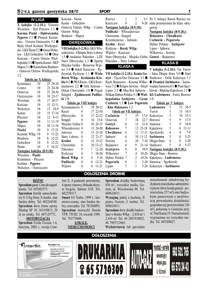 N O W A gazeta gostyñska 38/11 IV LIGA X kolejka (1-2.10.): Victoria Wrzenia - Stal Pleszew 1:1 l Korona Piaski - D¹broczanka Pêpowo 2:1 l P³omyk Kominiec - Victoria Ostrzeszów 5:2 l Bia³y Orze³ Komin Wielkopolski - LKS lesin 3:2 l Grom Wolsztyn - LKS Go³uchów 3:0 l Obra Kocian - Centra Ostrów Wielkopolski 3:1l Sparta Konin - SKP S³upca 3:1 l Kasztelania Brudzew - Ostrovia Ostrów Wielkopolski 1:2 Tabela po X kolejce Kominiec 10 25 29-10 Centra 10 23 24-10 Ostrovia 10 23 20-10 Ostrzeszów 10 18 23-17 Wrzenia 10 17 24-17 Kocian 10 15 12-11 Wolsztyn 10 15 18-9 Konin 10 15 17-14 Pleszew 10 12 9-15 Pêpowo 10 11 11-19 S³upca 10 10 11-18 Piaski 10 9 17-21 Komin Wlkp. 10 9 13-22 Brudzew 10 8 12-22 Go³uchów 10 8 12-22 lesin 10 5 18-32 Nastêpna kolejka (8-9.10): Wrzenia - Piaski Kominiec - Pleszew Komin - Pêpowo Wolsztyn - Ostrzeszów SPORT Kocian - lesin Konin - Go³uchów Ostrovia Ostrów Wlkp. - Centra Ostrów Wlkp. Brudzew - S³upca OKRÊGÓWKA VIII kolejka (1-2.10.): GKS W³oszakowice - Olimpia Stary Lubosz 1:5 l Awdaniec Pakos³aw - LZS Stare Oborzyska 1:2 l Sparta Miejska Górka - Brenewia Wijewo 5:4 l Sokó³ Kaszczor - Rydzyniak Rydzyna 1:1 l Wis³a Borek Wlkp. - Krobianka Krobia 0:2 l PKS Racot - GKS Krzemieniewo 2:2 l Orla Jutrosin Orkan Chorzemin 1:0 l Pogoñ migiel - Zjednoczeni Pudliszki 2:0 Tabela po VIII kolejce Krzemieniewo 8 19 20-12 Racot 8 17 22-10 Oborzyska 8 17 22-12 migiel 8 16 13-8 Miejska Górka 8 16 24-15 W³oszakowice 8 13 24-20 Jutrosin 8 13 23-16 Stary Lubosz 8 12 21-17 Krobia 8 12 15-12 Chorzemin 8 10 13-12 Pakos³aw 9 7 12-20 Rydzyna 8 7 10-20 Borek Wlkp. 8 6 5-16 Pudliszki 8 6 12-21 Wijewo 8 4 11-21 Rawicz 1 3 3-1 Kaszczor 8 2 9-26 Nastêpna kolejka (8-9.10): Pudliszki - W³oszakowice Chorzemin - migiel Krzemieniewo - Jutrosin Krobia - Racot Rydzyna - Borek Wlkp. Wijewo - Kaszczor Stare Oborzyska - Miejska Górka Pakos³aw - Stary Lubosz KLASA A VII kolejka (1-2.10.): Kania Gostyñ - Têcza/Osa Osieczna 3:1 l Ruch Bojanowo - Korona Wilkowice 7:2 l Rolgos Sowiny - Orze³ Lipno 2:1 l Mas-Rol Sp³awie Pelikan Dêbno Polskie 3:1 l Wielkopolanka Szelejewo - Grom Czelucin 1:3 l Lew Pogorzela - K³os Rokosowo 1:3 Tabela po VII kolejce: Czelucin 7 19 17-6 Osieczna 7 18 22-7 Gostyñ 6 15 31-6 Rokosowo 7 12 23-18 Chwa³kowo 6 11 17-11 Sp³awie 6 10 11-12 Sowiny 6 10 7-16 Bojanowo 6 9 21-14 Szelejewo 6 8 10-9 Wilkowice 7 4 10-26 Dêbno Polskie 7 2 10-26 Pogorzela 6 1 3-10 Lipno 7 1 7-28 7 Po 5. kolejce Rawia Rawicz zosta³a przeniesiona do klasy okrêgowej. Nastêpna kolejka (8-9.10.): Rokosowo - Chwa³kowo Czelucin - Pogorzela Dêbno Polskie - Szelejewo Lipno - Sp³awie Wilkowice - Sowiny Gostyñ - Bojanowo KLASA B V kolejka (1-2.10.): Tur Turew - Iskra D³ugie Stare 5:0 l Start Starkowo - Orlik Kokorzyn 1:1 l Promieñ Sarbinowo - Sarnowianka Sarnowa 0:1 l Piast Spytkówki - B³êkitni K¹kolewo 1:1 l KS Ludwinowo - Fenix Borowo 1:0 Tabela po V kolejce: Ludwinowo 5 15 38-5 Turew 5 15 16-5 Kokorzyn 5 10 15-3 Borowo 5 9 17-5 Sarnowa 5 9 18-8 K¹kolewo 5 8 12-11 Spytkówki 4 4 7-9 Sarbinowo 5 0 5-25 D³ugie Stare 4 0 3-28 Starkowo 5 0 5-37 Nastêpna kolejka (8-9.10.): D³ugie Stare - Borowo K¹kolewo - Ludwinowo Sarnowa - Spytkówki Kokorzyn - Sarbinowo OG£OSZENIA DROBNE RÓ¯NE Sprzedam gara¿. Cena do uzgodnienia. Tel. 692602573. Sprzedam fotelik samochodowy 0-13 kg firmy X-lander, stan bardzo dobry. Tel. 602244548. Sprzedam dwie letnie opony Dunlop SP 10, 165/65R13, 20 z³ za sztukê. Tel. 607129772. MOTORYZACJA Sprzedam Forda Focusa 1.6, benzyna, 2002 r., wersja Com- fort X, 4 poduszki powietrzne, 4 opony zimowe, blokada skrzyni biegów, faktura VAT. Tel. 602258517. Smart 0.6 Turbo, 1999 r., kremowo-czarny, stan bardzo dobry, oszczêdny. Tel. 783360092. Sprzedam motocykl Honda VFR 750 RC 24, rocznik 1988. Tel. 783778680. LOKALE, NIERUCHOMOCI Sprzedam dzia³kê budowlan¹ 830 m2, wszystkie media, Gostyñ, ul. Wroc³awska 98. Tel. 608624811. Wynajmê pokój z kuchni¹, II piêtro, Gostyñ, (1 osoba). Tel. 608624811. Sprzedam dwie dzia³ki budowlane w Borku Wlkp. - 2.810 m2 i 2.410 m2. Tel. 44 2087419052, 44 7985712665. Wydzier¿awiê lub sprzedam OG£OSZENIA nieruchomoæ zabudowan¹ budynkiem mieszkalno-administracyjnym (dwie kondygnacje - powierzchnia 257 m2) oraz budynkiem parterowym z mo¿liwoci¹ prowadzenia dzia³alnoci gospodarczej (powierzchnia 130 m2), po³o¿on¹ w Gostyniu przy ul. Nad Kani¹ 19. Nieruchomoæ wyposa¿ona we wszystkie media. Tel. 605288027.