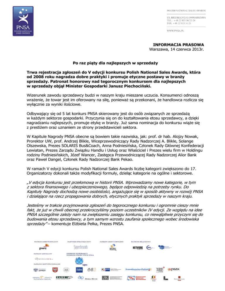 INFORMACJA PRASOWA Warszawa, 14 czerwca 2013r. Po raz piąty dla najlepszych w sprzedaży Trwa rejestracja zgłoszeń do V edycji konkursu Polish National Sales Awards, która od 2008 roku nagradza dobre praktyki i promuje etyczne postawy w branży sprzedaży. Patronat honorowy nad tegorocznym konkursem dla najlepszych w sprzedaży objął Minister Gospodarki Janusz Piechociński. Wizerunek zawodu sprzedawcy budzi w naszym kraju mieszane uczucia. Konsumenci odnoszą wrażenie, że towar jest im oferowany na siłę, ponieważ są przekonani, że handlowca rozlicza się wyłącznie za wyniki ilościowe. Odbywający się od 5 lat konkurs PNSA skierowany jest do osób związanych ze sprzedażą w każdym sektorze gospodarki. Przyczynia się on do kształtowania etosu sprzedawcy, a dzięki nagradzaniu najlepszych, promuje etykę w branży. Już sama nominacja do konkursu wiąże się z prestiżem oraz uznaniem ze strony przedstawicieli sektora. W Kapitule Nagrody PNSA obecne są bowiem takie nazwiska, jak: prof. dr hab. Alojzy Nowak, Prorektor UW, prof. Andrzej Blikle, Wiceprzewodniczący Rady Nadzorczej A. Blikle, Solange Olszewska, Prezes SOLARIS Bus&Coach, Anna Podniesińska, Członek Rady Głównej Konfederacji Lewiatan, Prezes Zarządu Związku Handlu i Usług oraz Właściciel i Prezes wielu firm w Holdingu rodziny Podniesińskich, Józef Wancer, Zastępca Przewodniczącej Rady Nadzorczej Alior Bank oraz Paweł Dangel, Członek Rady Nadzorczej Bank Pekao. W ramach V edycji konkursu Polish National Sales Awards liczbę kategorii zwiększono do 17. Organizatorzy dokonali także modyfikacji formuły, dzieląc kategorie na ogólne i sektorowe. „V edycja konkursu jest przełomową w historii PNSA. Wprowadzamy nowe kategorie, w tym z sektora finansowego i ubezpieczeniowego, będące odpowiedzią na potrzeby rynku. Do Kapituły Nagrody dochodzą nowe osobistości, angażujące się w sposób aktywny w rozwój PNSA i działające na rzecz propagowania dobrych, etycznych praktyk sprzedaży w naszym kraju. Jesteśmy w trakcie przyjmowania zgłoszeń do tegorocznego konkursu i ogromnie cieszy mnie fakt, że już w chwili obecnej przekroczyliśmy poziom uczestników IV edycji. Ze względu na idee PNSA szczególnie zależy nam na zwiększeniu zasięgu konkursu, co niewątpliwie przyczyni się do budowania etosu sprzedawcy, a tym samym wzrostu zaufania społecznego wobec środowiska sprzedaży” – komentuje Elżbieta Pełka, Prezes PNSA. Organizatorzy PNSA działają również na rzecz rozwoju edukacji w branży. W związku z tym tegoroczni zwycięzcy otrzymają także nagrody w postaci szkoleń sprzedażowych, poprowadzonych przez Brian Tracy International, Sandler Training oraz Personal Global, a przeznaczonych zarówno dla menadżerów, jak i pracowników działów sprzedaży. Zgłoszenia do konkursu przyjmowane są on-line do 31 lipca 2013 roku na stronie www.pnsa.pl Kontakt dla mediów: Agnieszka Wawrynek Junior PR Executive Kom.: (+48) 600 073 489 e-mail: [email protected] Czym jest konkurs Polish National Sales Awards? Pierwsza edycja konkursu PNSA odbyła się w 2008 roku. Konkurs został stworzony na bazie The National Sales Awards oraz British Excellence In Sales & Marketing. Inicjatorem i pomysłodawcą PNSA jest prezes Elżbieta Pełka FRSA* oraz dr Chahid Fourali. Opracowaniem przedsięwzięcia, jakim obecnie jest Polish National Sales Awards, wspólnie z Prezes Elżbietą Pełka, zajął się zespół praktyków sprzedaży z wieloletnim doświadczeniem. Nad prawidłowym przebiegiem merytorycznym konkursu czuwa firma PricewaterhouseCoopers wspomagana przez Kapitułę Sędziowską PNSA. Konkurs PNSA kierowany jest do wszystkich pracowników działów handlowych, zespołów i trenerów sprzedaży – ogółem przedstawicieli różnych szczebli sprzedaży i obsługi klienta. Proces oceny kandydatów: Etap I Ocena zgłoszeń kandydatów w systemie on-line, dokonywana przez 50 niezależnych przedstawicieli świata biznesu, nauki oraz samorządów, tworzących Komisję Sędziowską. Cel: wyłonienie maksymalnie 3 finalistów w każdej kategorii. Etap II 20-minutowe, osobiste prezentacje zgłoszeń przed pięcioosobową Komisją Sędziowską. Cel: wyłonienie laureata (ew. wskazanie osoby wyróżnionej) w każdej kategorii. Nagrody wręczone zostaną podczas uroczystej Gali PNSA w listopadzie tego roku. Nagrody: Statuetka oraz szkolenie dla laureatów Dyplom Tytuł „Ambasadora dobrych praktyk w sprzedaży” (z prawem do posługiwania się nim przez kolejnych 12 miesięcy) Certyfikat Etycznego Zarządzania Sprzedażą i Obsługą Klienta dla firmy, której pracownik znalazł się w gronie finalistów. Zaangażowanie w konkurs to nie tylko szansa na zdobycie wyjątkowej nagrody. To także możliwość uczestniczenia w prestiżowym konkursie branżowym oraz uznanie w środowisku sprzedażowym. Kategorie konkursowe: 10 KATEGORII GŁÓWNYCH: Przedstawiciel Handlowy Sprzedawca w Punkcie Sprzedaży Key Account Manager Menedżer Sprzedaży Zespół Sprzedaży Telesprzedaż Menedżer ds. Obsługi Klienta Trener Sprzedaży Innowacje w Dziedzinie Sprzedaży Sprzedaż On-Line 7 KATEGORII SEKTOROWYCH: Doradca Klienta w Banku Menedżer Zespołu Sprzedaży w Banku Agent Ubezpieczeniowy Menedżer Zespołu Sprzedaży Ubezpieczeń Sprzedawca Roku – Sprzedaż Bezpośrednia Menedżer Sprzedaży Bezpośredniej Lider Samorządowy *Elżbieta Pełka – przedsiębiorca, ekspert w procesach zarządzania marką 360 stopni. Posiada ponad dwudziestoletnie doświadczenie w szeroko rozumianej komunikacji zdobywane w Polsce i za granicą. Jest ona również założycielem polskiej edycji National Sales Awards, właścicielem Agencji reklamowej full service Pełka Creatives, członkiem profesjonalnym The Chartered Institute of Marketing oraz członkiem Royal Society of Arts, którego głównym patronem jest Królowa Elżbieta II.