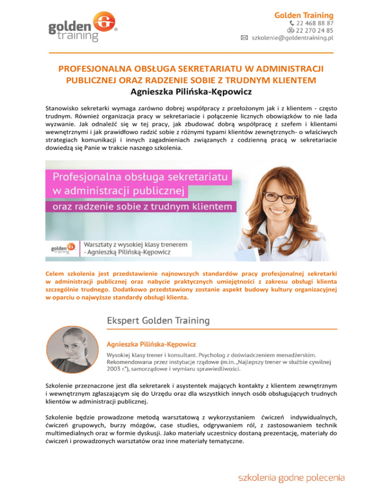 PROFESJONALNA OBSŁUGA SEKRETARIATU W ADMINISTRACJI PUBLICZNEJ ORAZ RADZENIE SOBIE Z TRUDNYM KLIENTEM Agnieszka Pilińska-Kępowicz Stanowisko sekretarki wymaga zarówno dobrej współpracy z przełożonym jak i z klientem - często trudnym. Również organizacja pracy w sekretariacie i połączenie licznych obowiązków to nie lada wyzwanie. Jak odnaleźć się w tej pracy, jak zbudować dobrą współpracę z szefem i klientami wewnętrznymi i jak prawidłowo radzić sobie z różnymi typami klientów zewnętrznych- o właściwych strategiach komunikacji i innych zagadnieniach związanych z codzienną pracą w sekretariacie dowiedzą się Panie w trakcie naszego szkolenia. Celem szkolenia jest przedstawienie najnowszych standardów pracy profesjonalnej sekretarki w administracji publicznej oraz nabycie praktycznych umiejętności z zakresu obsługi klienta szczególnie trudnego. Dodatkowo przedstawiony zostanie aspekt budowy kultury organizacyjnej w oparciu o najwyższe standardy obsługi klienta. Szkolenie przeznaczone jest dla sekretarek i asystentek mających kontakty z klientem zewnętrznym i wewnętrznym zgłaszającym się do Urzędu oraz dla wszystkich innych osób obsługujących trudnych klientów w administracji publicznej. Szkolenie będzie prowadzone metodą warsztatową z wykorzystaniem ćwiczeń indywidualnych, ćwiczeń grupowych, burzy mózgów, case studies, odgrywaniem ról, z zastosowaniem technik multimedialnych oraz w formie dyskusji. Jako materiały uczestnicy dostaną prezentację, materiały do ćwiczeń i prowadzonych warsztatów oraz inne materiały tematyczne. 09:00-09:30 Rejestracja uczestników 09:30-11:00 Szef i sekretarka – zasady współpracy: Współpraca z szefem Organizacja rozmów wewnętrznych Kiedy sekretarka wchodzi do gabinetu Samodzielność sekretarki Sekretarka i współpracownicy szefa – zasady współpracy: Miejsce sekretariatu Sekretarka jako źródło informacji Współpracownik w sekretariacie Konflikty, umiejętność radzenia sobie ze stresem 11:00-11:10 Przerwa na kawę 11:10-13:00 Organizacja pracy w sekretariacie: Podstawowe narzędzia pracy Goście dyrektora Samodzielność sekretarki Wygląd i maniery sekretarki Wyposażenie Ustawienie mebli Biblioteczka podręczna Zakres obowiązków sekretarki: Obieg korespondencji Prowadzenie rozmów telefonicznych Przekazywanie informacji oraz korespondencja elektroniczna Organizacja przyjęć, konferencji, spotkań Wyjazdy służbowe szefa Przyjmowanie delegacji zagranicznych 13:00-13:30 Przerwa na obiad 13:30-14:30 Pisma urzędowe: Struktura pisma Treść pisma Zasady pisania pism Omówienie sposobów radzenia sobie z trudnym klientem: Typy trudnych klientów, Metody radzenia sobie z trudnym klientem, Jak wykorzystać niezadowolenie klienta, Najważniejsze składniki strategii usług, Techniki budowania satysfakcji z kontaktu z klientem. Usunięcie usterek w zakresie obsługi klienta Strategia budowania lojalności. 14:30-14:40 Przerwa na kawę 14:40-15:30 Techniki komunikacji werbalnej i niewerbalnej: Omówienie podstawowych elementów komunikacji werbalnej i niewerbalnej, Efekt pierwszego wrażenia Formułowanie propozycji nastawionych na realizację potrzeb klienta Rozmowa telefoniczna, bezpośrednia, Bariery komunikacyjne, Najczęściej popełniane błędy komunikacyjne. Opracowanie strategii obsługi klienta Trzy kluczowe składniki Wprowadzenie w życie strategii Utrzymanie właściwego poziomu obsługi Co wpływa na kulturę organizacyjną Czynniki wspierające obsługę klienta Agenda jest orientacyjna i może ulec zmianie. Czas omówienia poszczególnych punktów programu zależny jest od liczby osób biorących udział w szkoleniu. Miejsce szkolenia: Centrum Szkoleniowe KOCHTEX ul. Towarowa 35, 61-896 Poznań Czas trwania szkolenia: od 9.30 do 15.30 wraz z przerwami na kawę i obiad. Koszt udziału w szkoleniu obejmuje: materiał autorski związany ze szkoleniem, długopis, certyfikat udziału w szkoleniu, przerwy kawowe pomiędzy zajęciami, obiad. Koszt udziału nie obejmuje: dojazdu do miejsca szkolenia, noclegu, parkingu. Koszt udziału za osobę: 460 zł zgłoszenia przesłane do 7 dni przed szkoleniem. 510 zł zgłoszenia przesłane na mniej niż 7 dni przed szkoleniem. WYKONAWCA NIE JEST PŁATNIKIEM VAT
