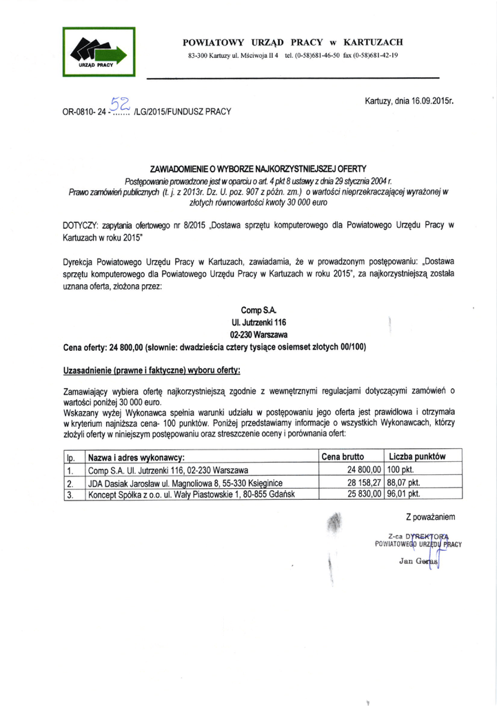 POWIATOWY URZAD 83‐ 300 0閥 840‐ 21乙 PRACY w KARTUZACH Kartu″ ul MSciwoJa l1 4 tel(058)681`6 50 fax(0‐ 58)681-42‐ 19 Kartuzy,dnia 16 09 2015r. た。2045/FUNDUSZ PRACY ZAWADOMIENIE O WYBORZE NAJKORZYSTNIE'gEJ OFERTY Podpatrarie prordzone i$w qarciu o aft. 4 fld9 ustxq z dnia N dtywnia 2$4 r. Pmnzan1**fi ytrrcztydt (t. j. z 2013r. Dz. U. poz. 907 z p62n. zm.) o wafio(;ci nieprzekraczajryejwyrazoneiw zbtych r\wnowaftoSci lrwoty 30 000 euro DOTYCZY: zapy,tania obrbrcgo nr M015 ,Dostawa spzgtu komputerowego dla Powiatowego Uzqdu Pracy w Kartuzach w roku 2015' w w prowadzonym postepowaniu: ,Dostawa spzetu komputerowego dla Powiatowego Uzgdu Pracy w Kartuzach w roku 2015', za najkorzystniejszq zostala uznana oferta, zlo2ona pEez: Dyrekcja Powiatowego Uzqdu Pracy Kartuzach, zawiadamia, 2e CompSA Ul. Jutszenki ,116 02.?30 Warczarva Cena oferty: 24 800,00 (slownie: dwadzie6cia cztery tysiqce osiemset zlotych 00/100) Uzasadnienie (orawne i faktvczne) wvboru ofertv: Zamawiajqcy wybiera ofertg najkozystniejszq zgodnie z wewnQtznymi regulacjami dotyczqcymi zam6wiei o wartoSci poni2ej 30 000 euro. Wskazany wy2ej Wykonawca spelnia warunki udzialu w postepowaniu jEo oferta jest prawidlowa i otzymala w kryterium najni2sza cena- 100 punktow. Poni2ej pzedstawiamy informacje o wszystkich Wykonawcach, ktdzy zto2yli oferty w niniejszym postgpowaniu oraz streszczenie oceny ipor6wnania ofert: lp Nazwa i adres wvkonawcy: 1 CompS A UL」 utrzenki l 16,02‐ 24800,00 230 Warszawa 100 pkt 28158,27 88,07 pkt 25830,00 96.01 pkt JDA Dasiak Jaroslaw ul, l\4aqnoliowa 8, 55-330 Ksieginice 3 Liczba punK6w Cena brufto Koncept Srdka z o o d Wtt PbS10WStte l,80‐ 855 Gdansk J Z powa2aniem Z-ca D POWiATOWE