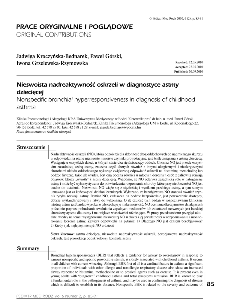 © Pediatr Med Rodz 2010, 6 (2), p. 85-91 prace oryginalne i poglądowe original contributions Jadwiga Kroczyńska-Bednarek, Paweł Górski, Iwona Grzelewska-Rzymowska Received: 12.05.2010 Accepted: 27.05.2010 Published: 30.09.2010 Nieswoista nadreaktywność oskrzeli w diagnostyce astmy dziecięcej Nonspecific bronchial hyperresponsiveness in diagnosis of childhood asthma Klinika Pneumonologii i Alergologii KPiA Uniwersytetu Medycznego w Łodzi. Kierownik: prof. dr hab. n. med. Paweł Górski Adres do korespondencji: Jadwiga Kroczyńska-Bednarek, Klinika Pneumonologii i Alergologii UM w Łodzi, ul. Kopcińskiego 22, 90-153 Łódź, tel.: 42 678 75 05, faks: 42 678 21 29, e-mail: [email protected] Praca finansowana ze środków własnych Streszczenie Nadreaktywność oskrzeli (NO), która odzwierciedla skłonność dróg oddechowych do nadmiernego skurczu w odpowiedzi na różne nieswoiste i swoiste czynniki prowokacyjne, jest ściśle związana z astmą dziecięcą. Występuje u wszystkich dzieci, u których stwierdza się świszczący oddech. Chociaż NO jest przede wszystkim zasadniczą cechą astmy, znaczna część chorych również z innymi alergicznymi i niealergicznymi chorobami układu oddechowego wykazuje zwiększoną odpowiedź oskrzeli na histaminę, metacholinę lub bodźce fizyczne, takie jak wysiłek. Jest ona obecna również u młodych dorosłych osób z całkowitą remisją objawów, którzy „wyrośli” z astmy dziecięcej. Wiadomo, że NO odgrywa zasadniczą rolę w patogenezie astmy i może być wykorzystywana do potwierdzenia rozpoznania choroby, które przy nieobecności NO jest trudne do ustalenia. Nieswoista NO wiąże się z ciężkością i wynikiem przebiegu astmy, a tym samym uznawana jest za końcowy cel działań leczniczych. Wykazano, że bezobjawowa NO stanowi również czynnik ryzyka rozwoju astmy. Pomiar NO, zwłaszcza na bodźce bezpośrednie, jest powszechnie dostępny, dobrze wystandaryzowany i łatwy do wykonania. O ile czułość tych badań w rozpoznawaniu klinicznie istotnej astmy jest bardzo wysoka, o tyle cechuje je mała swoistość. NO oceniana dla czynników działających pośrednio poprzez pobudzanie uwalniania zapalnych mediatorów lub zakończeń nerwowych jest bardziej charakterystyczna dla astmy i ma większe właściwości różnicujące. W pracy przedstawiono przegląd aktualnej wiedzy na temat występowania nieswoistej NO u dzieci i jej przydatności w rozpoznawaniu i monitorowaniu leczenia astmy. Zawiera odpowiedzi na pytania: 1) Dlaczego NO jest czasem bezobjawowa? 2) Kiedy i jak najlepiej mierzyć NO u dzieci? Słowa kluczowe: astma dziecięca, nieswoista nadreaktywność oskrzeli, bezobjawowa nadreaktywność oskrzeli, test prowokacji odoskrzelowej, kontrola astmy Summary Bronchial hyperresponsiveness (BHR) that reflects a tendency for airway to over-narrow in response to various nonspecific and specific provocative stimuli, is closely associated with childhood asthma. It occurs in all children with current wheezing. Although BHR first of all is a cardinal feature in asthma a significant proportion of individuals with other allergic and nonallergic respiratory disease also show an increased airway response to histamine, methacholine or to physical agents such as exercise. It is present even in young adults with “outgrown” childhood asthma and total symptoms remission. BHR is known to play a fundamental role in the pathogenesis of asthma, and may be used in confirming the diagnosis of disease which is difficult to establish in its absence. Nonspecific BHR is related to the severity and outcome of Pediatr Med rodz Vol 6 Numer 2, p. 85-91 85 prace oryginalne i poglĄdowe/original contributions asthma, and thus is being recognized as a clinical endpoint for therapeutic intervention. Asymptomatic BHR is shown to be also a risk factor in the development of asthma. BHR measurement, especially to direct stimuli is widely available, well-standardized and easy to perform. The sensitivity of these tests in the diagnosis of clinically significant asthma is excellent, but they are characterized by low specificity. When assessed for agents that act indirectly by stimulating the release of inflammatory mediators or by neural pathways BHR is more specific for asthma and has bigger discriminative properties. The paper presents an overview on current knowledge of the nonspecific BHR prevalence in children and its usefulness to diagnose and monitor of treatment in childhood asthma. It include the answers on questions: 1) Why BHR is sometimes asymptomatic? 2) When and how best to measure BHR in children? Key words: childhood asthma, nonspecific bronchial hyperresponsiveness, asymptomatic bronchial hyperresponsiveness, bronchial challenge test, asthma control CZY NADREAKTYWNOŚĆ OSKRZELI JEST CZĘSTA W POPULACJI DZIECIĘCEJ? N 86 adreaktywność oskrzeli (NO), charakterystyczna cecha astmy, w której oskrzela odpowiadają zbyt mocno i łatwo na czynniki kurczące, należy do najczęstszych nieprawidłowości układu oddechowego. Tę nadmierną skłonność do zwężania się oskrzeli według definicji Busheya i wsp.(1) można obserwować po zadziałaniu bodźcami immunologicznymi (nadreaktywność swoista) lub nieimmunologicznymi (nadreaktywność nieswoista). Nieswoista NO łączy się ze zmienną obturacją oskrzeli w odpowiedzi na stymulację czynnikami fizycznymi, chemicznymi czy farmakologicznymi i zwiększonymi dobowymi wahaniami przepływu wydechowego. W populacji ogólnej zależnie od zastosowanego kryterium rozpoznania częstość NO waha się od 4 do 35%(2). Paoletti i wsp.(3), przyjmując w teście prowokacji metacholiną 10%, 15% i 20% obniżenie wskaźnika natężonej objętości wydechowej pierwszosekundowej (forced expiratory volume in the 1st second, FEV1) za wartości diagnostyczne, stwierdzili NO odpowiednio u nawet 55%, 39% i 26% losowo dobranych osób w wieku 8-73 lat. Według Trigga i wsp.(4) cecha ta dotyczy nie więcej 