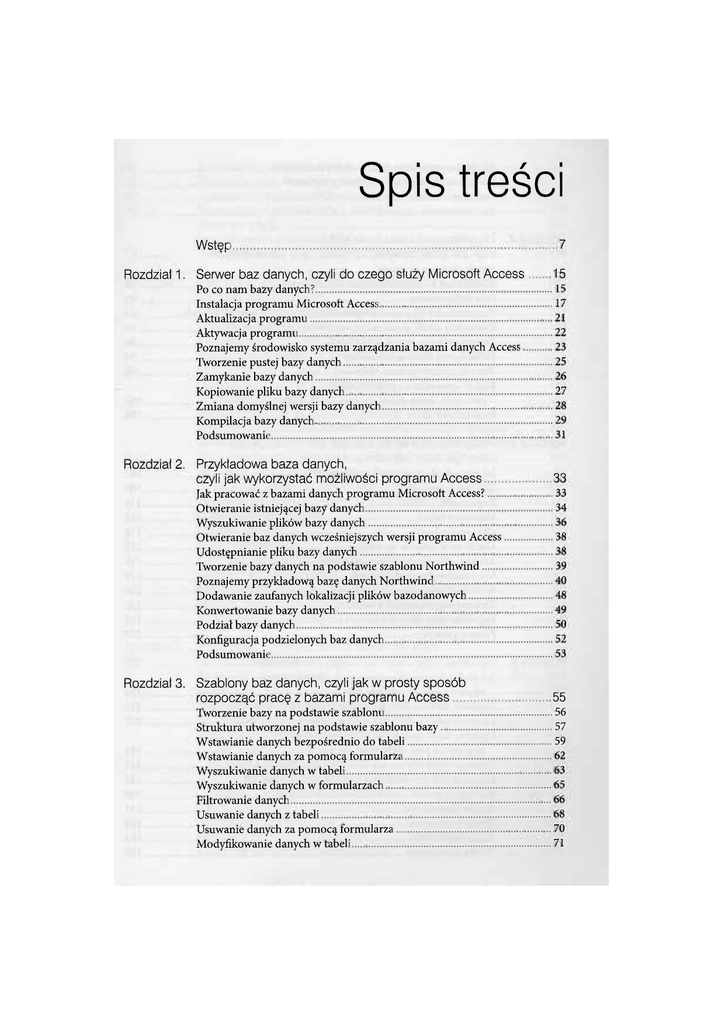 Spis treści Wstęp 7 Rozdziat 1. Serwer baz danych, czyli do czego stuży Microsoft Access Po co nam bazy danych? Instalacja programu Microsoft Access Aktualizacja programu Aktywacja programu Poznajemy środowisko systemu zarządzania bazami danych Access Tworzenie pustej bazy danych Zamykanie bazy danych Kopiowanie pliku bazy danych Zmiana domyślnej wersji bazy danych Kompilacja bazy danych Podsumowanie 15 15 17 21 22 23 25 26 27 28 29 31 Rozdziat 2. Przykładowa baza danych, czyli jak wykorzystać możliwości programu Access Jak pracować z bazami danych programu Microsoft Access? Otwieranie istniejącej bazy danych Wyszukiwanie plików bazy danych Otwieranie baz danych wcześniejszych wersji programu Access Udostępnianie pliku bazy danych Tworzenie bazy danych na podstawie szablonu Northwind Poznajemy przykładową bazę danych Northwind Dodawanie zaufanych lokalizacji plików bazodanowych Konwertowanie bazy danych Podział bazy danych Konfiguracja podzielonych baz danych Podsumowanie 33 33 34 36 38 38 39 40 48 49 50 52 53 Rozdziat 3. Szablony baz danych, czyli jak w prosty sposób rozpocząć pracę z bazami programu Access Tworzenie bazy na podstawie szablonu Struktura utworzonej na podstawie szablonu bazy Wstawianie danych bezpośrednio do tabeli Wstawianie danych za pomocą formularza Wyszukiwanie danych w tabeli Wyszukiwanie danych w formularzach Filtrowanie danych Usuwanie danych z tabeli Usuwanie danych za pomocą formularza Modyfikowanie danych w tabeli 55 56 57 59 62 63 65 66 68 70 71 Modyfikowanie danych za pomocą formularza Prezentowanie danych za pomocą raportów Szablony baz sieci Web Podsumowanie Rozdziat 4. Projektowanie i tworzenie tabel, czyli jak przechowywać informacje w bazie danych Jak zbudowane są tabele? Szybki start — określamy dane elementarne Pola obliczeniowe Tworzymy tabelę poprzez wprowadzanie przykładowych danych Tworzymy tabelę poprzez import zewnętrznych danych Tworzenie tabel w widoku projektu Definiujemy klucz podstawowy Typy danych programu Microsoft Access Reguły sprawdzania poprawności (warunki, które muszą spełniać dane zapisane w tabeli) Podsumowanie Rozdziat 5. Modyfikowanie tabel, czyli jak zmienić strukturę obiektów bazy danych Jak zarządzać obiektami bazy danych? Zmiana nazwy tabeli Kopiowanie tabeli Usuwanie tabeli Ukrywanie tabeli Dodawanie kolumn do tabeli Zmiana definicji istniejącej kolumny Usuwanie wybranych kolumn Automatyczne wprowadzanie zmian w powiązanych obiektach Eksportowanie danych z tabeli Importowanie danych z innych programów Podsumowanie Rozdział 6. Łączenie tabel, czyli do czego stużą relacje Jak podzielić przechowywane w bazie informacje między odpowiednie tabele? Łączenie tabel za pomocą związku typu jeden do jednego Łączenie tabel za pomocą związku typu jeden do wielu Łączenie tabel związkiem typu wiele do wielu za pomocą pola wielowartościowego Łączenie tabel za pomocą związku typu wiele do wielu Diagram E/R przykładowej bazy danych Northwind Tworzymy projekt przykładowej bazy danych Tabele słownikowe Tabele podrzędne Tabela nadrzędna Tabela łącznikowa 71 72 73 73 75 75 76 81 83 85 86 94 96 102 106 107 107 108 111 113 114 115 116 119 120 121 122 127 129 129 131 137 141 143 147 149 151 152 153 155 Korzystanie z tabeli łącznikowej Określamy więzy integralności (spójności) danych zapisanych w połączonych tabelach Wprowadzanie przykładowych danych Usuwanie relacji Modyfikowanie połączonych tabel Podsumowanie Rozdział 7. Kwerendy, czyli jak zautomatyzować pracę z danymi Do czego służą kwerendy? Pobieranie wszystkich danych z tabeli Wybieranie kolumn z tabeli Modyfikowanie pobieranych danych Porządkowanie pobranych danych Sortowanie danych Ograniczanie liczby zwracanych wierszy . Wyszukiwanie duplikatów '. Wybieranie danych na podstawie prostego warunku logicznego Wybieranie danych na podstawie złożonego warunku logicznego Zwracanie danych z dwóch połączonych tabel za pomocą kreatora Zwracanie danych z wielu połączonych tabel Zwracanie danych z tabel połączonych za pośrednictwem pól wielowartościowych Zwracanie niepasujących wierszy z połączonych tabel Dodawanie podsumowań Zliczanie danych Grupowanie danych Kwerendy krzyżowe Usuwanie wybranych danych Dodawanie danych Modyfikowanie wybranych danych Podsumowanie Rozdział 8. Formularze, czyli jak ułatwić użytkownikom dostęp do danych Po co tworzyć formularze? Szybki start z gotowymi częściami aplikacji Tworzymy autoformularz związany z wybraną tabelą Budowa formularzy powiązanych z tabelami Wyszukujemy,filtrujemy i usuwamy dane Kreator formularzy — tworzymy formularz związany z wybraną tabelą Kreator formularzy — tworzymy formularz związany z połączonymi tabelami Poznajemy motywy i formularze nawigacyjne Zmiana definicji formularza Formularz do przeglądania danych Tworzymy formularz z podformularzem 157 159 162 164 167 168 169 169 171 173 174 178 180 181 182 185 187 188 189 191 193 195 196 198 199 202 203 205 206 207 207 208 211 214 216 218 220 221 223 228 229 Korzystanie z formularza z podformularzem Panel przełączania jako przykład formularza niezwiązanego z żadną tabelą użytkownika Poznajemy zależności pomiędzy obiektami bazy danych Podsumowanie Rozdział 9. Raporty, czyli jak zaprezentować dane Do czego służą raporty? Instalacja drukarki w systemie Windows 7 Tworzymy autoraport Kreator raportów — tworzymy raport powiązany z wybraną tabelą Kreator raportów — tworzymy raport powiązany z wieloma tabelami Kreator raportów — tworzymy raport powiązany z kwerendą Tworzymy raport zawierający podsumowania Raport grupujący dane Dodawanie podsumowań do raportów grupujących dane Dodatkowy poziom grupowania danych Wizualizacje i formatowanie warunkowe Tworzeniefiltrów ograniczających prezentowane dane Podsumowanie Rozdział 10. Makra, czyli jak zautomatyzować regularnie wykonywane operacje Jak zautomatyzować pracę użytkownika z
