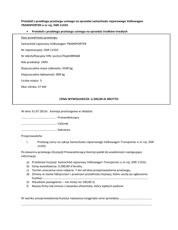 Protokół z przebiegu przetargu ustnego na sprzedaż samochodu ciężarowego Volkswagen TRANSPORTER o nr rej. DSR 11555 Protokół z przebiegu przetargu ustnego na sprzedaż środków trwałych Opis przedmiotu przetargu: Samochód ciężarowy Volkswagen TRANSPORTER Nr rejestracyjny: DSR 11555 Nr identyfikacyjny VIN: wv2zzz70zph089468 Rok produkcji: 1993 Dopuszczalna masa całkowita: 2590 kg Dopuszczalna ładowność: 909 kg Liczba miejsc: 5 Moc silnika: 57 kW CENA WYWOŁAWCZA: 3.200,00 ZŁ BRUTTO W dniu 31.07.2015r. komisja przetargowa w składzie: ……………………………………….- Przewodniczący ……………………………………….- Członek ……………………………………….- Sekretarz Przeprowadziła: I. Przetarg ustny na zakup Samochodu ciężarowego Volkswagen Transporter o nr rej. DSR 11555. Po otwarciu przetargu (licytacji) Przewodniczący Komisji podał do wiadomości następujące informacje: a) b) c) d) Przedmiot licytacji: Samochód ciężarowy Volkswagen Transporter o nr rej. DSR 11555, Cenę wywoławcza: 3.200,00 zł brutto, Termin uiszczenia ceny nabycia: 7 dni od dnia przeprowadzenia przetargu, Zmiany w stanie faktycznym i prawnym przedmiotu licytacji, które zaszły po ogłoszeniu licytacji………………………………………………………………………………………………………………………….. e) Wysokość postąpienia – nie mniej niż 100,00 zł, f) Nazwa firmy lub imiona i nazwiska oferentów, który wpłacili wadium W wyniku przeprowadzonej licytacji najwyższa osiągnięta cena sprzedaży…………………………………….. ……………………………………………………………………………………………………………………………………………………….. Nabywcą……………………………………………………………………………………………………………………………………………… …………………………………………………………………………………………………………………………………………………………. ………………………………………………………………………………………………………………………………………………………….. Na tym protokół zakończono i po odczytaniu podpisano. Komisja przetargowa w składzie: ……………………………………….- Przewodniczący ……………………………………….- Członek ……………………………………….- Sekretarz Nabywca: 1 …………………………………………………..