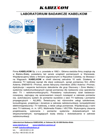 ____________________________________________________________________________ LABORATORIUM BADAWCZE KABELKOM Firma KABELKOM Sp. z o.o. powstała w 1992 r. Główna siedziba firmy znajduje się w Bielsku-Białej, posiadamy też serwis urządzeń pomiarowych w Warszawie. Współpracujemy blisko z firmami zagranicznymi w Republice Czeskiej, na Słowacji i na Węgrzech. KABELKOM w chwili obecnej zatrudnia 10 osób. Działamy w obszarze TV kablowej (sprzęt dla stacji czołowych, sprzęt pomiarowy firm JDSU Acterna, ENENSYS i Promax, serwis fabryczny mierników JDSU Acterna i Promax, dystrybucja i wsparcie techniczne dekoderów dla grup Discovery i Zone Media) i systemów radiokomunikacyjnych (sprzęt pomiarowy dla nadawców oraz operatorów sieci TV i radiokomunikacyjnych). Posiadamy rozbudowany dział badawczorozwojowy, zajmujący się opracowaniem nowych rozwiązań w zakresie pomiarów (np. automatyczny system do pomiarów wycieków z sieci TV kablowej i pomiarów propagacyjnych – A(L)MS). Świadczymy też różnorodne usługi szkoleniowe, konsultingowe, projektowe i doradcze w zakresie radiokomunikacji, kompatybilności elektromagnetycznej i TV kablowej, a także usługi pomiarowe. Współpracują z nami sieci TV kablowej, m. in. UPC, Multimedia Polska i VECTRA. Wykonujemy zlecenia projektowania, wykonania i pomiarów systemów doświadczalnych lub eksperymentalnych, wymagających dużej wiedzy i doświadczenia w zakresie radiokomunikacji. __________________________________________________________________________________ Laboratorium Badawcze KABELKOM, ul. Bukowa 30, 43-300 Bielsko-Biała www.kabelkom.pl www.kabelkom-pomiary.pl e-mail: [email protected] tel.: +48 33 819 11 43 tel./fax: +48 33 821 35 38 ____________________________________________________________________________ W maju 2007 r. w strukturze firmy zostało wyodrębnione Laboratorium Badawcze KABELKOM, którego głównym zadaniem jest świadczenie usług pomiarowych. Usługi te firma wykonuje od dawna. Powstanie Laboratorium Badawczego KABELKOM było konsekwencją wzrostu zapotrzebowania na pomiary systemów radiokomunikacyjnych i sieci TV kablowej w zakresie kompatybilności elektromagnetycznej, wynikającego z gwałtownego rozwoju tych dziedzin w Polsce i zmian w prawie. Pomiary pozwalają określić rzeczywisty, a nie symulowany zasięg nadajników, i w ten sposób zweryfikować jakość systemu. Mogą też służyć do korekcji modeli propagacyjnych wykorzystywanych do obliczeń propagacyjnych. Akredytowane Laboratorium Badawcze KABELKOM wykonuje następujące pomiary: 1) stacjonarne i mobilne pomiary wycieków energii elektromagnetycznej z sieci TV kablowej (w oparciu o normę PN-EN 50083-8), 2) pomiary propagacyjne – określenie zasięgów nadajników radiokomunikacyjnych (m. in. DVB-T/H, FM, TETRA, P.25, LTE, WiMAX, Wi-Fi) w zakresie częstotliwości od 100 kHz do 6 GHz w oparciu o: - pomiar natężenia pola elektrycznego – pomiar metodą stacjonarną zgodnie z Zaleceniem ITU-R SM.378-7 i SM.1875 lub metodą mobilną zgodnie z Zaleceniem ITU-R SM.1708, SM.1875 i zaleceniem CEPT ERC/REC (00)08, wykonujemy też pomiary piesze na ulicach i wewnątrz budynków (mieszkania, biura) - pomiar parametru właściwego dla danego systemu radiokomunikacyjnego (np. MER lub BER) metodą stacjonarną, mobilną lub pieszą (ulice, mieszkania, biura). __________________________________________________________________________________ Laboratorium Badawcze KABELKOM, ul. Bukowa 30, 43-300 Bielsko-Biała www.kabelkom.pl www.kabelkom-pomiary.pl e-mail: [email protected] tel.: +48 33 819 11 43 tel./fax: +48 33 821 35 38 ____________________________________________________________________________ Wyniki propagacyjnych pomiarów mobilnych nadajnika UKF-FM naniesione na zasięg symulowany Akredytowane Laboratorium Badawcze KABELKOM wdrożyło w styczniu 2008 r. system zarządzania jakością w oparciu o normę PN-EN ISO/IEC 17025. W październiku 2009 r. przeszliśmy pomyślnie audyt Polskiego Centrum Akredytacji, potwierdzający nasze kompetencje oraz biegłość pomiarową. Posiadamy certyfikat akredytacji PCA nr AB 1149 (zakres akredytacji dostępny jest na stronie www.pca.gov.pl). Jesteśmy jedynym laboratorium akredytowanym w Polsce i prawdopodobnie w Europie wykonującym pomiary propagacyjne nadajników radiokomunikacyjnych. Do tej pory z naszych usług pomiarowych skorzystało wiele firm, m.in. : MOTOROLA TP EmiTel AGORA S.A. Polski Operator Telewizyjny (Polsat i TVN) Instytut Łączności o. Wrocław UPC Multimedia Polska SFERANET VALEO TELE-COM Sp. z o.o. a nasze pomiary wykonywaliśmy we Francji, Portugalii, Hiszpanii, Austrii, Szwajcarii, Holandii, Irlandii, Niemczech, Norwegii, Słowenii, Republice Czeskiej, na Słowacji, Węgrzech, Litwie i Łotwie. __________________________________________________________________________________ Laboratorium Badawcze KABELKOM, ul. Bukowa 30, 43-300 Bielsko-Biała www.kabelkom.pl www.kabelkom-pomiary.pl e-mail: [email protected] tel.: +48 33 819 11 43 tel./fax: +48 33 821 35 38 ____________________________________________________________________________ Wyniki pomiarów stacjonarnych jakości odbioru DVB-T Współpracujemy z uczelniami technicznymi, instytutami badawczymi oraz firmami zajmującymi się projektowaniem, uruchamianiem i pomiarami systemów radiokomunikacyjnych. Dysponujemy wysoko wykwalifikowaną kadrą, posiadającą doświadczenie zarówno przy pomiarach, jak i projektowaniu oraz uruchamianiu systemów radiokomunikacyjnych i sieci TV kablowej. Na podstawie pomiarów jesteśmy w stanie sformułować wnioski i interpretacje, mogące pomóc w projektowaniu lub optymalizacji pracy mierzonych systemów radiokomunikacyjnych. Dysponujemy dwoma pojazdami specjalistycznymi z masztem 10 m, które mogą być też użyte do pomiarów mobilnych. W naszej pracy korzystamy z nowoczesnego sprzętu pomiarowego, ponadto posiadamy dostęp do specjalistycznego oprogramowania służącego do oblic